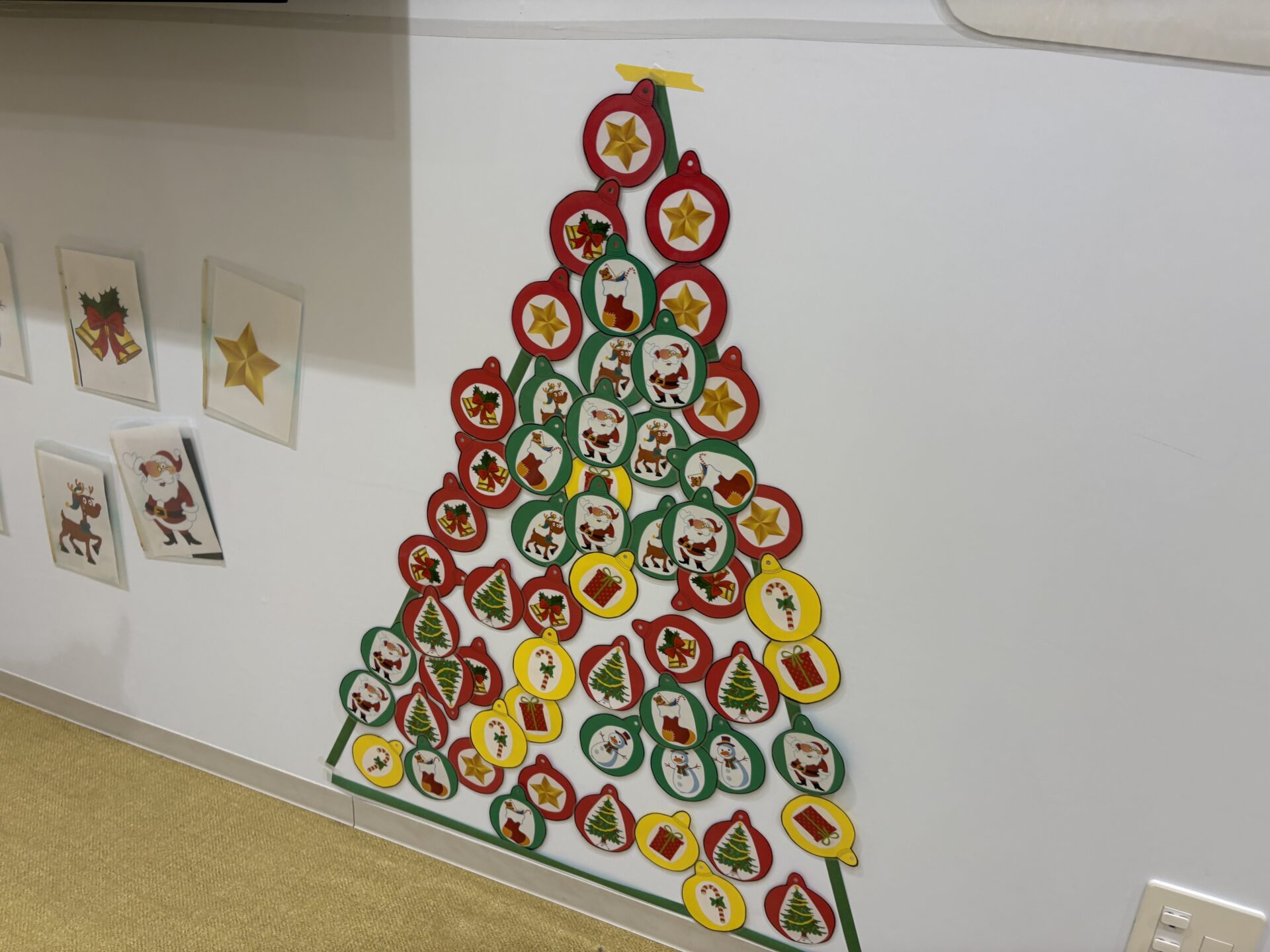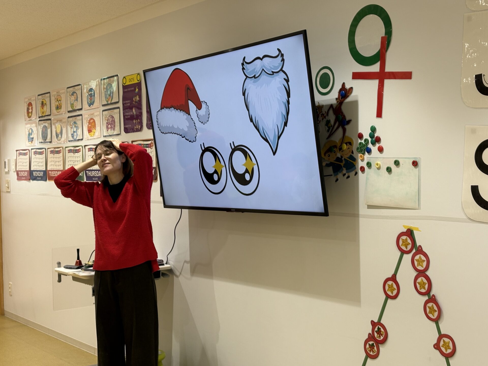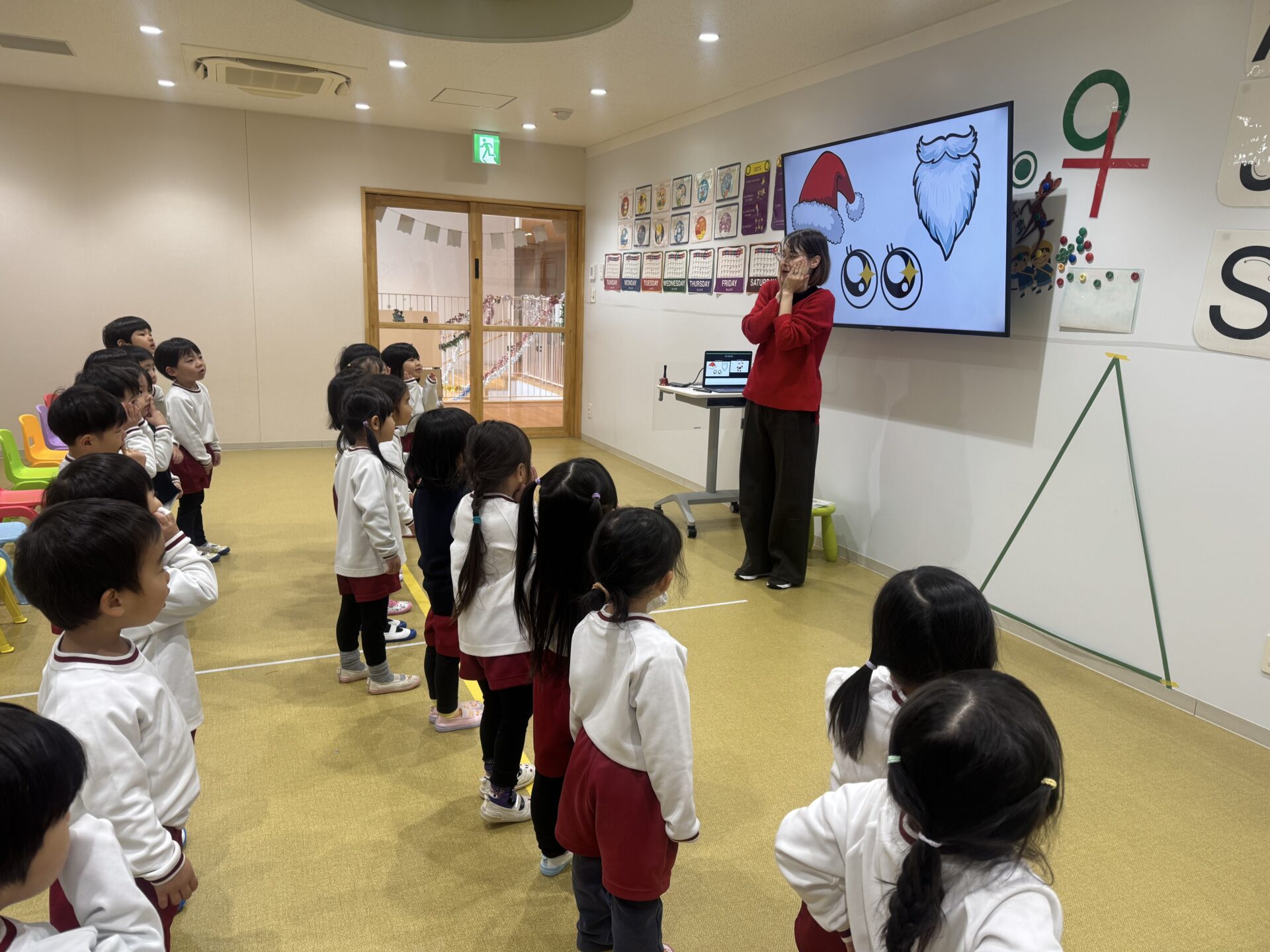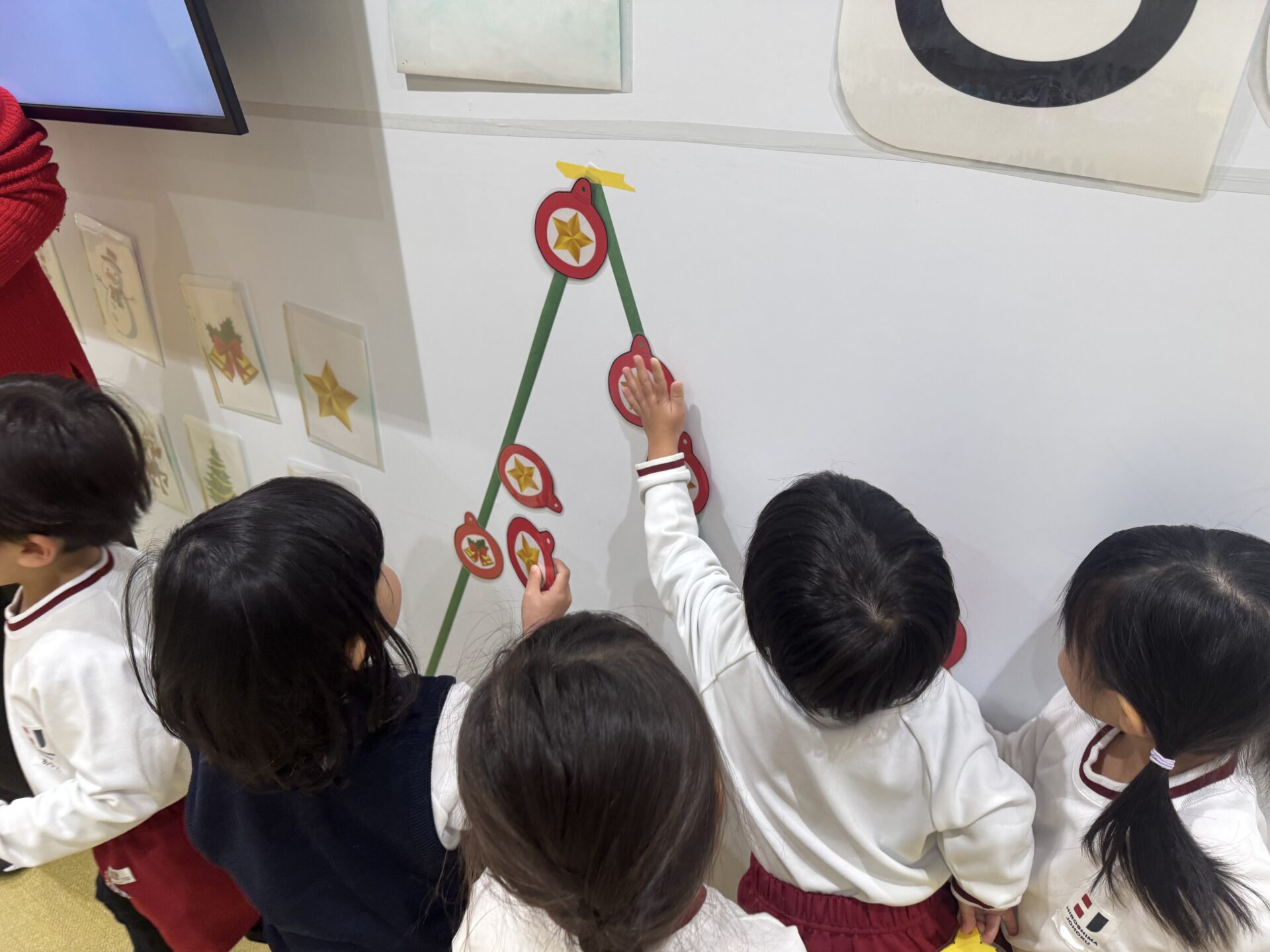 まずは「S-A-N-T-A」の歌を歌いながら、赤いぼうし・白いひげ・きらきらおめめのサンタさんになりきって楽しみました。そのあとは、いよいよクリスマスツリーのかざりつけです! みんなに2つずつオーナメントが配られ、ツリーをかわいく飾りました。