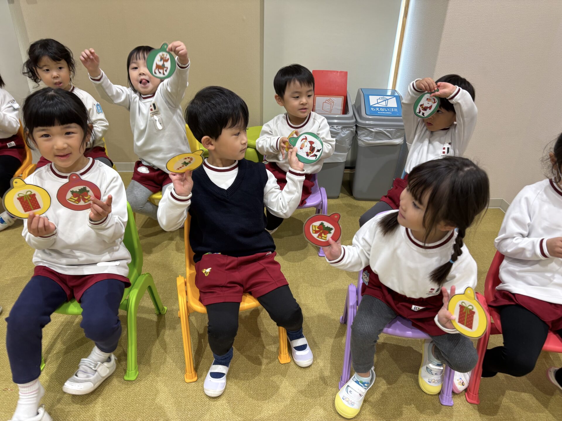 今月、年少さんは サンタ🎅🏼・トナカイ🦌・プレゼント🎁・クリスマスツリー🎄・ツリー飾り・雪だるま⛄️・キャンディー・靴下🧦・星⭐️・鈴🔔 など、たくさんのクリスマスの英語にふれてきました。