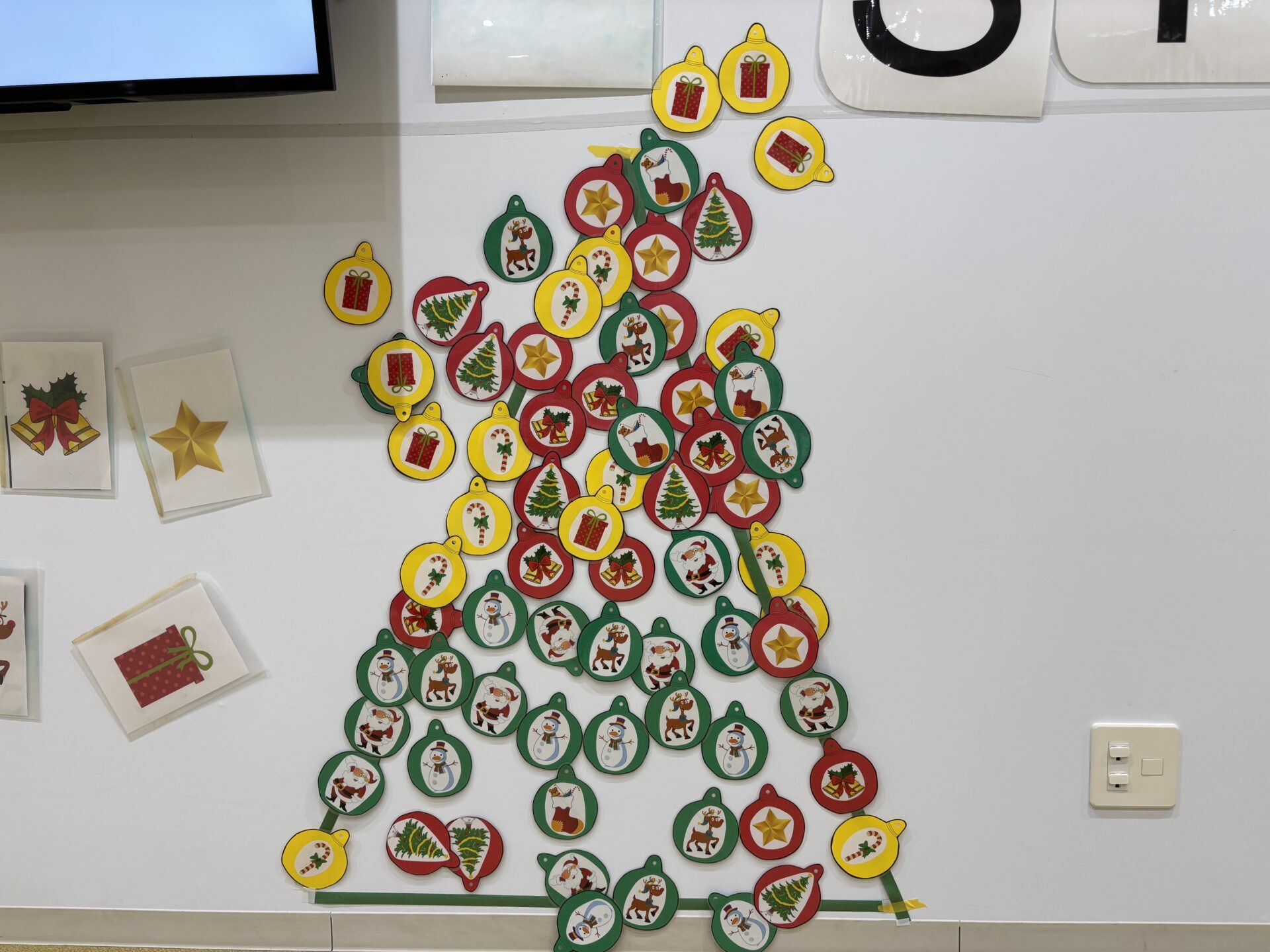 オーナメントが配られると、あちこちで笑顔がいっぱい! クリスマスへのワクワクがどんどん高まっていきました。クラスごとに、それぞれ個性あふれる素敵なクリスマスツリーが完成し、さまざまなアイテムの名前を英語で声に出して楽しみました。