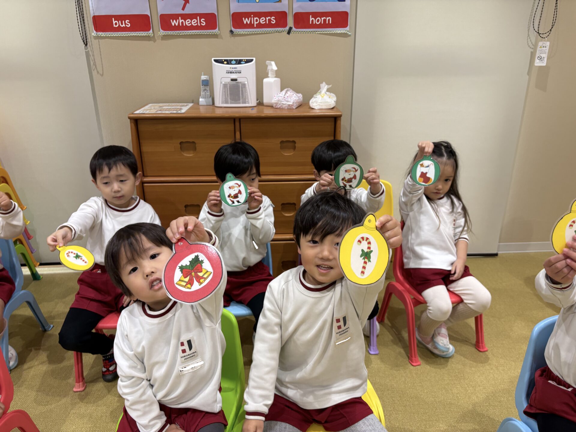 今月、年少さんは サンタ🎅🏼・トナカイ🦌・プレゼント🎁・クリスマスツリー🎄・ツリー飾り・雪だるま⛄️・キャンディー・靴下🧦・星⭐️・鈴🔔 など、たくさんのクリスマスの英語にふれてきました。