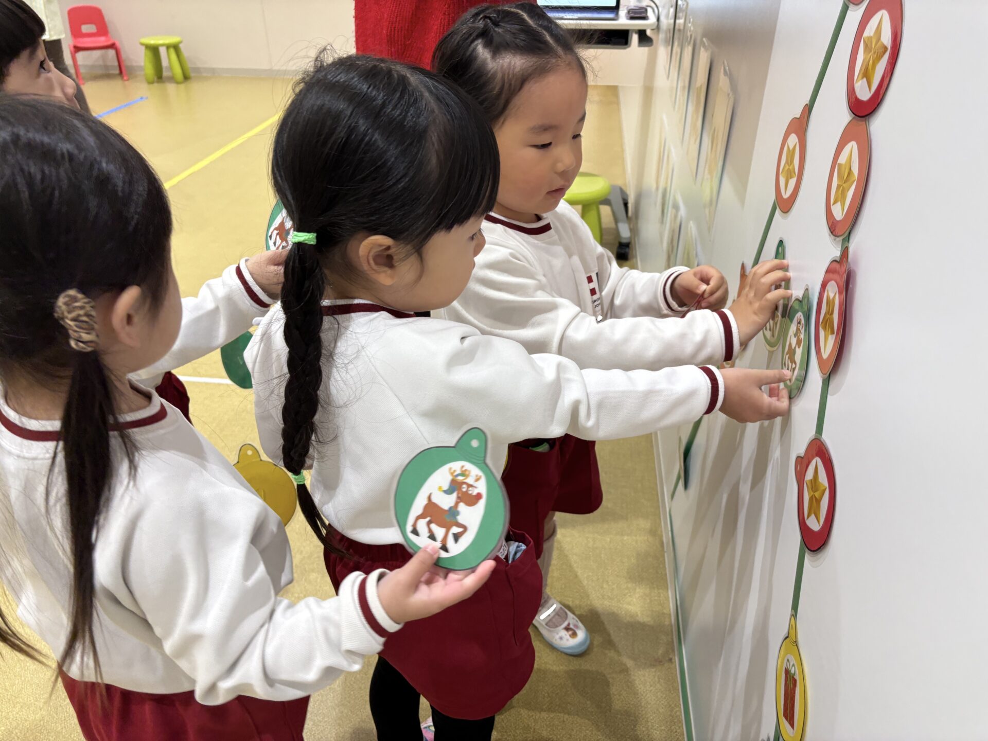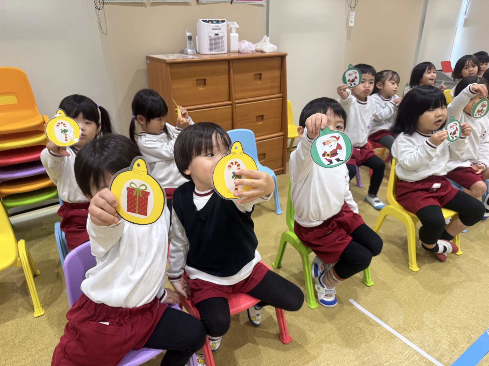 まずは「S-A-N-T-A」の歌を歌いながら、赤いぼうし・白いひげ・きらきらおめめのサンタさんになりきって楽しみました。そのあとは、いよいよクリスマスツリーのかざりつけです! みんなに2つずつオーナメントが配られ、ツリーをかわいく飾りました。