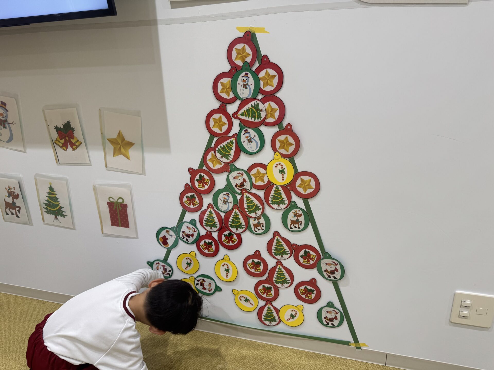 オーナメントが配られると、あちこちで笑顔がいっぱい! クリスマスへのワクワクがどんどん高まっていきました。クラスごとに、それぞれ個性あふれる素敵なクリスマスツリーが完成し、さまざまなアイテムの名前を英語で声に出して楽しみました。