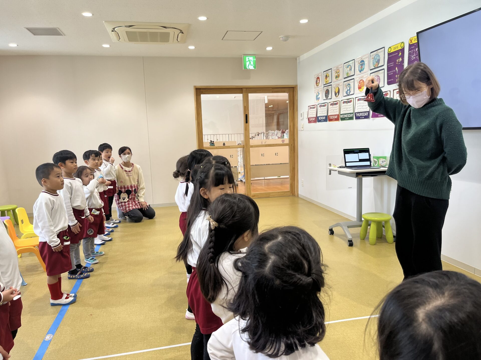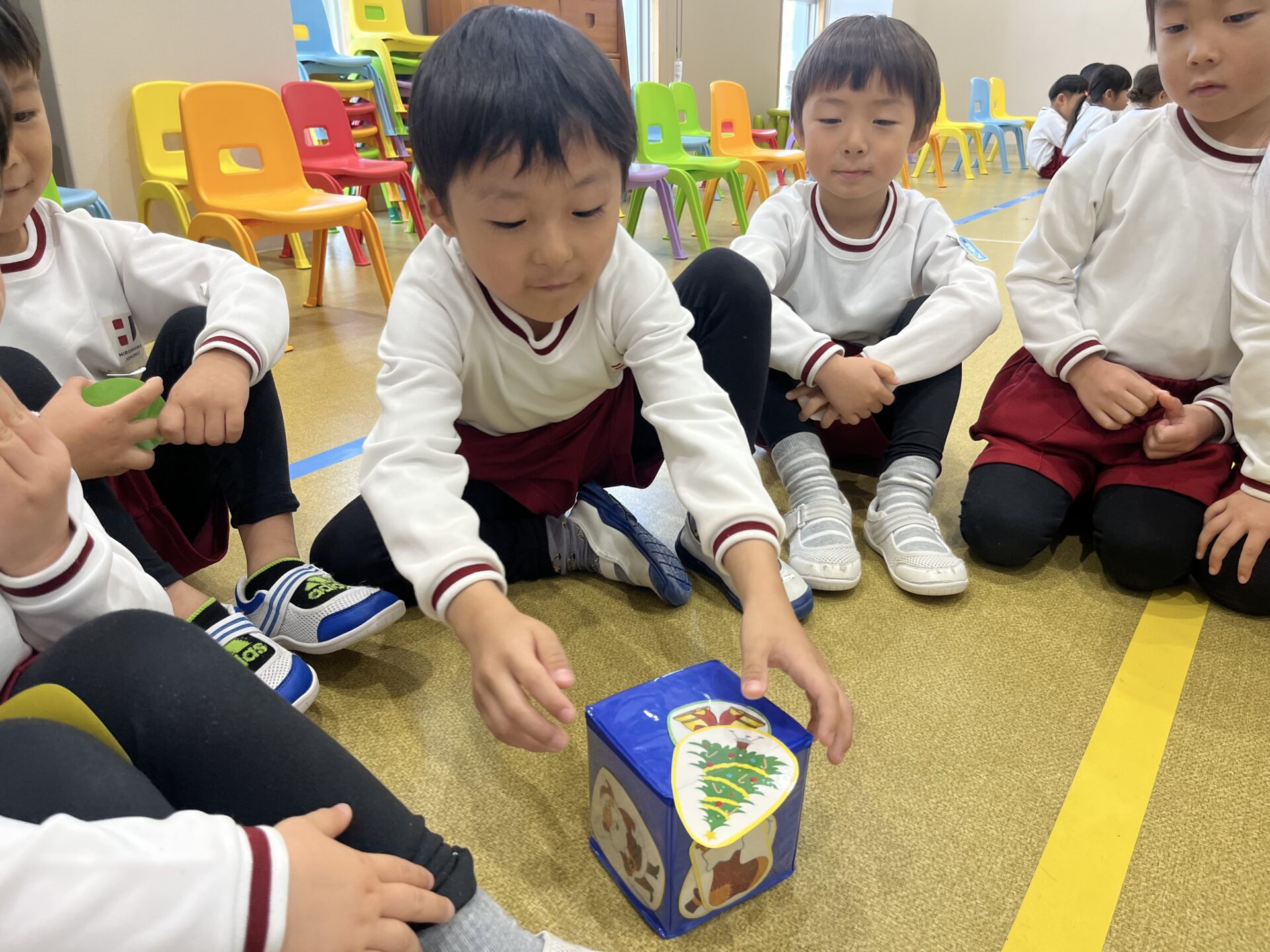 速く、ゆっくり、高く、低くとベルを鳴らしたあとは、ジェスチャーゲームで単語を覚えていきました。そのあとはクリスマスバージョンのホットポテトをして、とても楽しい時間を過ごしました!クリスマスの音楽が流れる中🎶、みんなでサイコロを回して🎲、音楽が止まったときにサイコロを持っていたお友だちがサイコロを振ってクリスマスアイテムをゲット!
