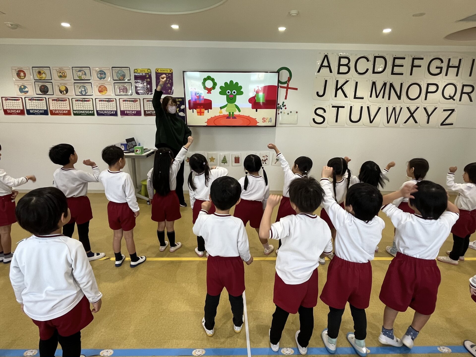 速く、ゆっくり、高く、低くとベルを鳴らしたあとは、ジェスチャーゲームで単語を覚えていきました。そのあとはクリスマスバージョンのホットポテトをして、とても楽しい時間を過ごしました!クリスマスの音楽が流れる中🎶、みんなでサイコロを回して🎲、音楽が止まったときにサイコロを持っていたお友だちがサイコロを振ってクリスマスアイテムをゲット!