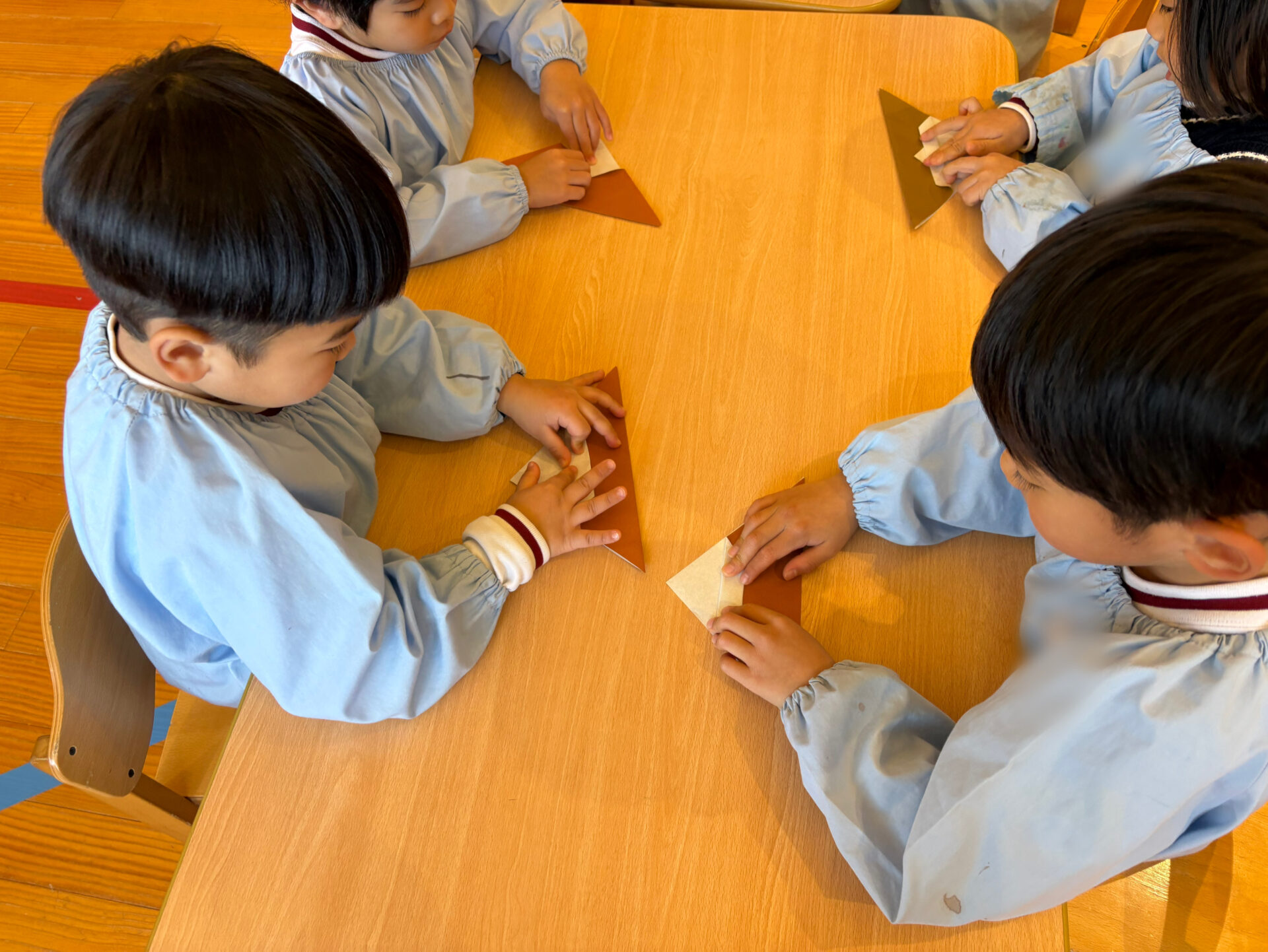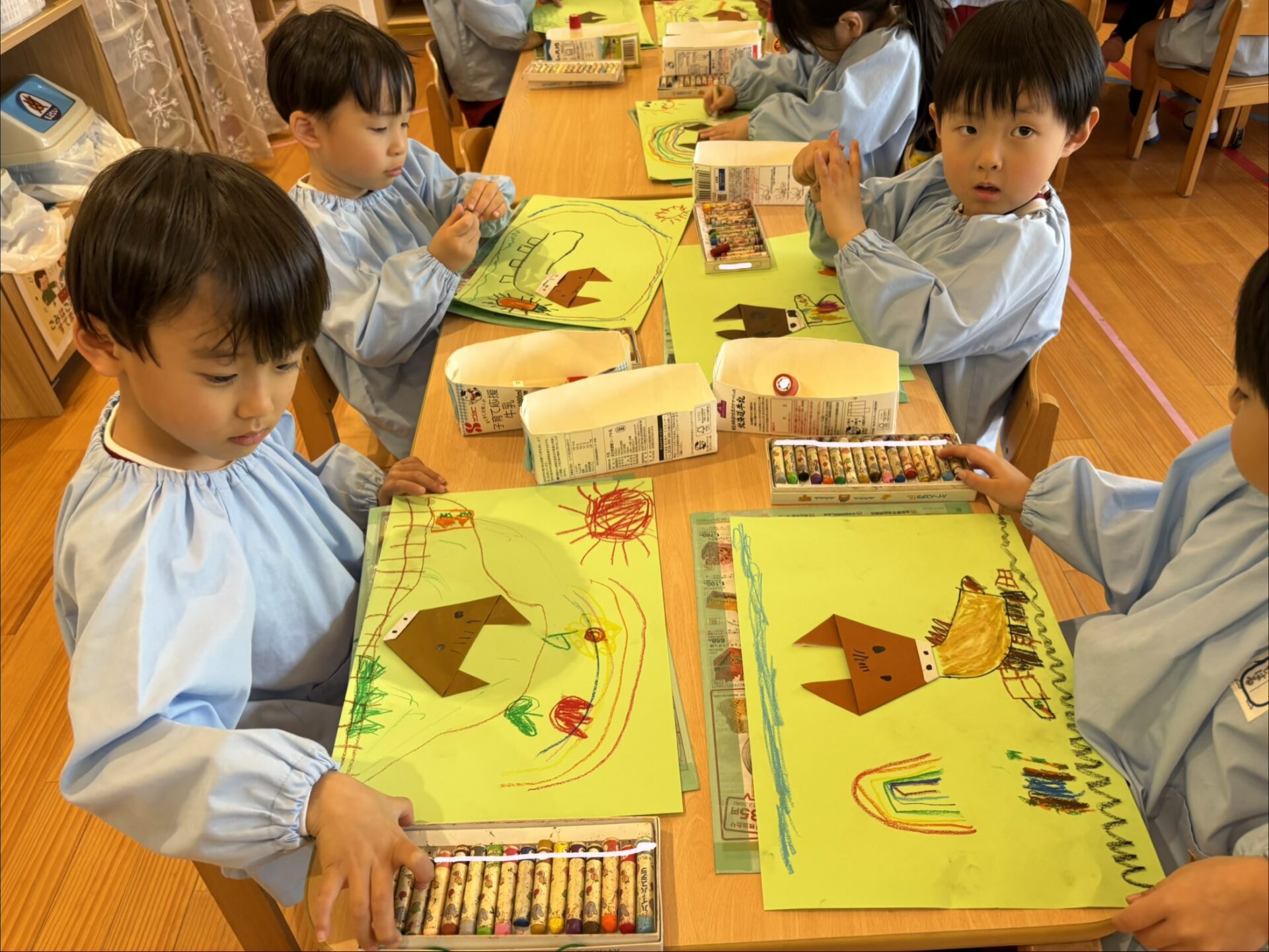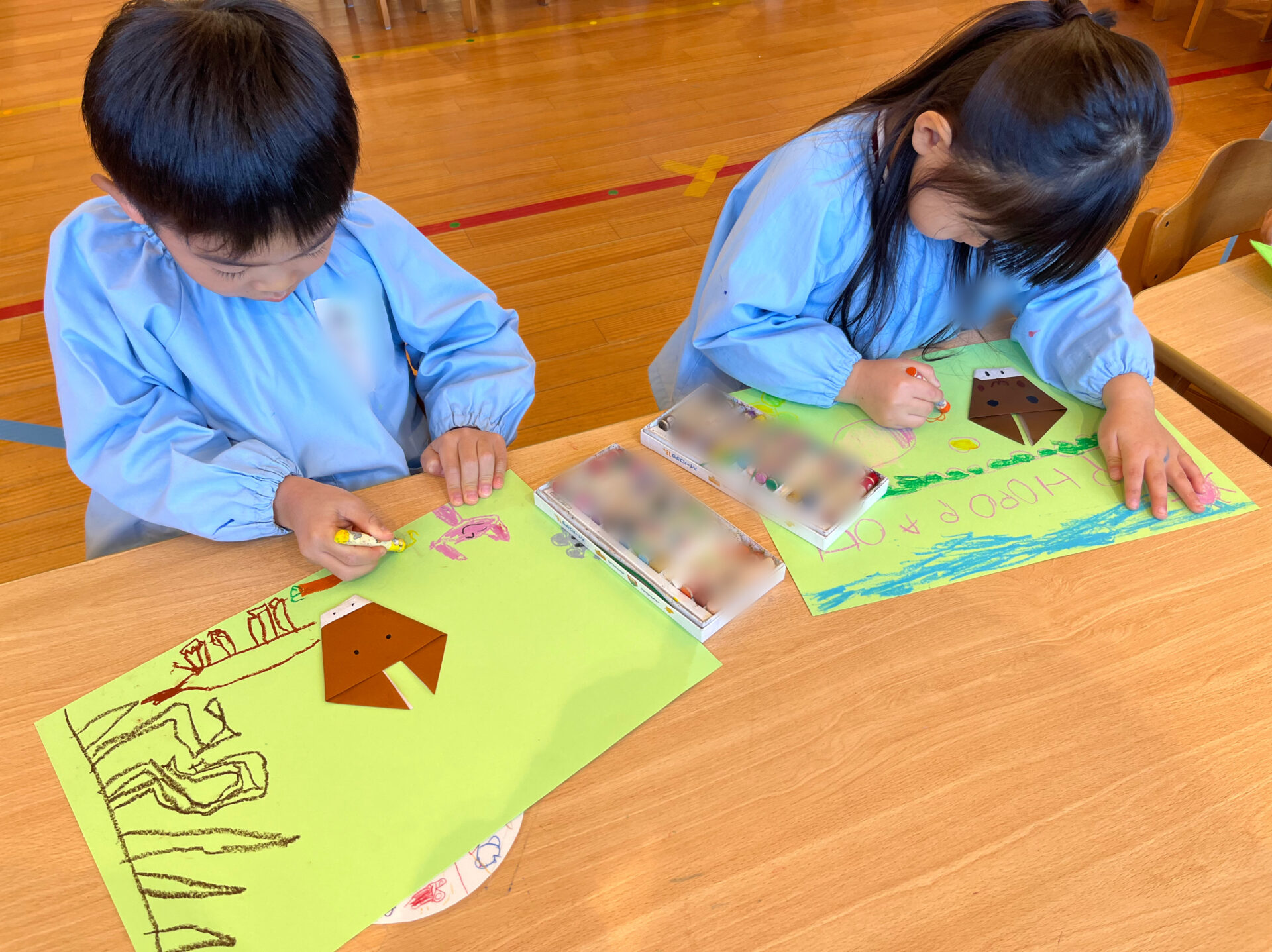 干支の「🐎午」を折り紙で作りました。折り方をよく見ながら、一つひとつ丁寧に折る姿が見られました。完成した後は、クレパスでまわりを自由に描き、それぞれの思いが詰まった作品になりました。