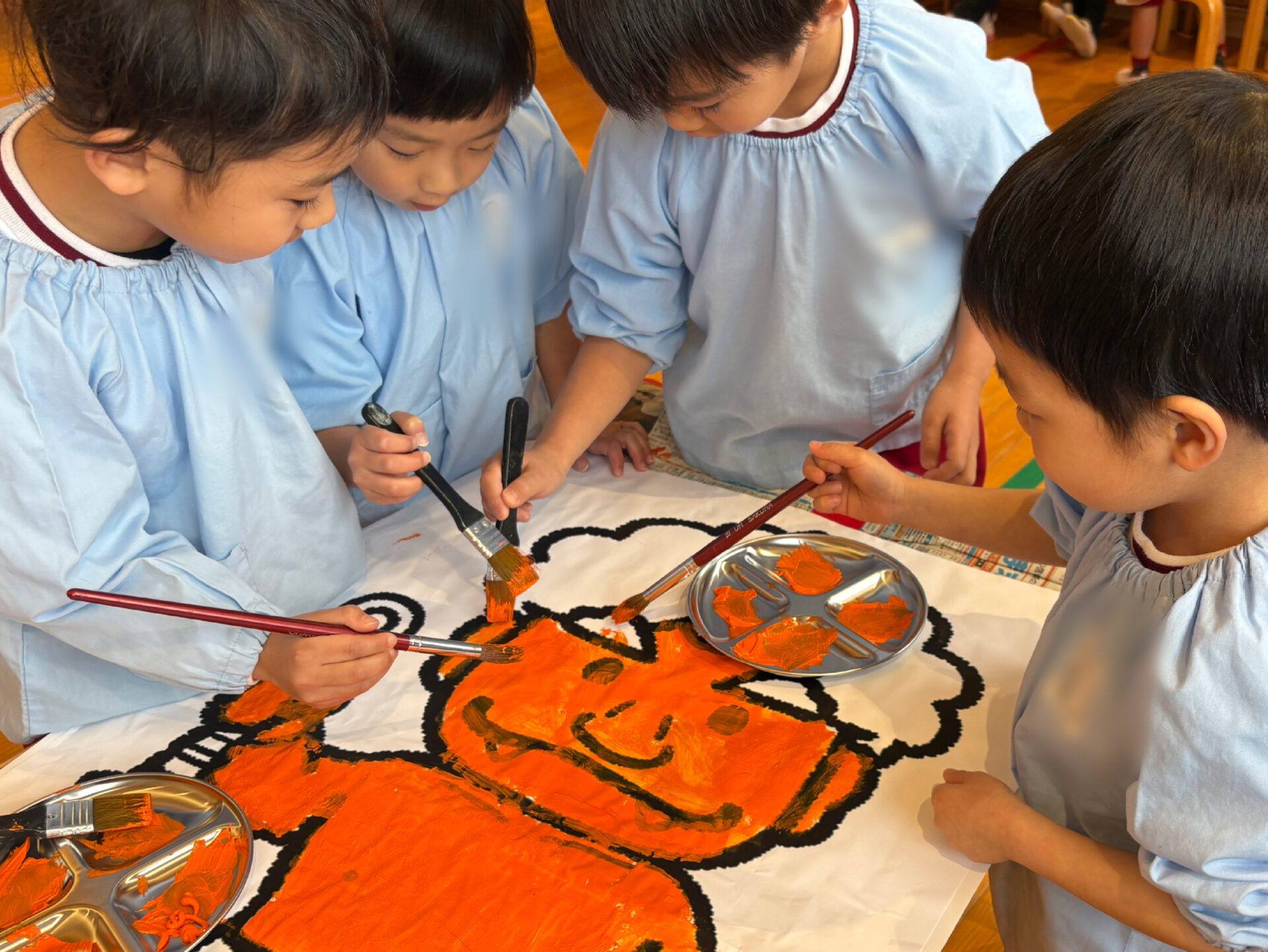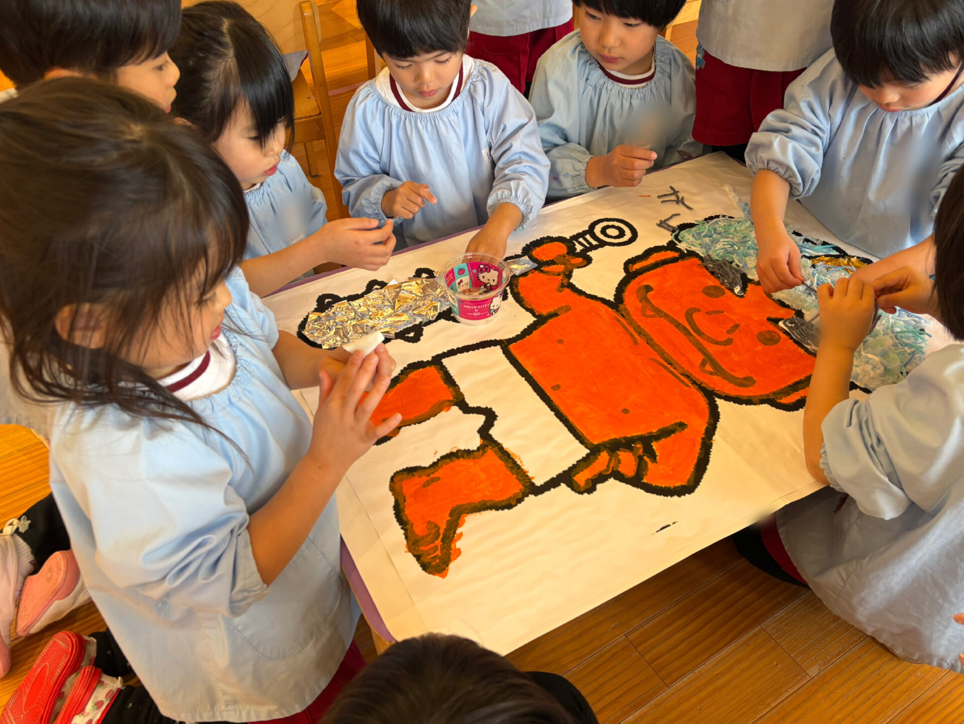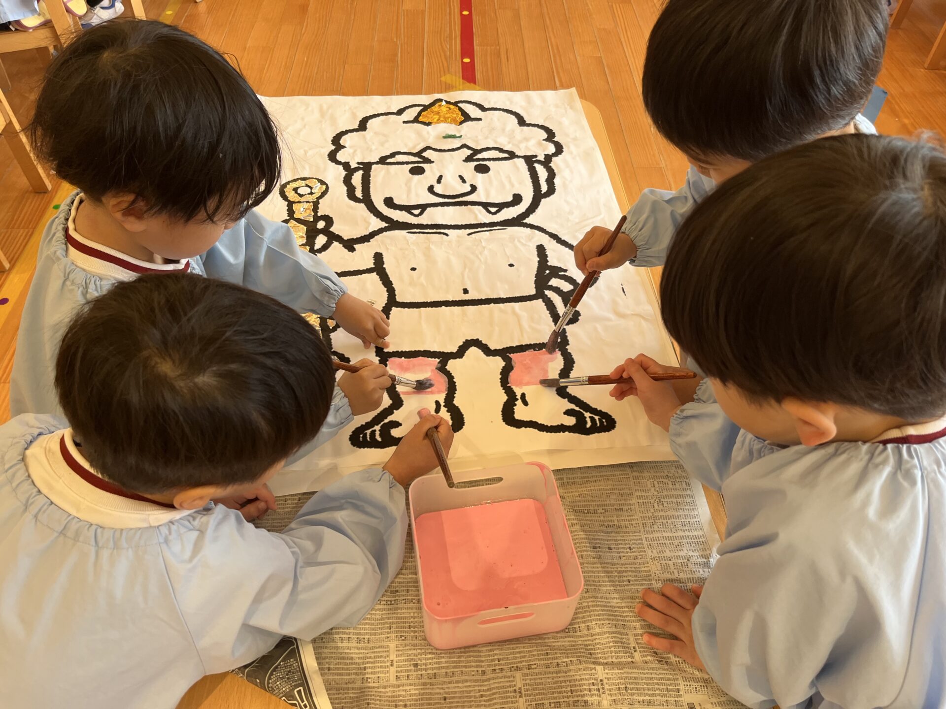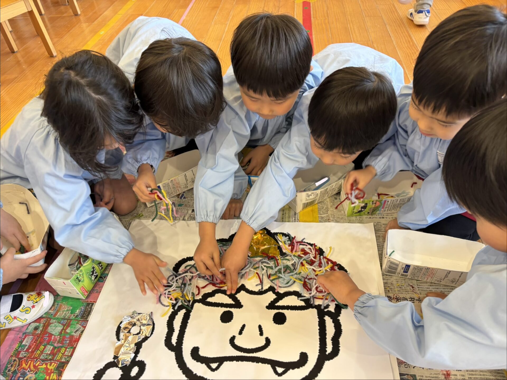 そして、園児の心の中から追い出したい鬼👹を集結し、クラスで1体ずつ鬼を作りました。髪の毛やパンツの模様などを工夫し、個性あふれる鬼の完成です。〈豆まき会では、この鬼に豆を投げて追い出します!!!〉