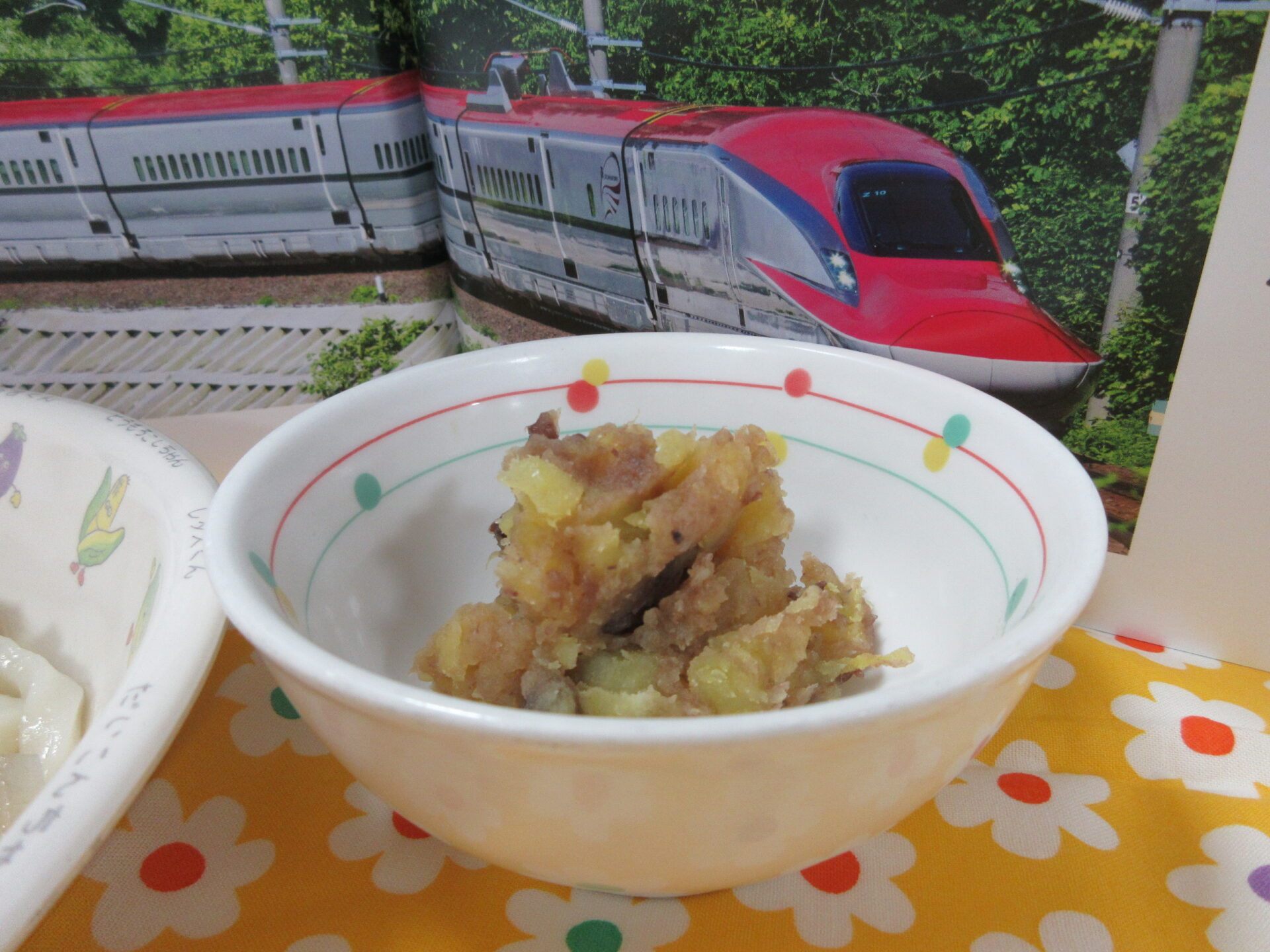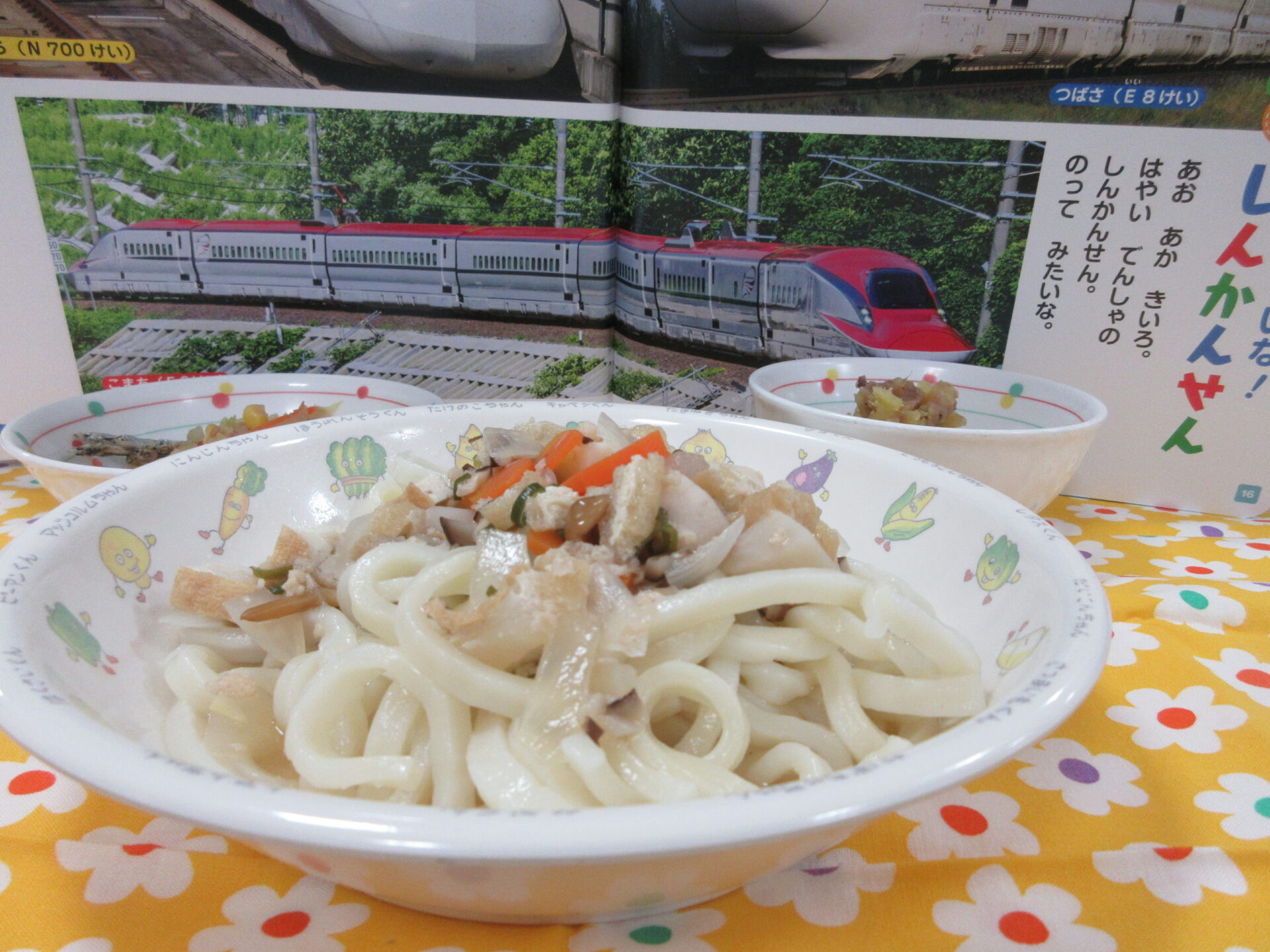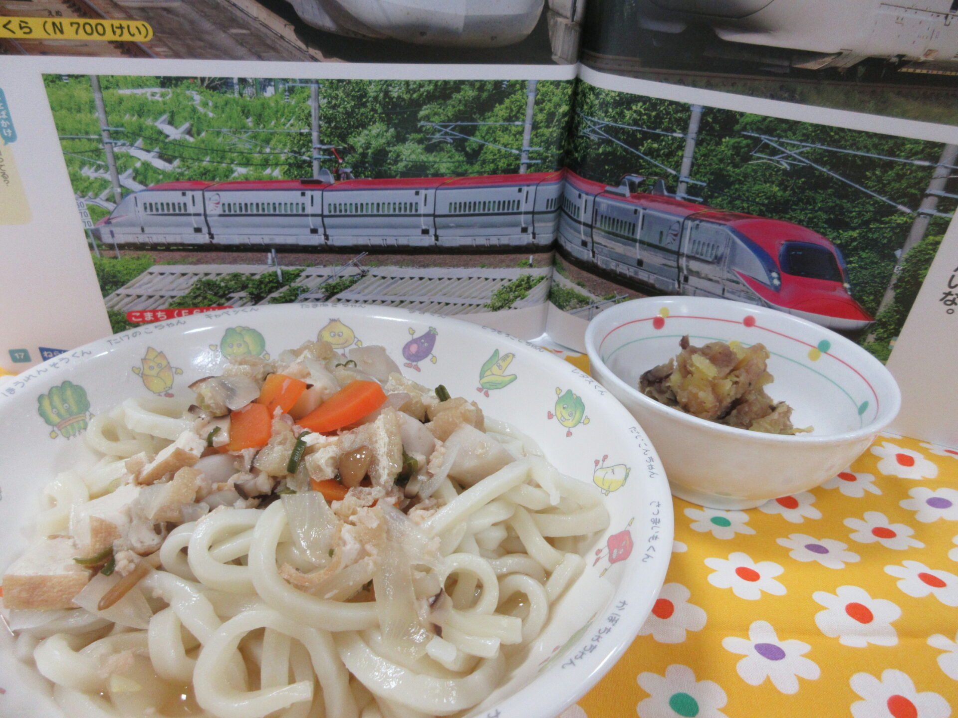 厚揚げや里芋、なめこ等の具が豊富なうどんは栄養たっぷりで美味しかったです。サラダにはツナが入っていました。さつま芋小豆煮は甘いデザートのようでした。