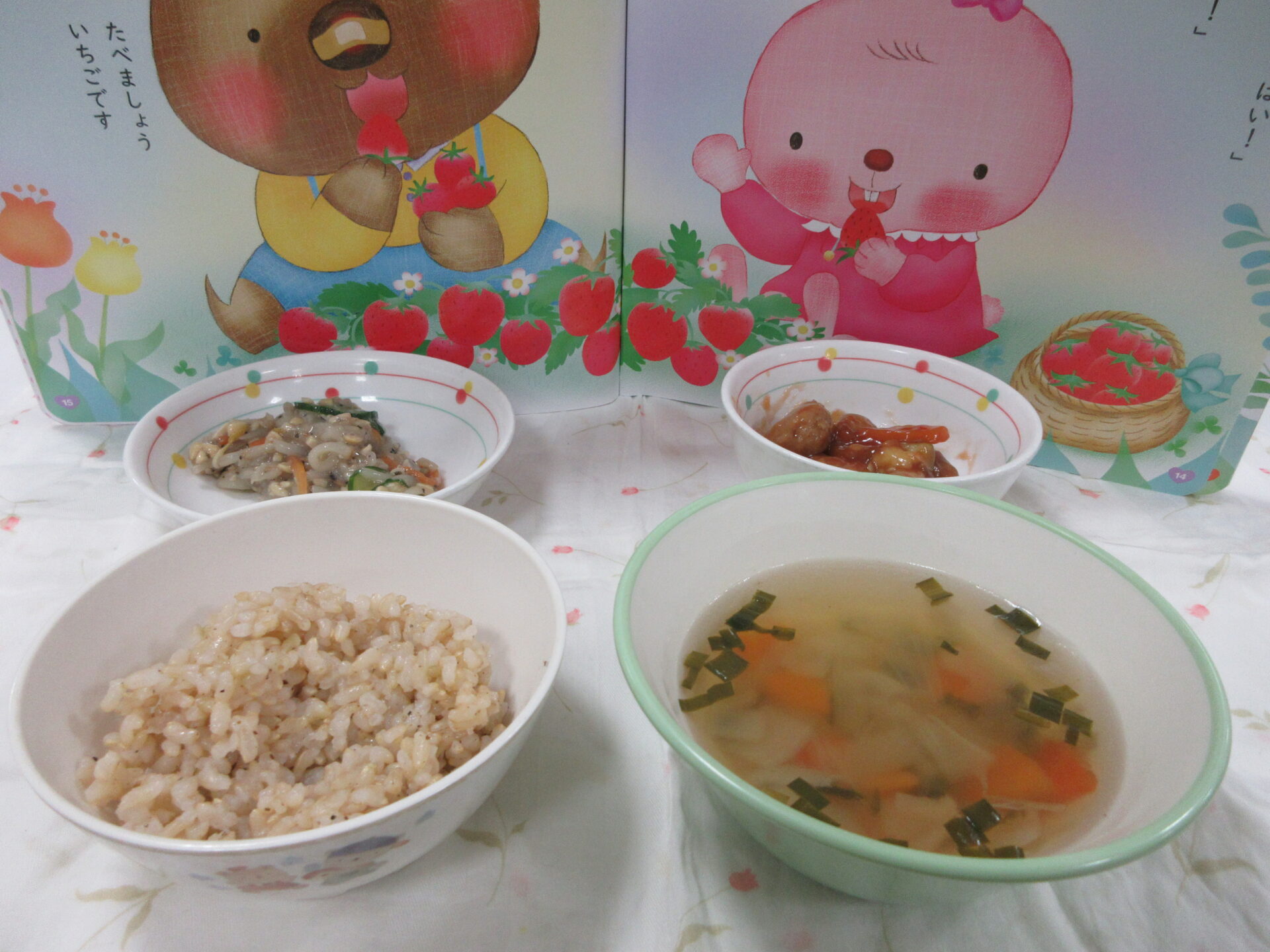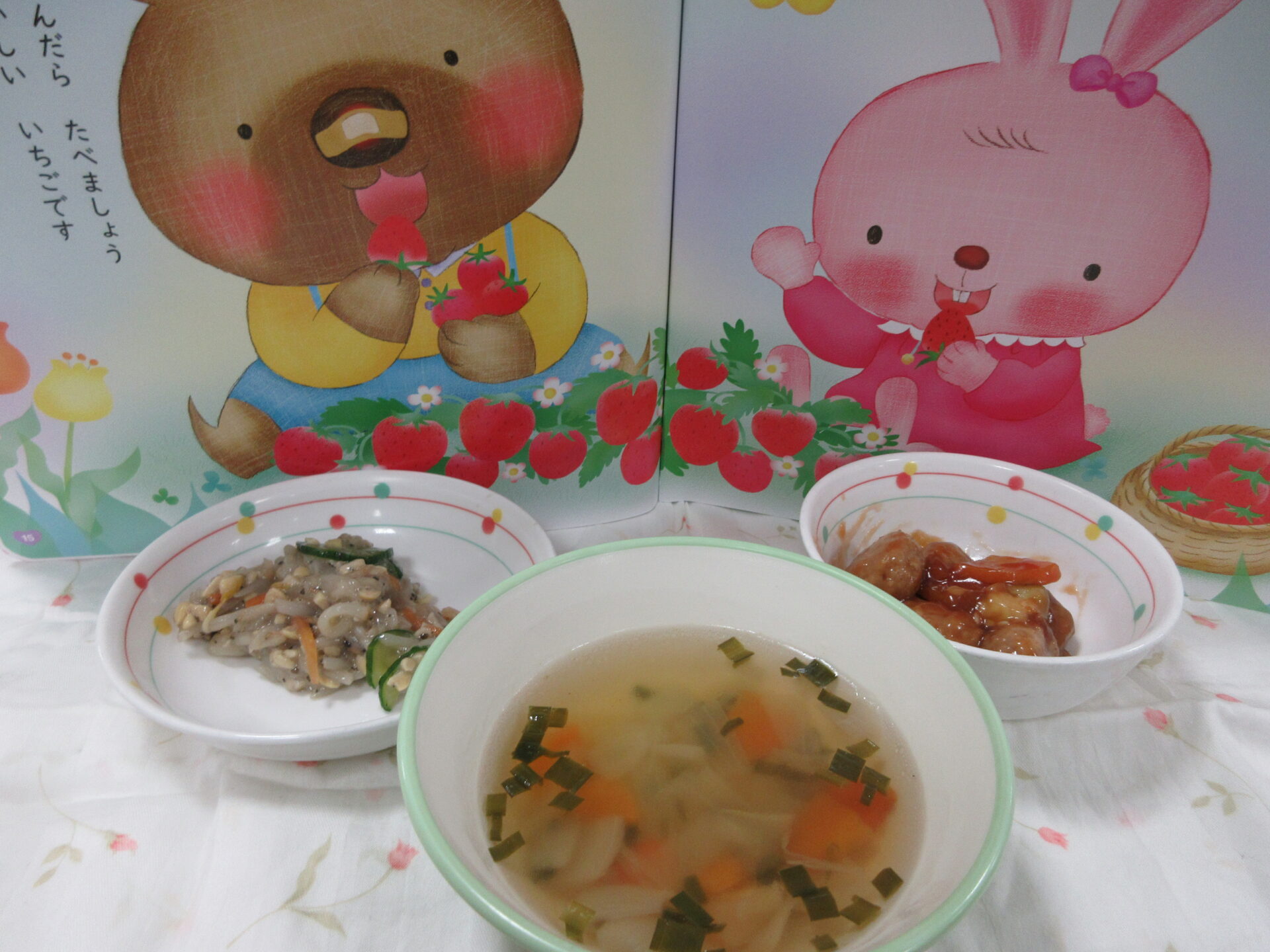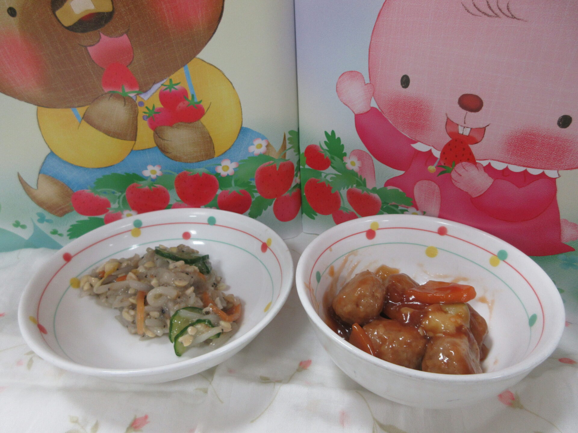 甘酢あんが美味しい肉団子の酢豚風は園児の大好きな味でよく食べました。もやし納豆やスープはツルツルと食べやすく美味しかったです。
