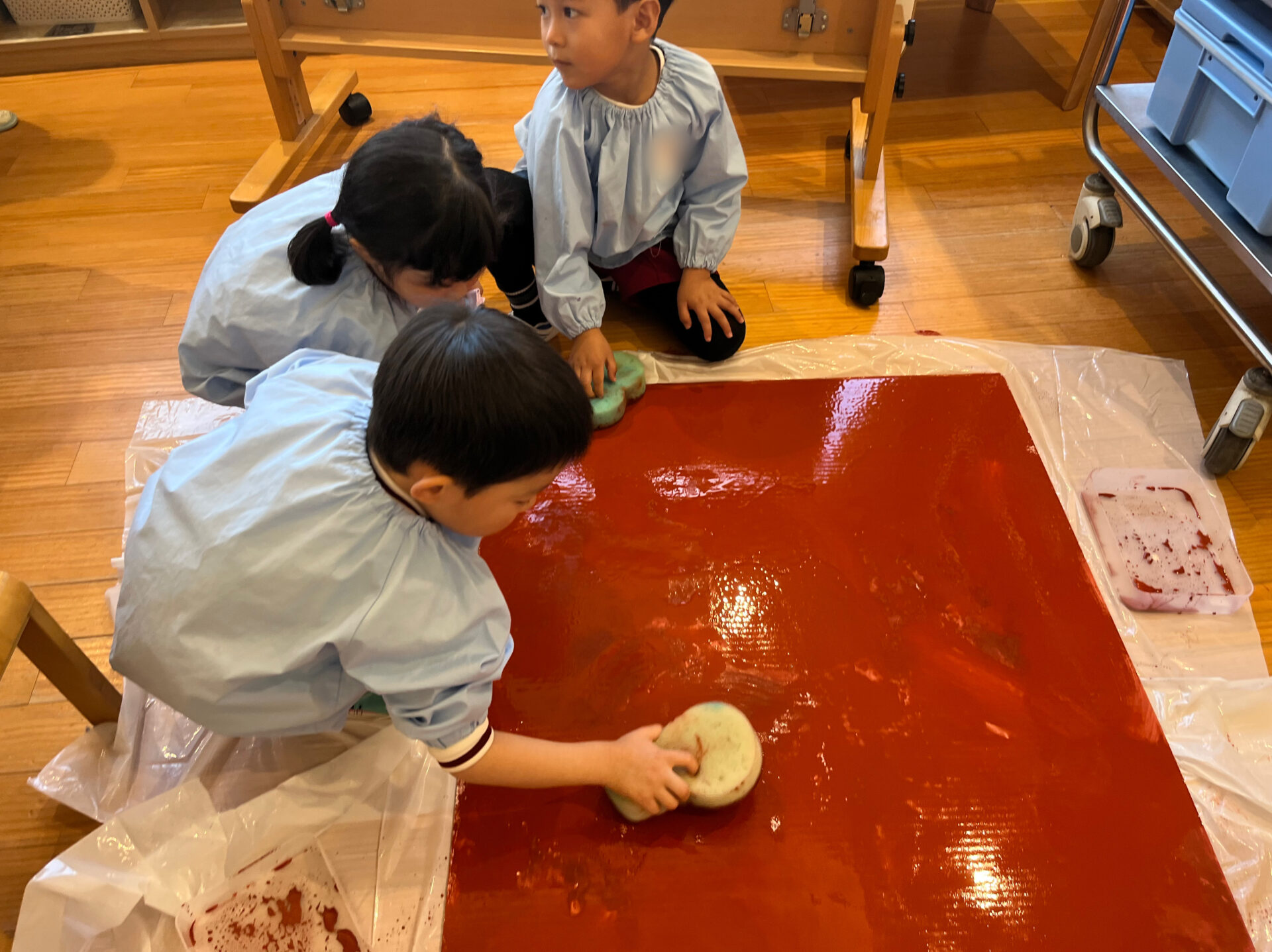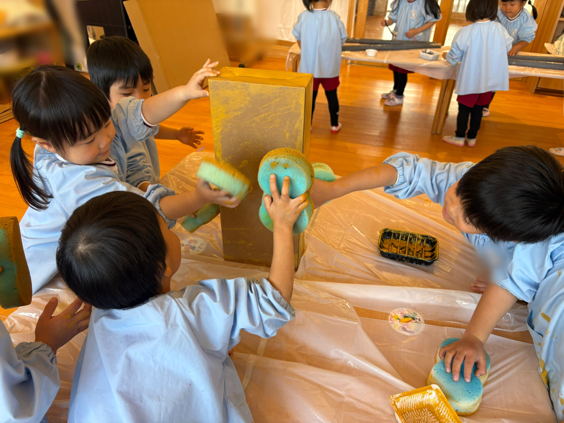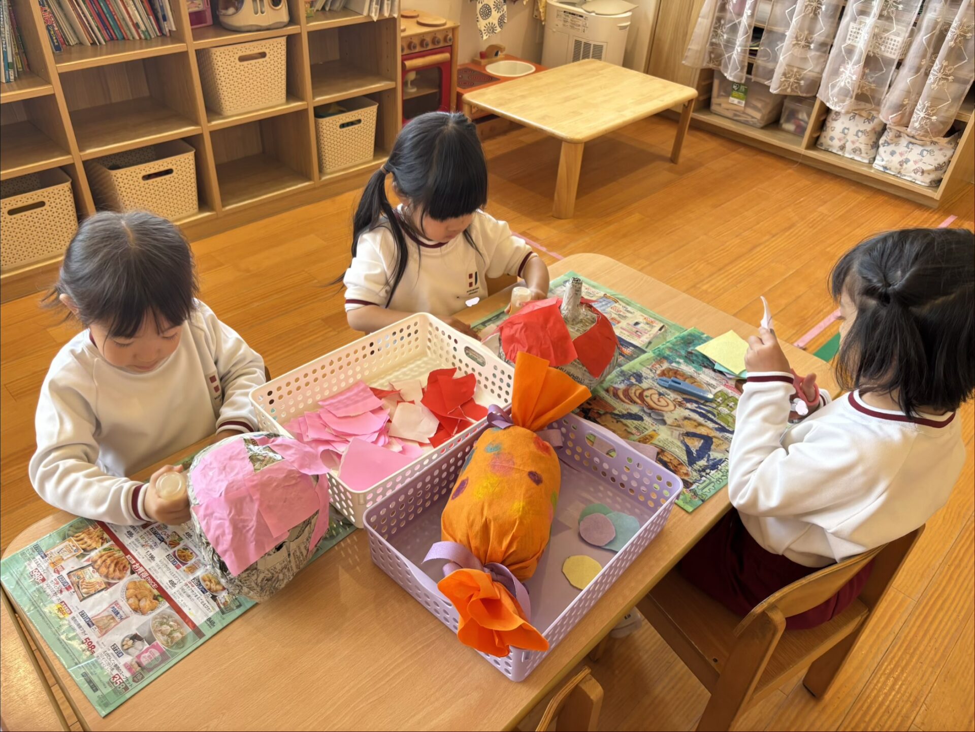 「こうしたらどうかな?」「もっと大きくしよう!」など、友達とたくさんのアイディアを出し合い、楽しみながら製作する姿が見られました。