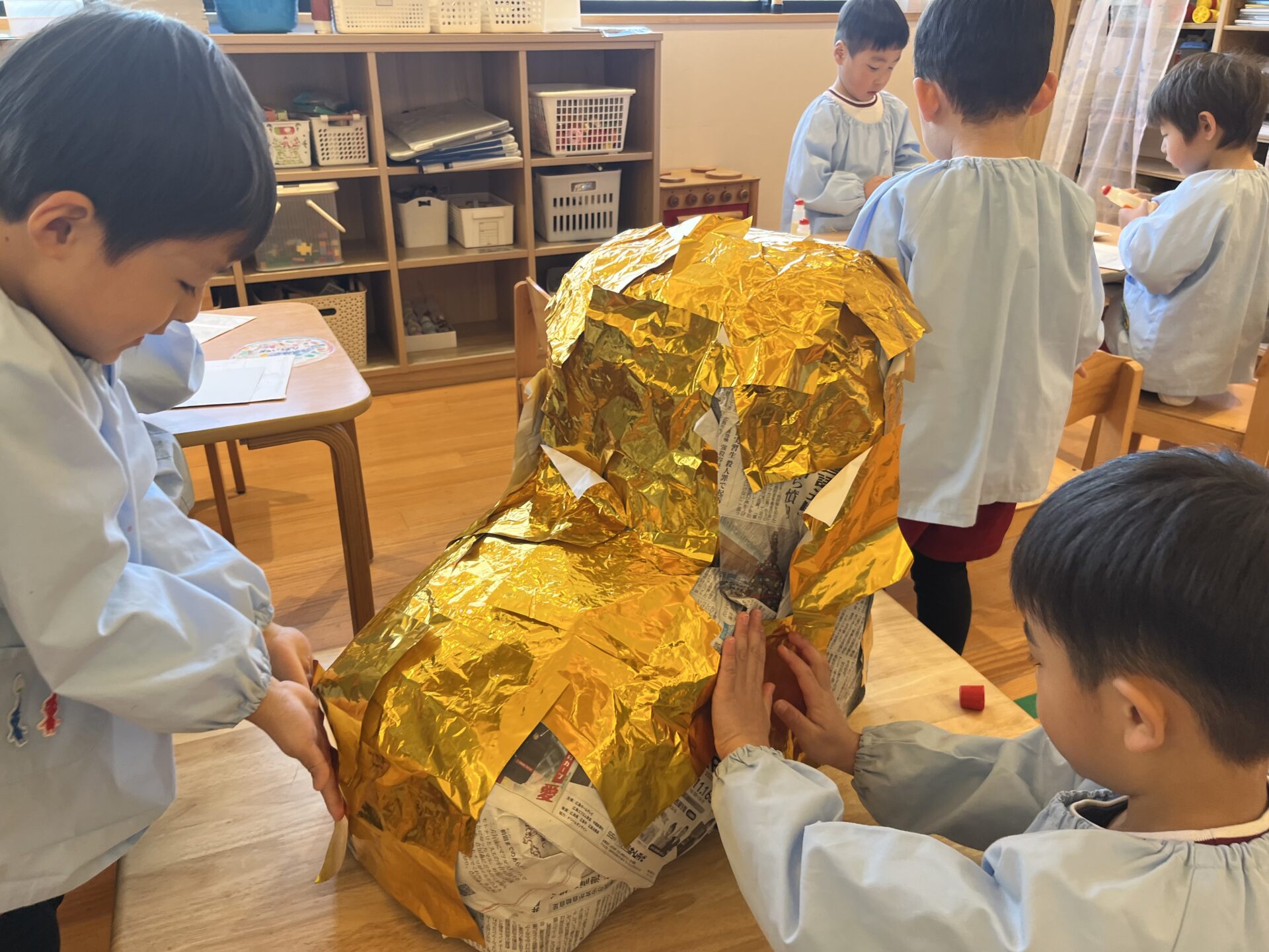 「こうしたらどうかな?」「もっと大きくしよう!」など、友達とたくさんのアイディアを出し合い、楽しみながら製作する姿が見られました。
