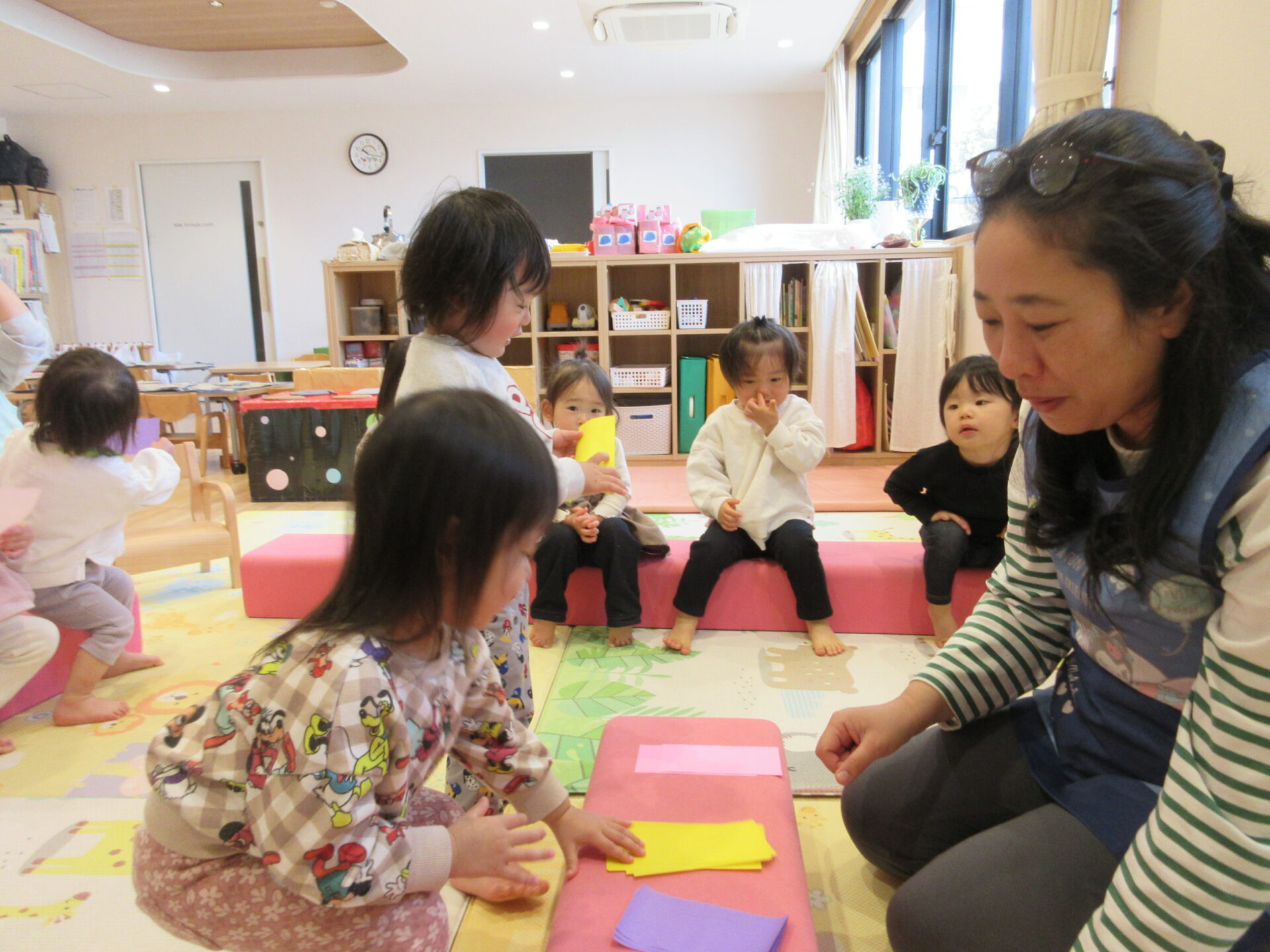 「すごいすごい~上手👏」保育室に声が響きます❣好きな折紙を選び…くるりらでお絵描きをしました✨上手に手を動かします✏