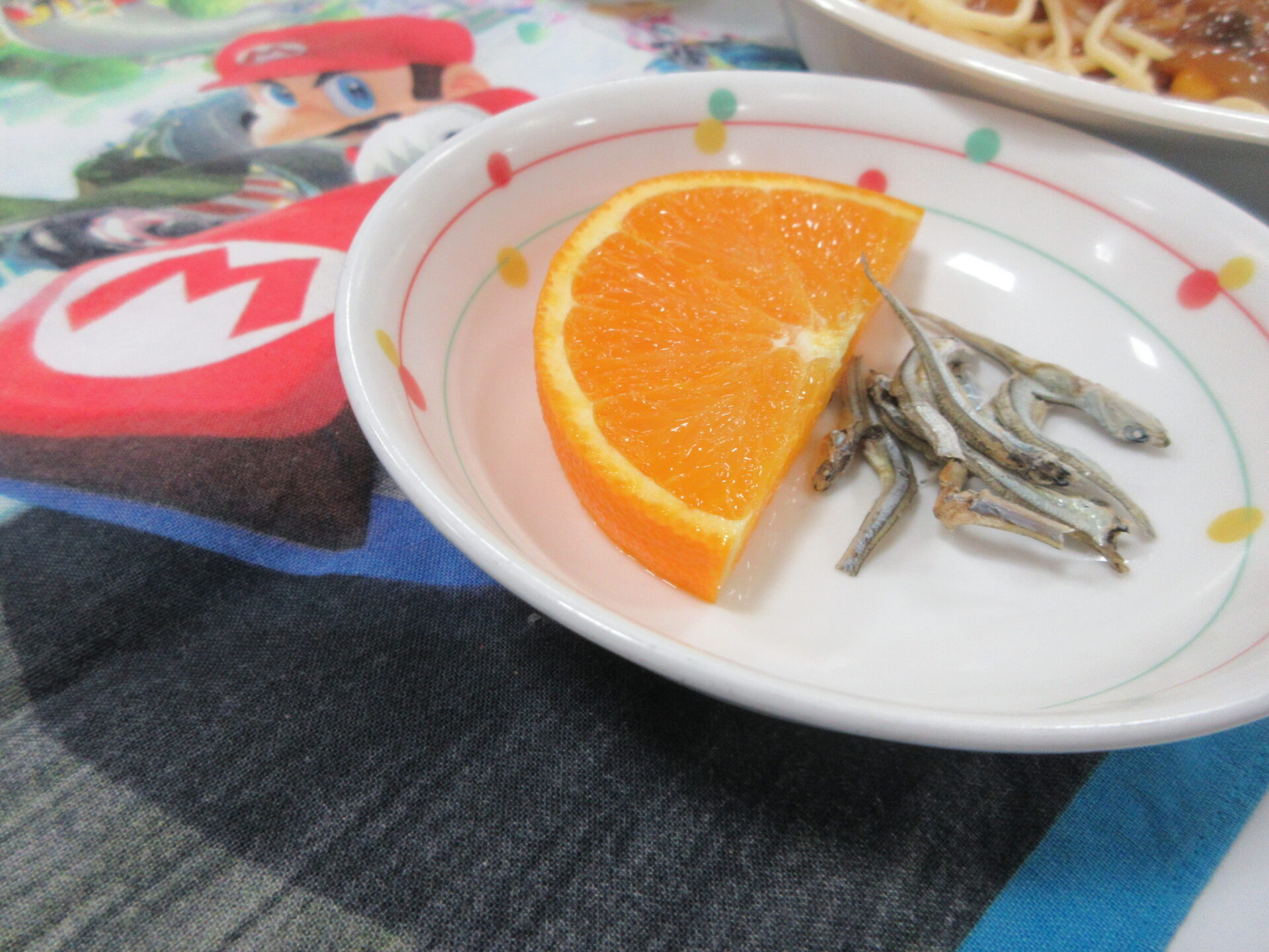【ハヤシパスタ 🍠さつま芋サラダ 🍊オレンジ 食べる煮干し】