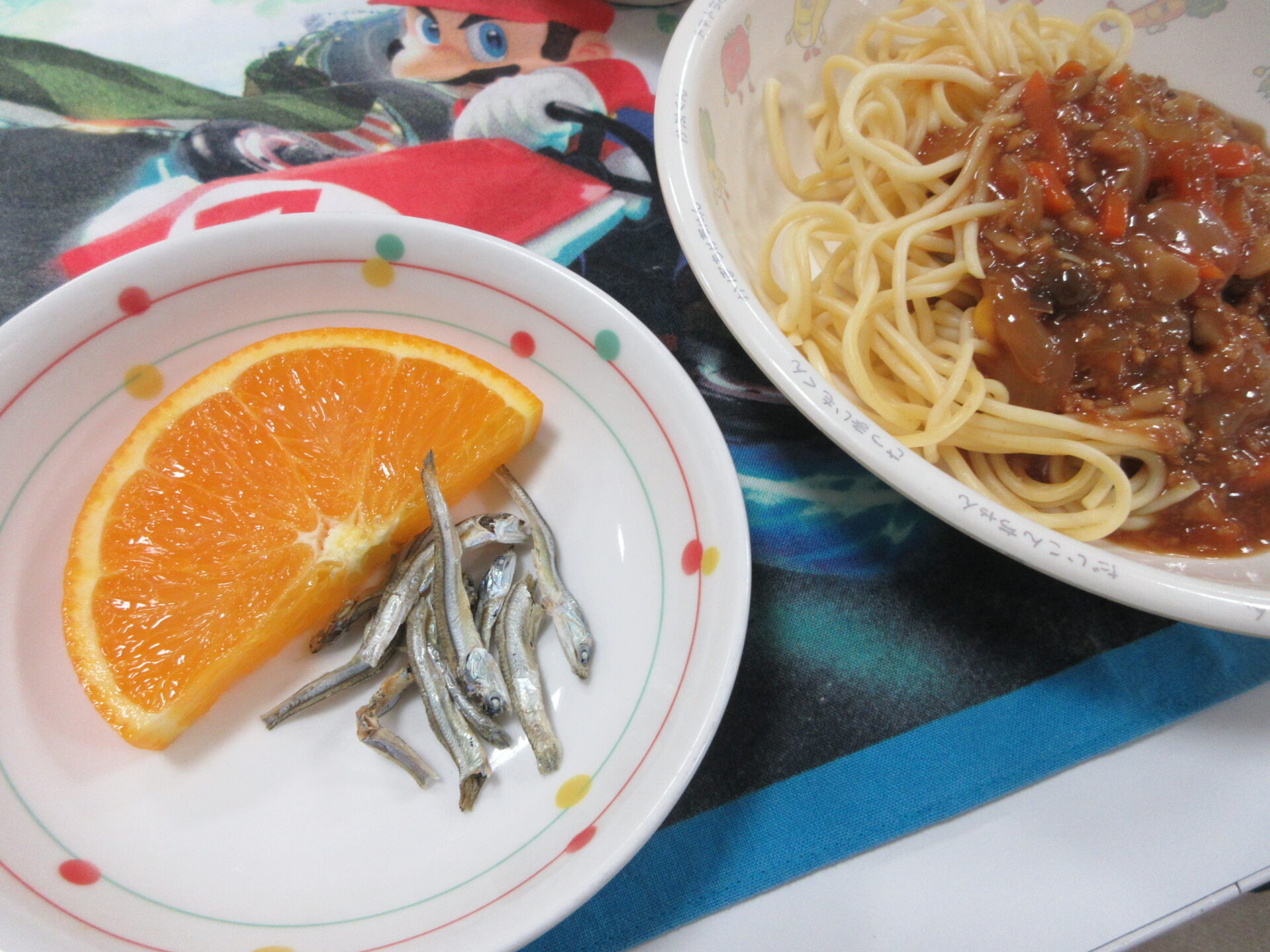 ハヤシスパゲッティは園児の大好きなトマト味で、麺にソースが良くからんで美味しく食べました。さつま芋のポテトサラダは甘くて大人気でした。