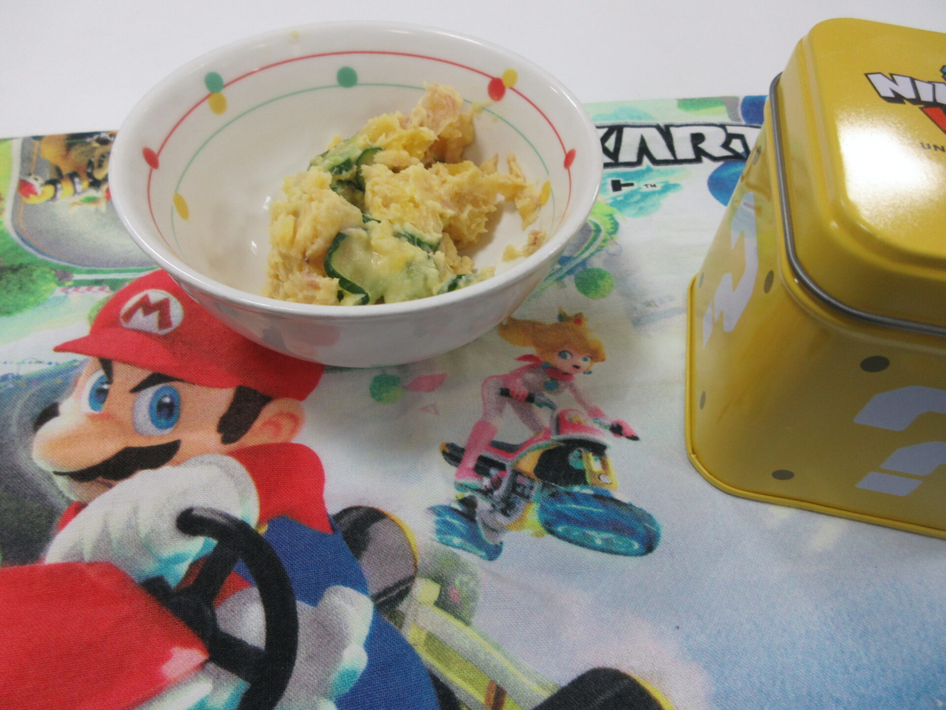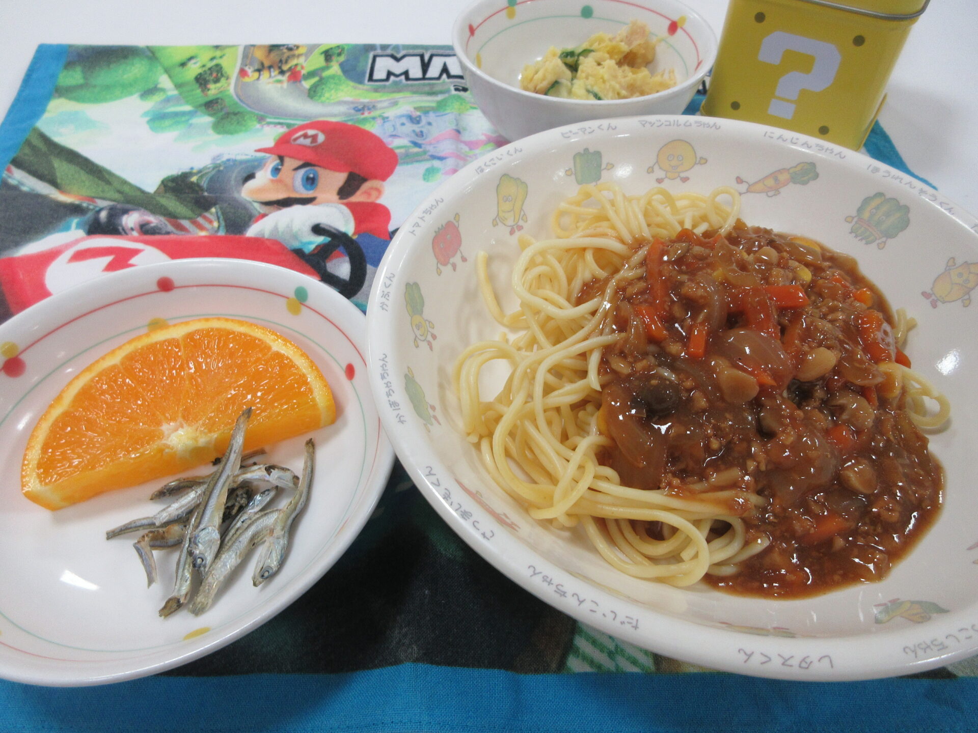 ハヤシスパゲッティは園児の大好きなトマト味で、麺にソースが良くからんで美味しく食べました。さつま芋のポテトサラダは甘くて大人気でした。