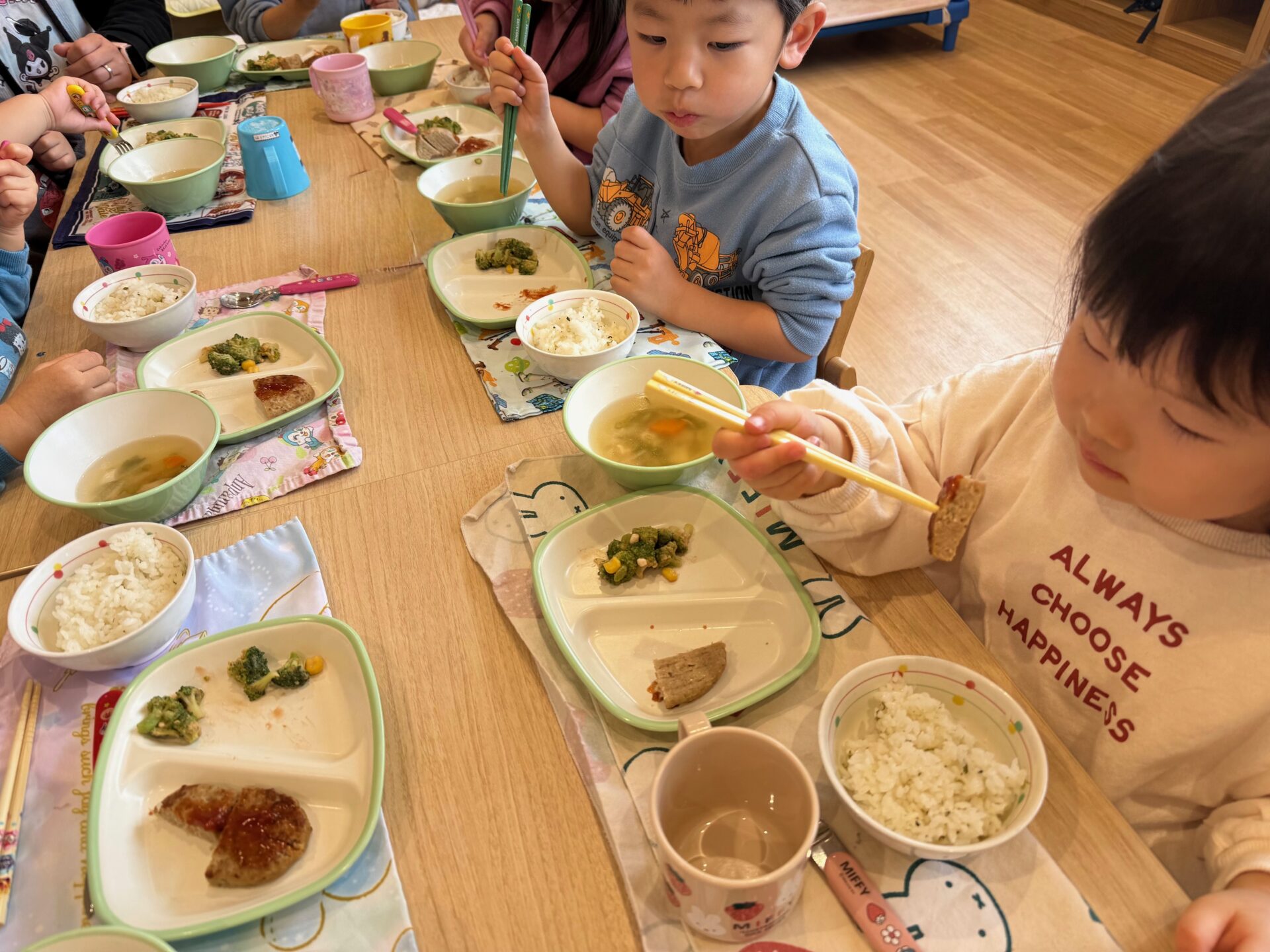 園での取り組みが自信につながるよう、ご家庭でも無理のない範囲で、上靴やお箸、トイレの練習に取り組んでいただけると嬉しいです。
