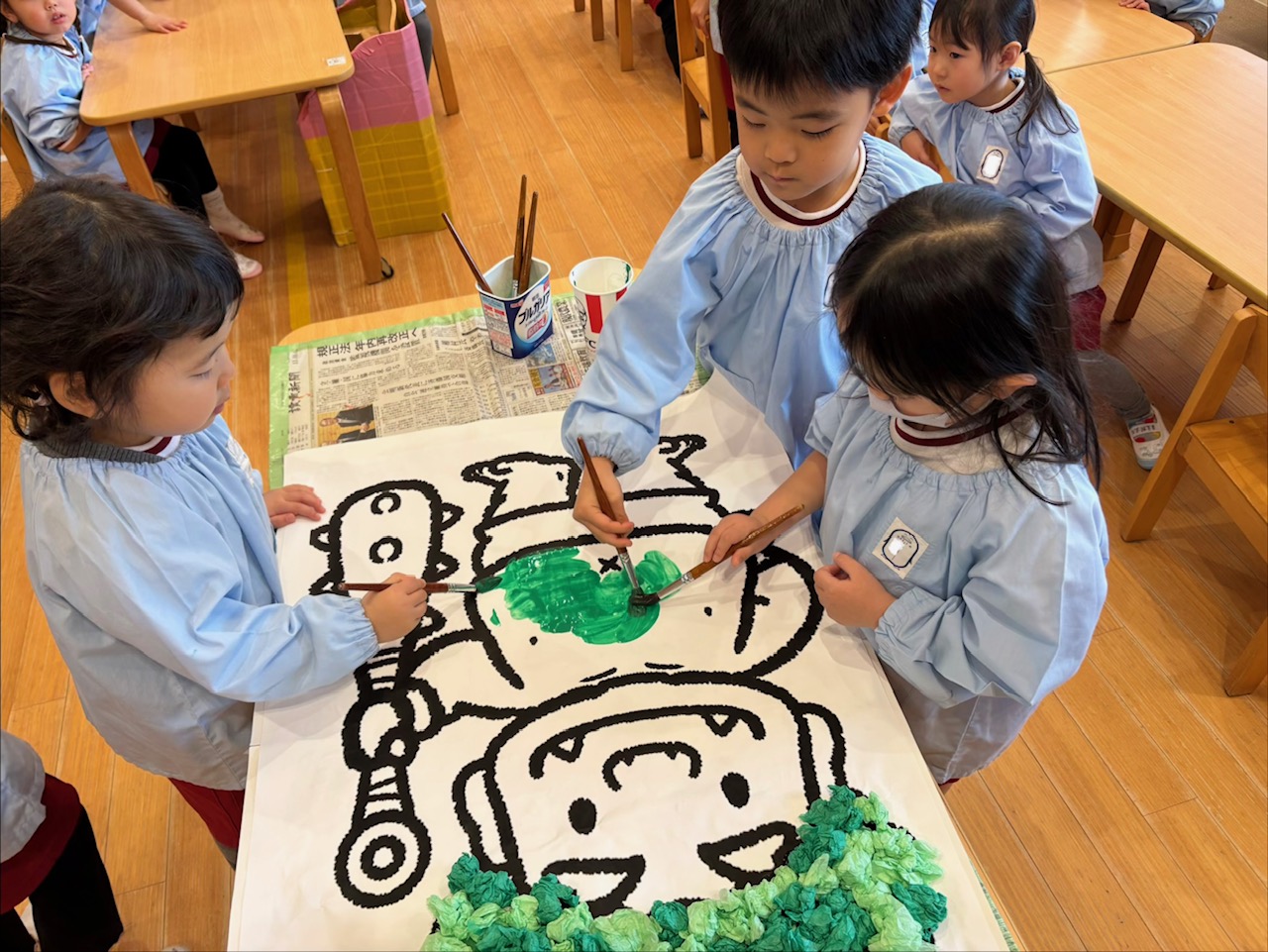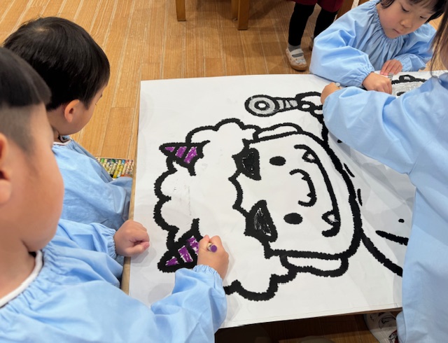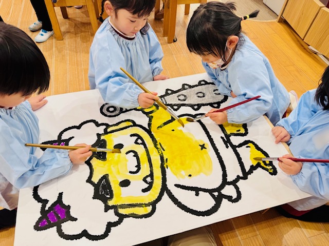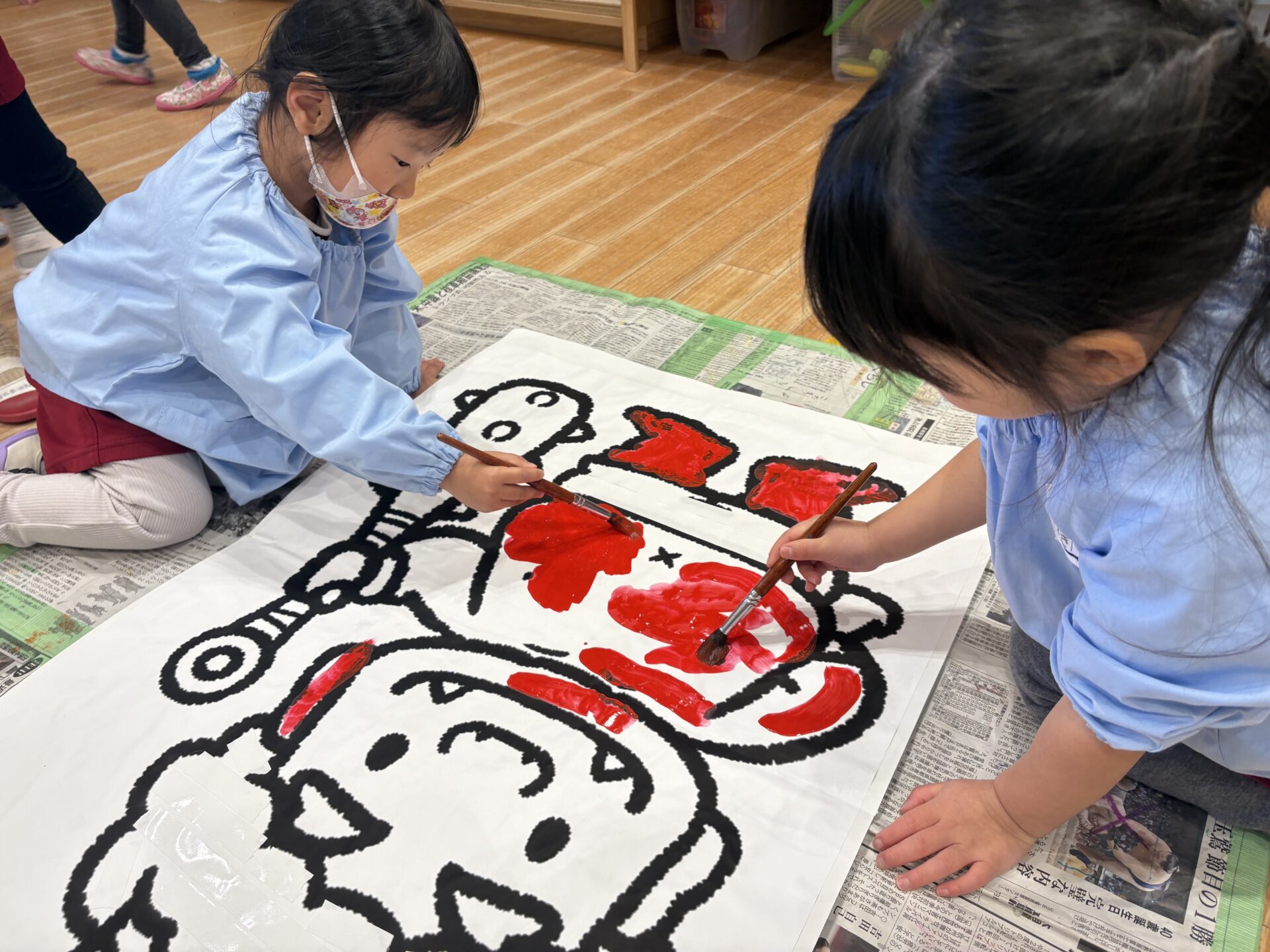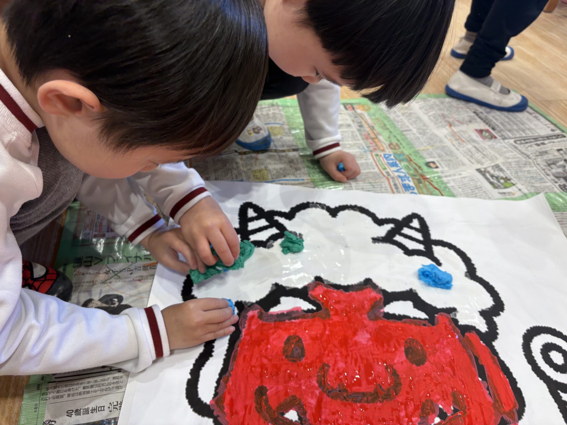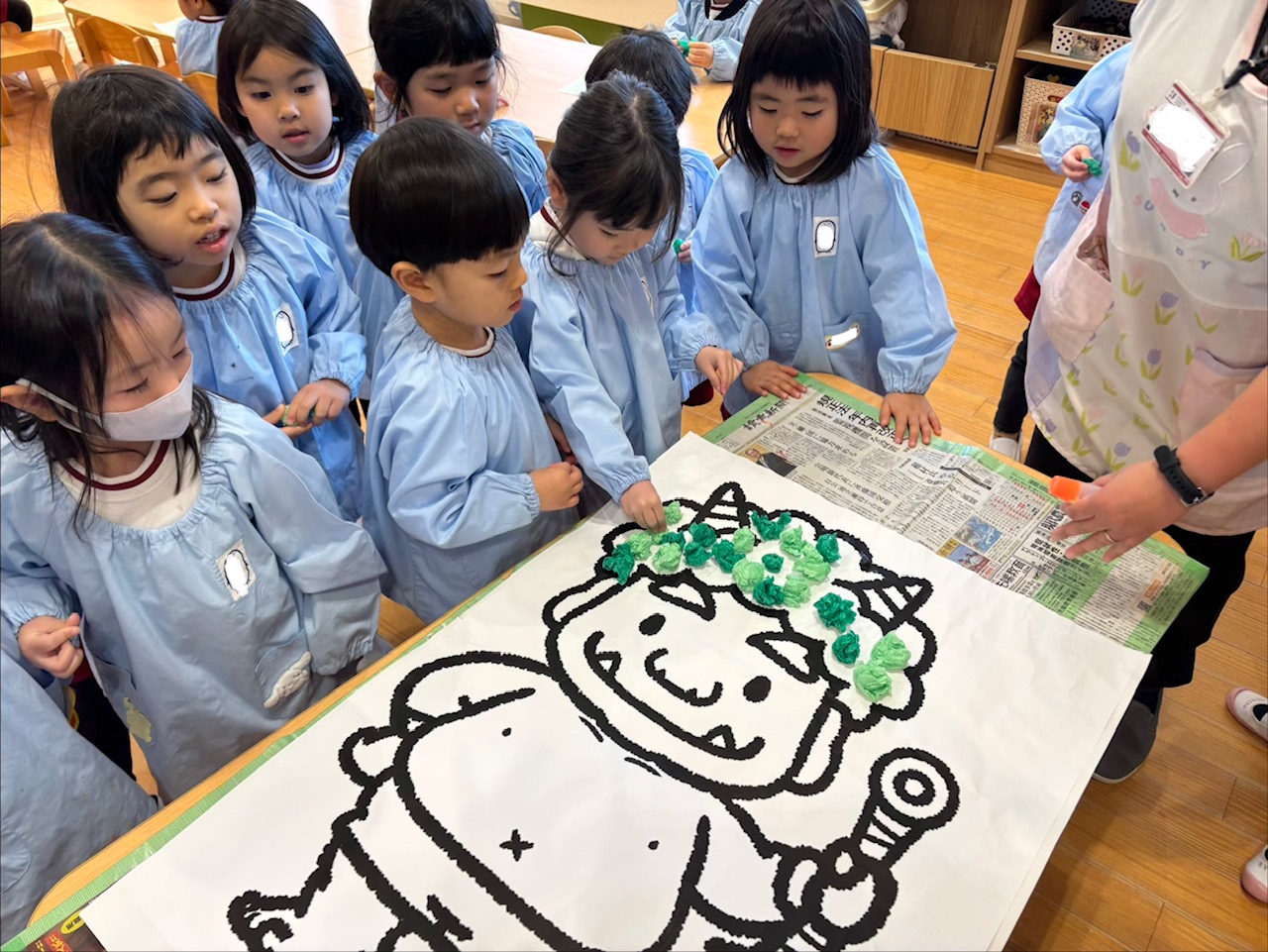 節分は、春を迎える前にみんなが元気に過ごせるよう願う行事です。「鬼って怖いよね」「鬼は鬼ヶ島に住んでいるんだよ」という園児もいましたが、「鬼はみんなの心の中にいて、『いやいや』『めそめそ』『ぷんぷん』などが変身した姿なんだよ。豆まきをするとびっくりしてどこかに逃げて行くんだって。」と保育教諭から教えてもらうと、自分の中にどんな鬼がいるだろうと一斉に考え始めました。