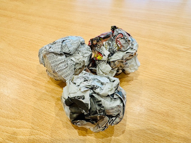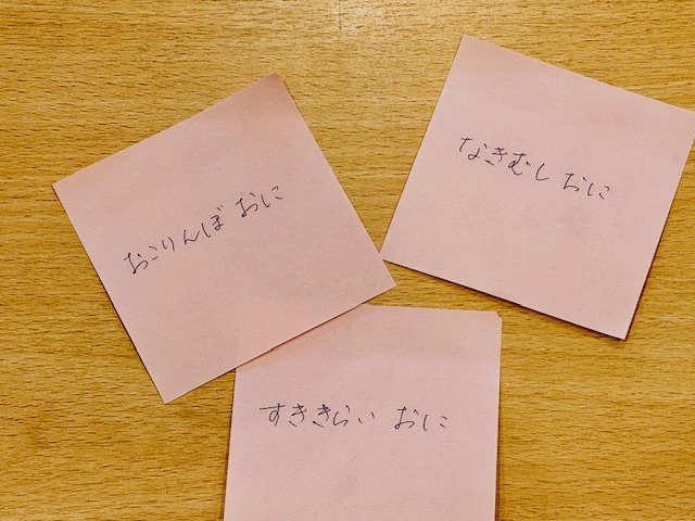「ぼくは好き嫌い鬼かな。」「わたしは泣き虫鬼。」園では2月2日に豆まき会をします。その時にやっつけたい鬼を紙に書き、鬼が出ていきますように…と願いを込めながら新聞紙の中に包み込んで鬼豆にしました。