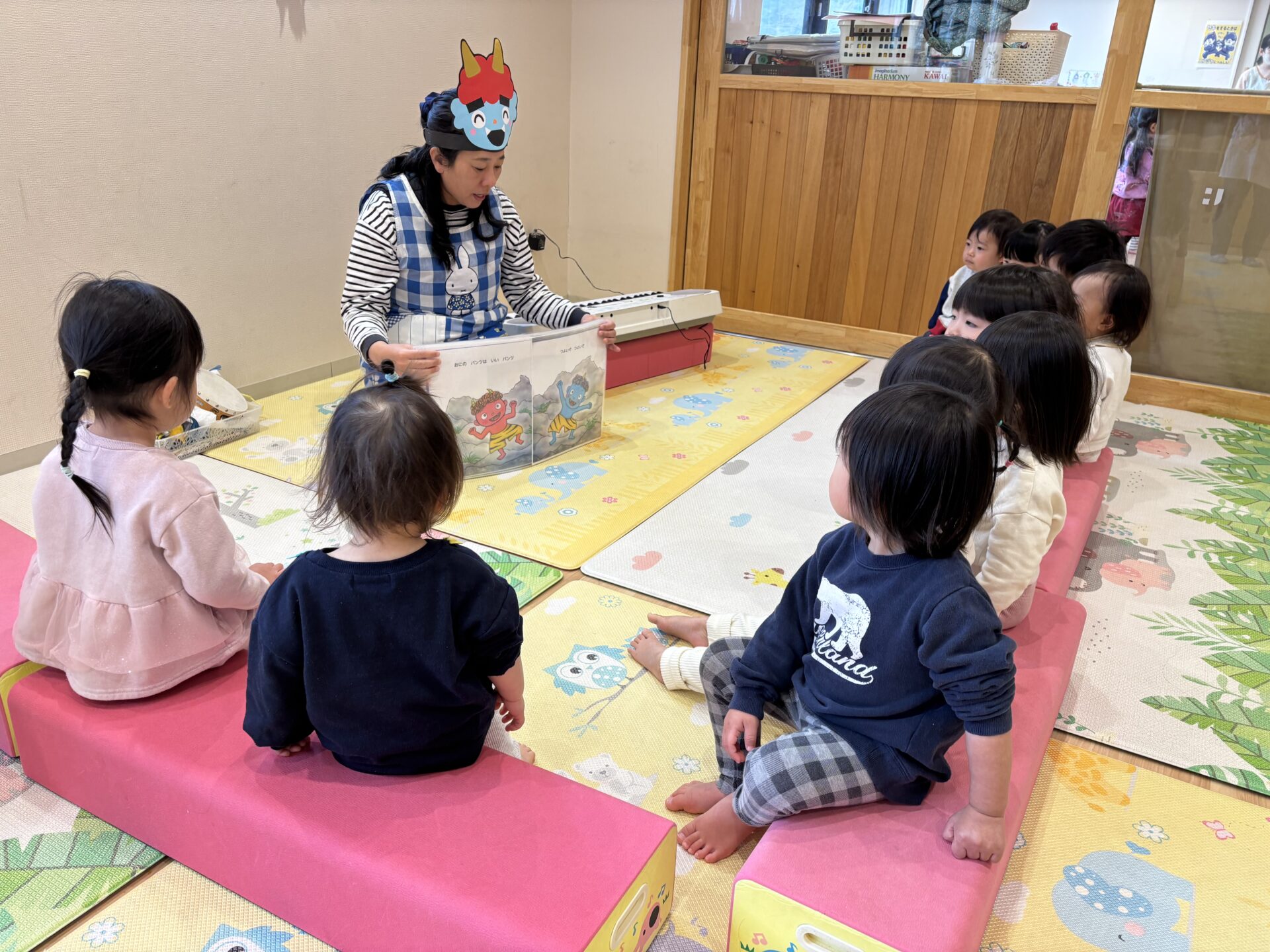 保育室に園児たちの元気な声が響きます🎹「おにはそと~♪」「おに~のパンツはいいパンツ~♪」と『まめまき』や『おにのパンツ』の歌を歌いました!
