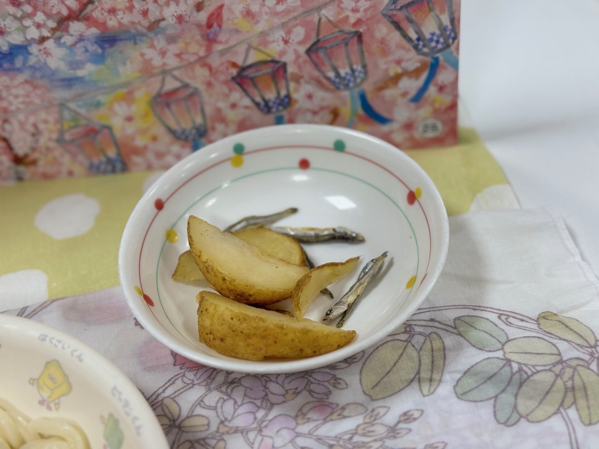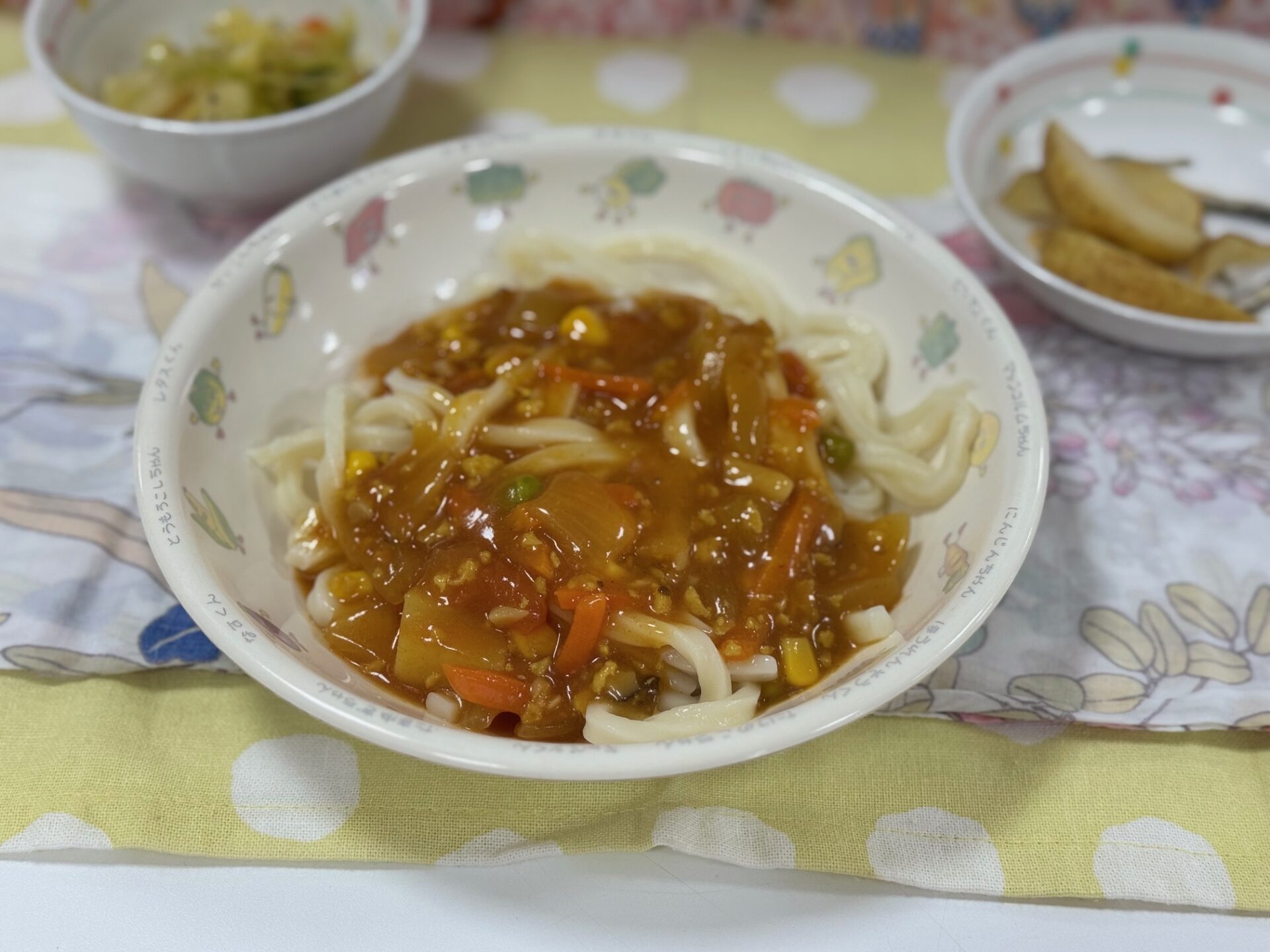 【カレーうどん キャベツのゆかり和え 🍟フライドポテト 食べる煮干し】