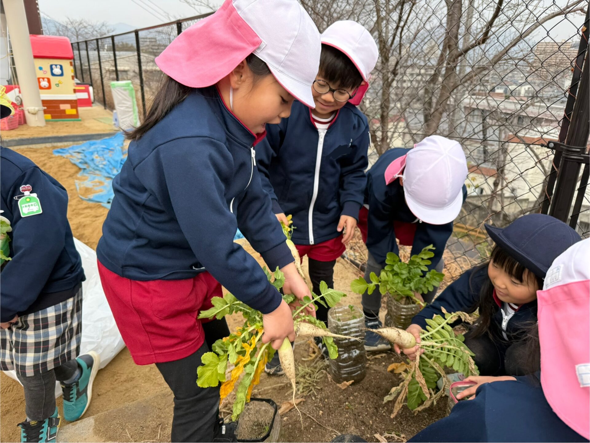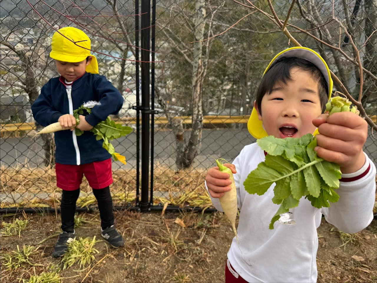 「見て見て!できてる!」「ちょっと曲がってるよ!」「赤ちゃん大根みたい!」