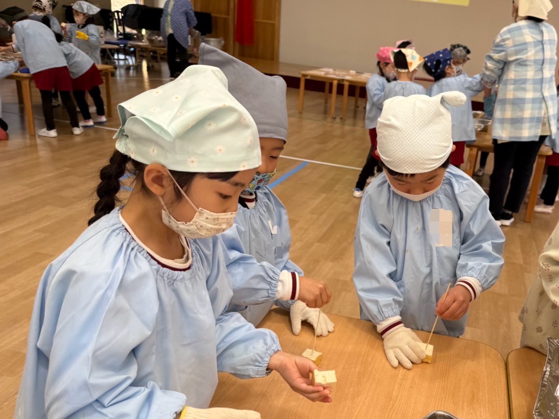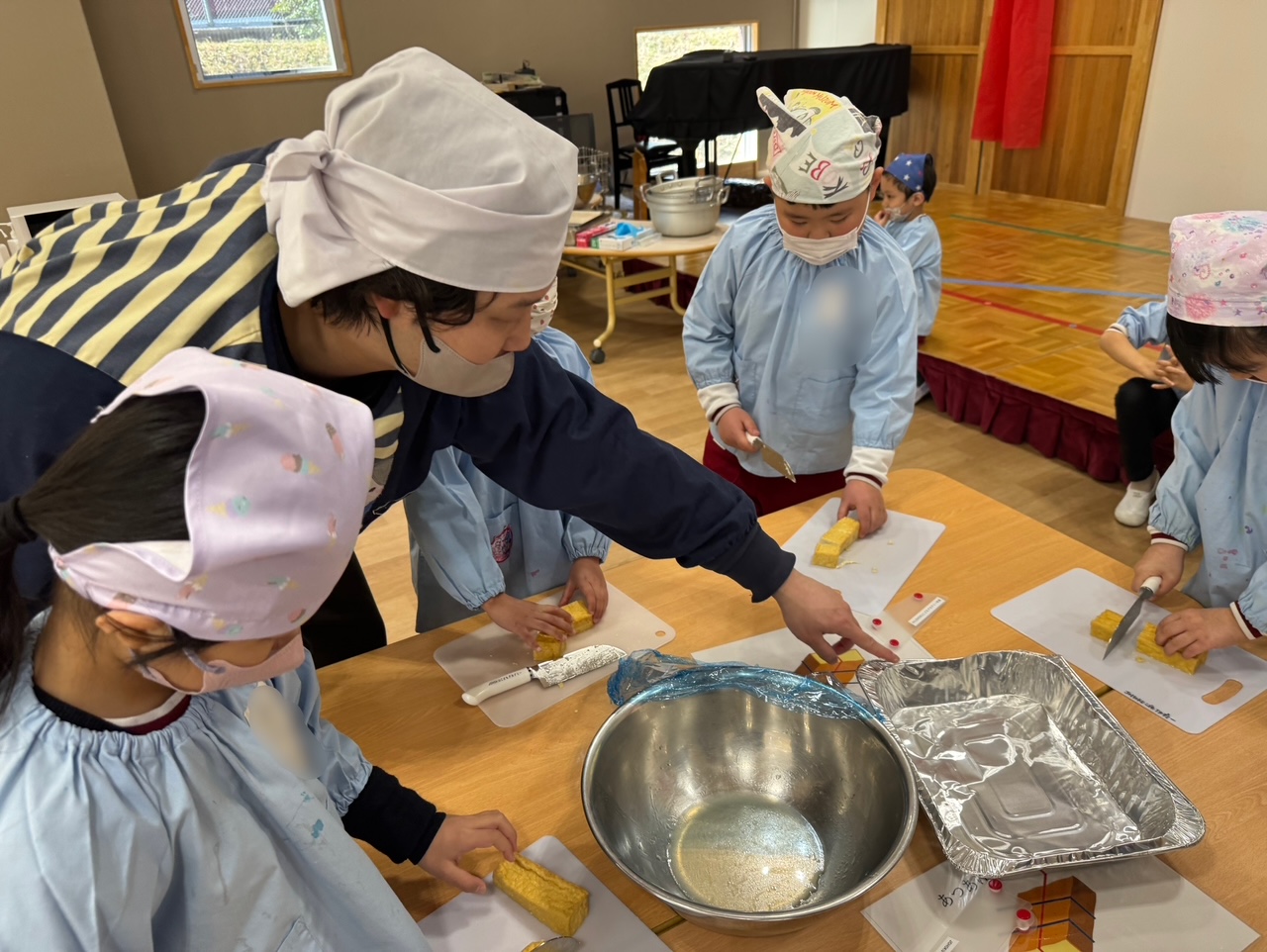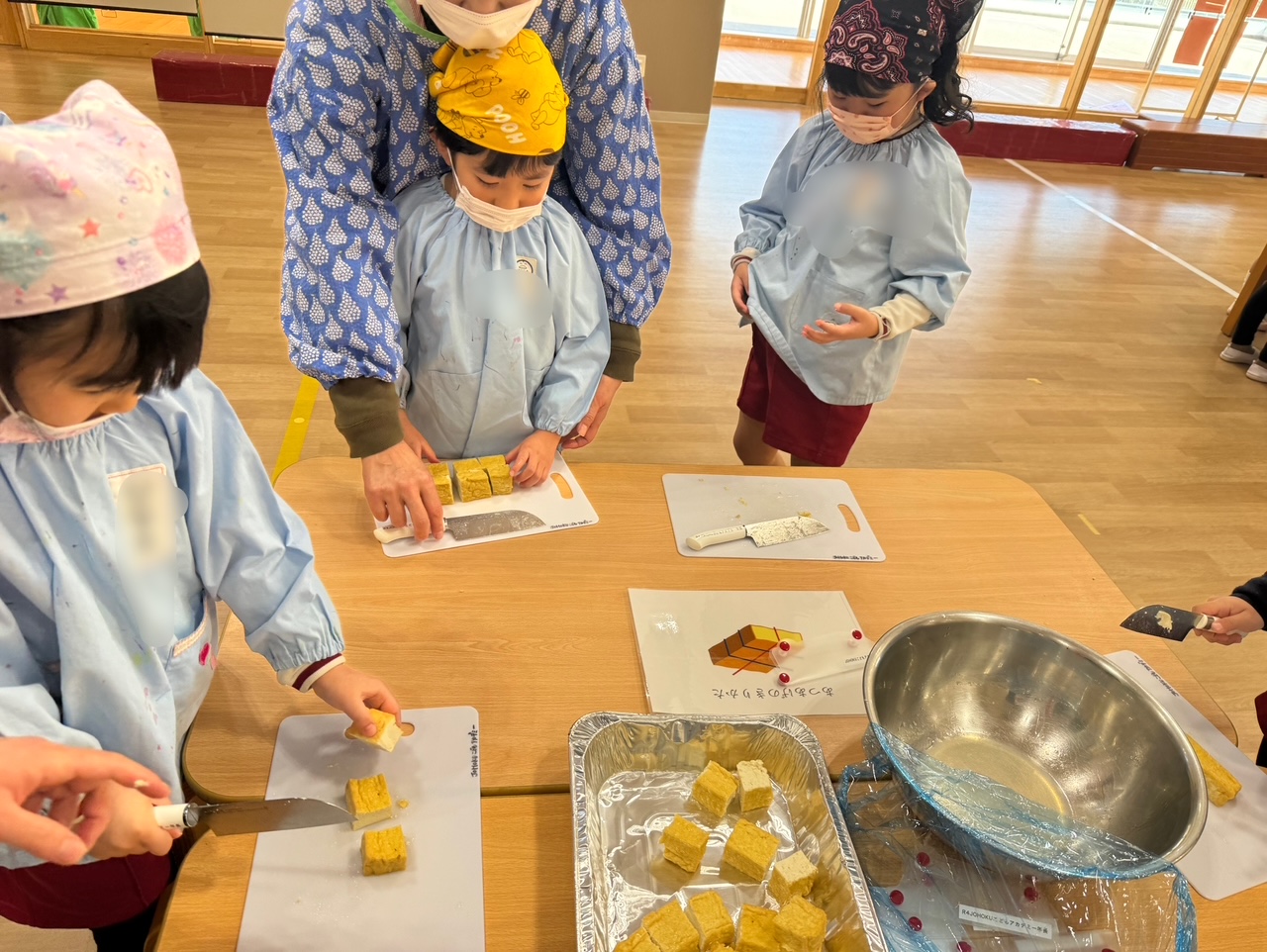 包丁で食材を切る表情は真剣そのもの。「かたいね」「においがするよ」と気づきもいっぱい。
