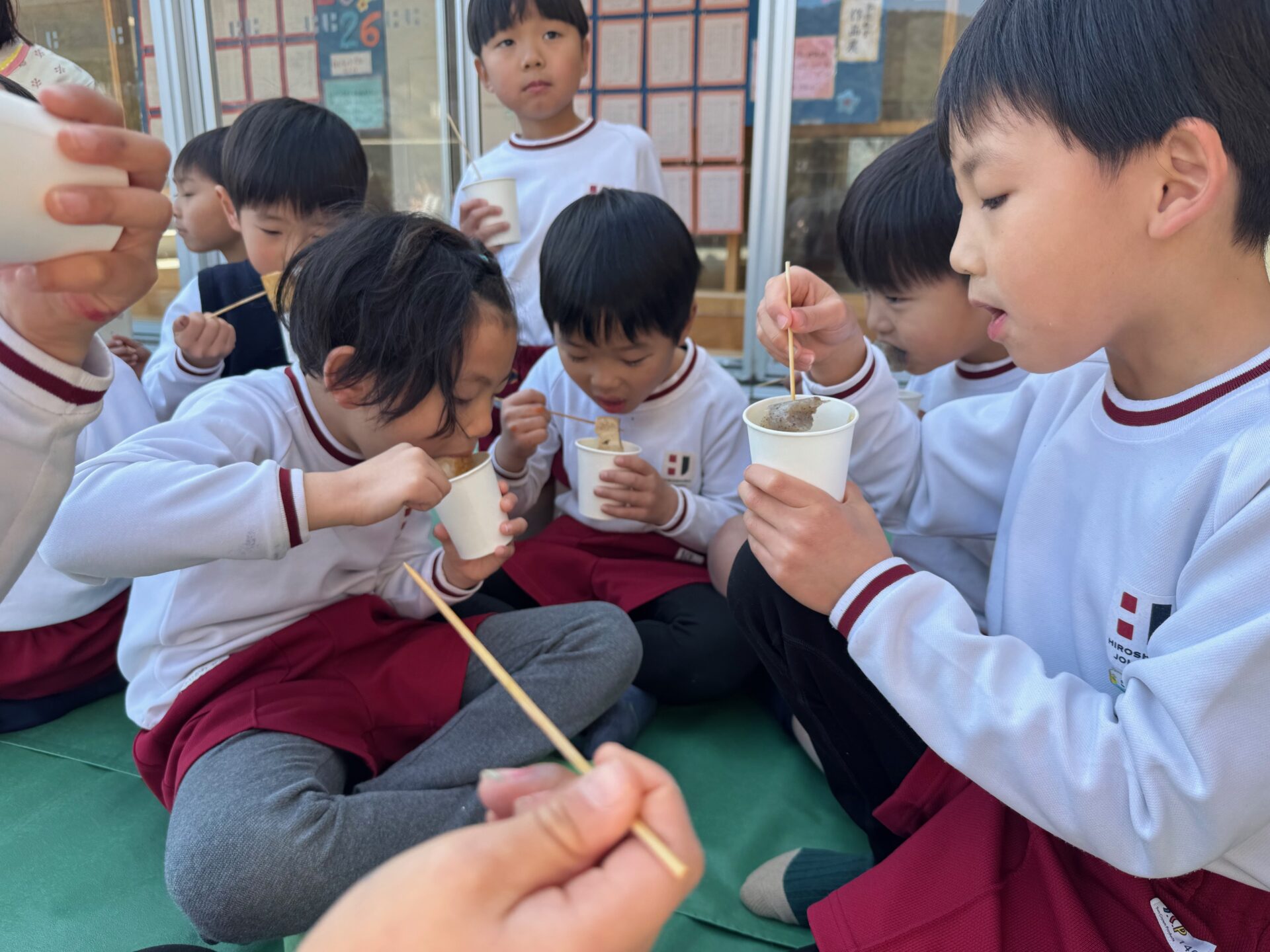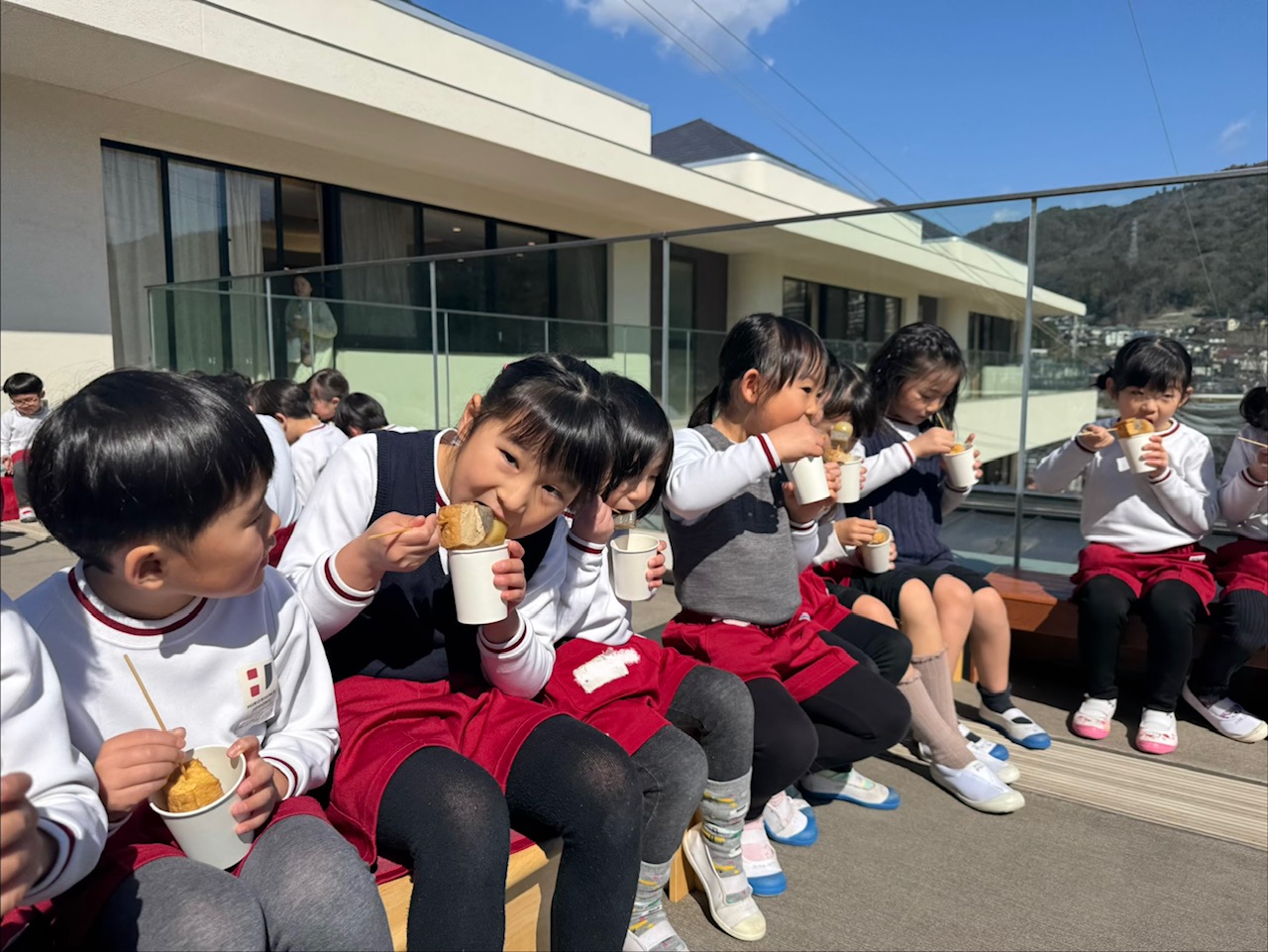 つくったおでんはテラスで食べました。自分たちで育てた大根のおでんは格別。