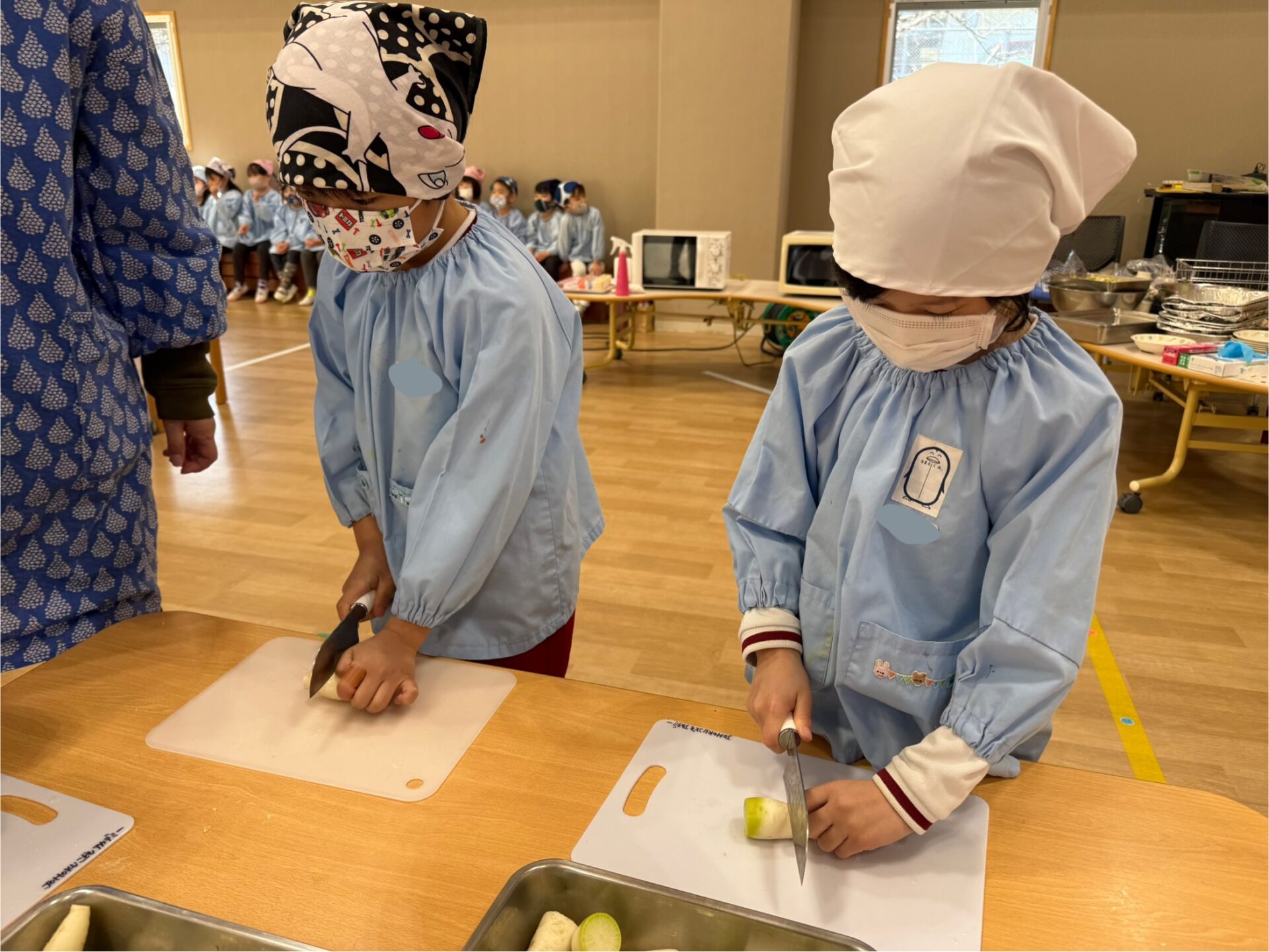 包丁で食材を切る表情は真剣そのもの。「かたいね」「においがするよ」と気づきもいっぱい。