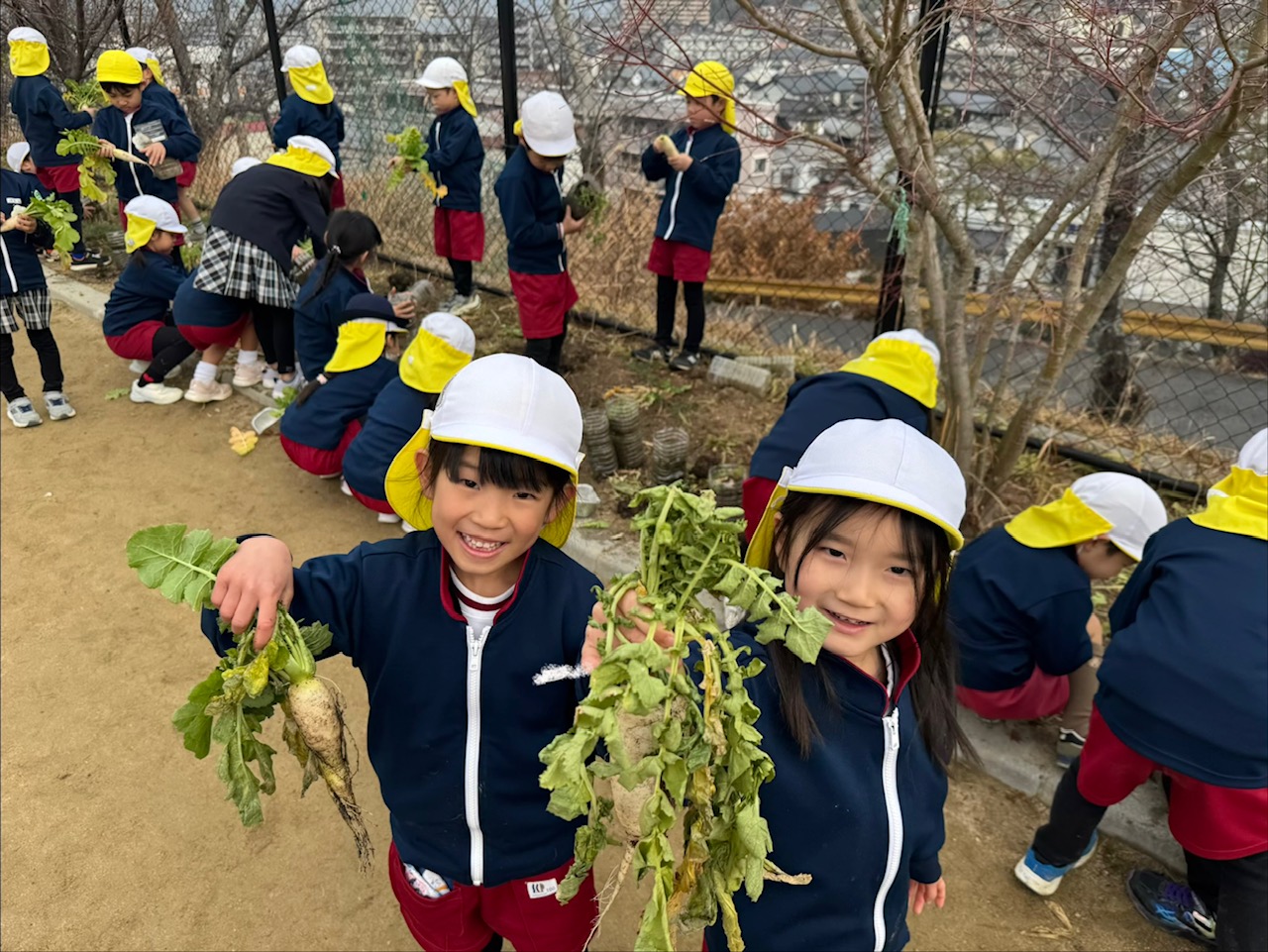 「見て見て!できてる!」「ちょっと曲がってるよ!」「赤ちゃん大根みたい!」