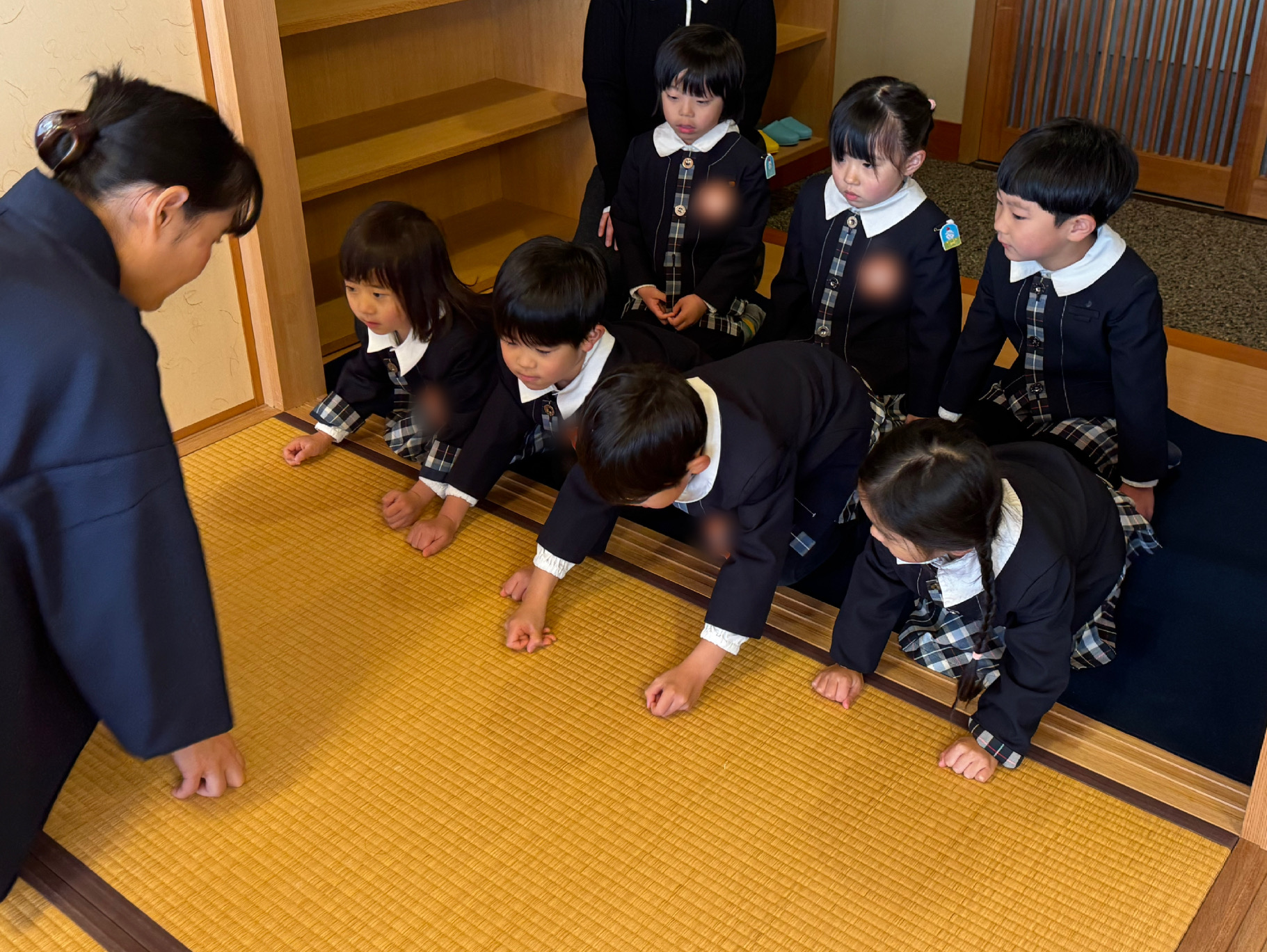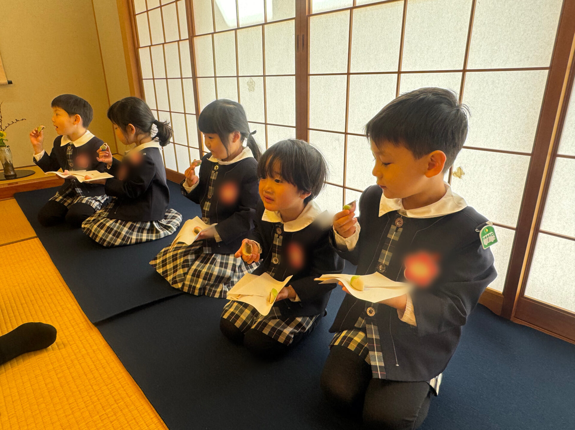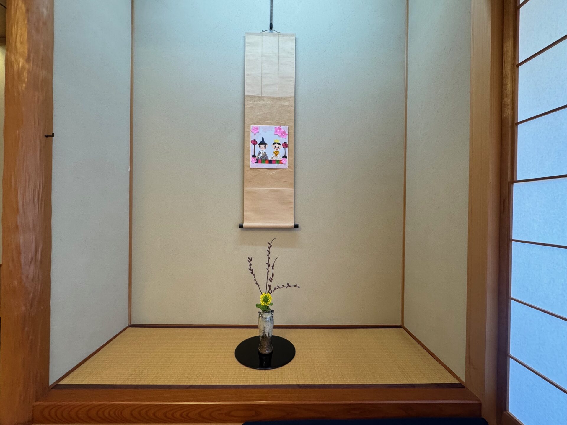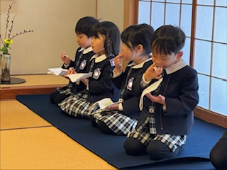 はじめに、お茶の先生と役員のお母様方へ挨拶をしました。背筋を伸ばし、心を込めて挨拶する姿がとても立派です。床の間には、園児が心を込めて作ったお雛様の掛け軸や三次人形(天神)が飾られ、春を感じさせる猫柳と菜の花がやさしく彩りを添えていました。「きれいだね。」「春みたい!」と嬉しそうに眺める姿が印象的でした🌸