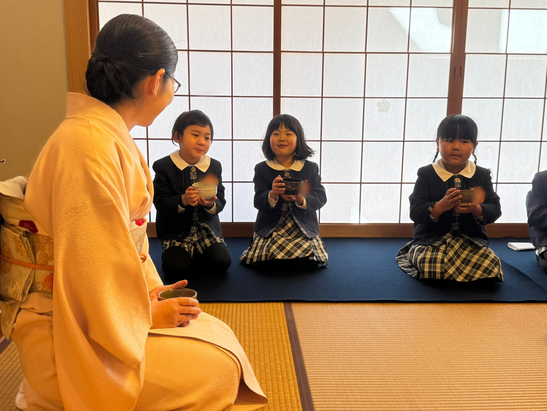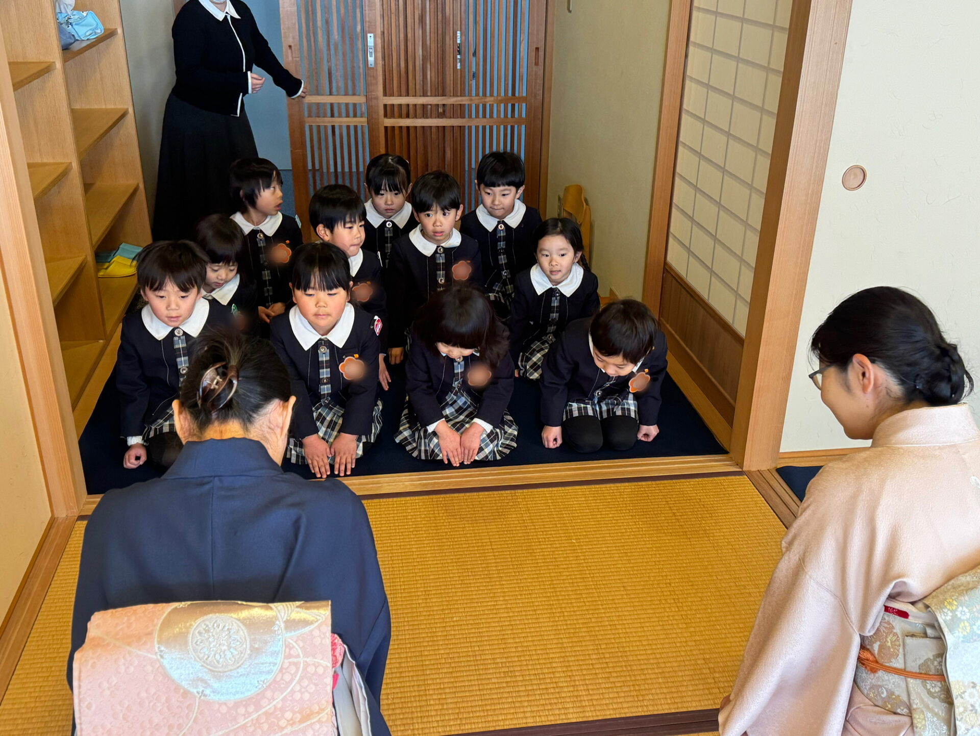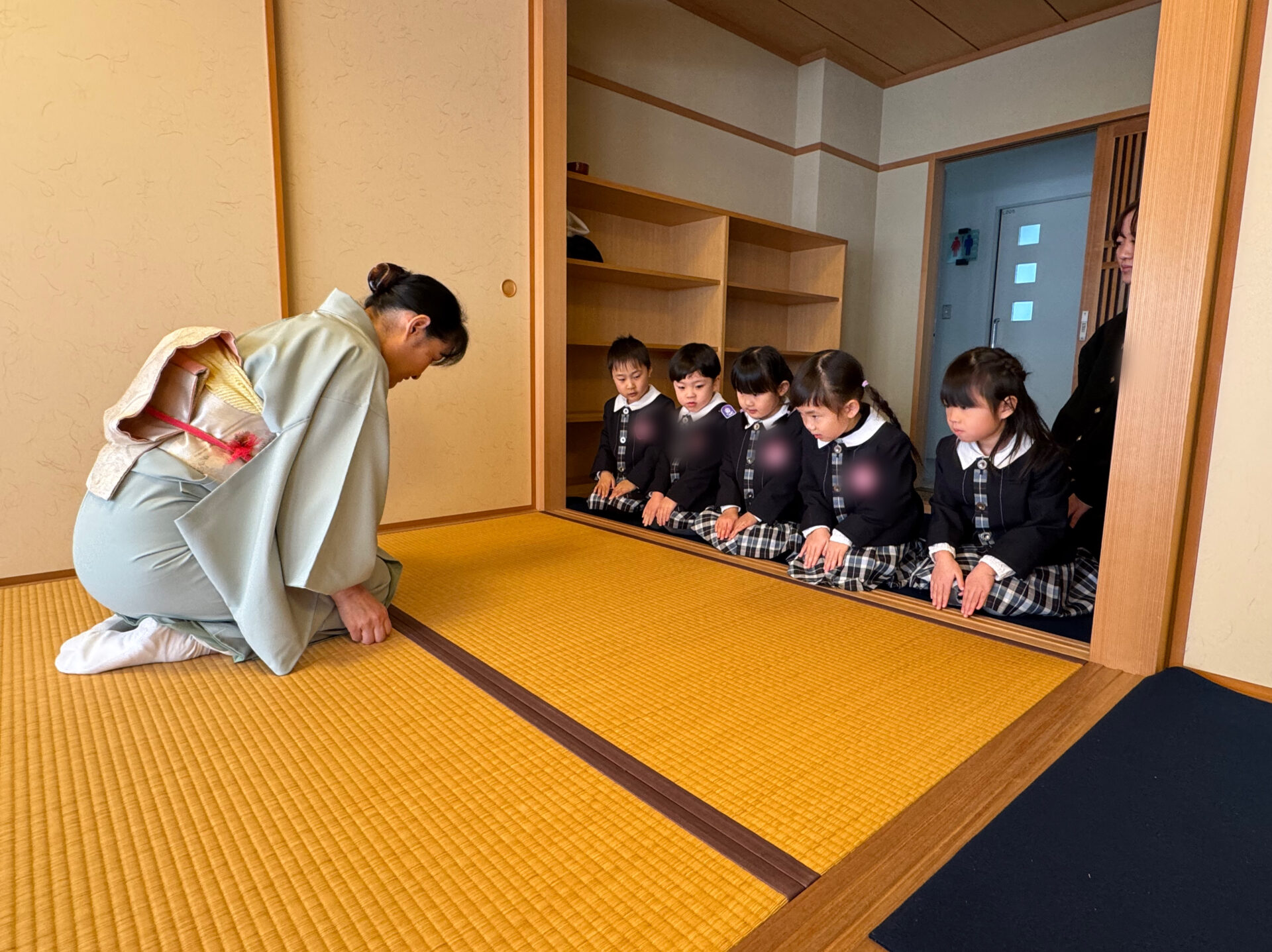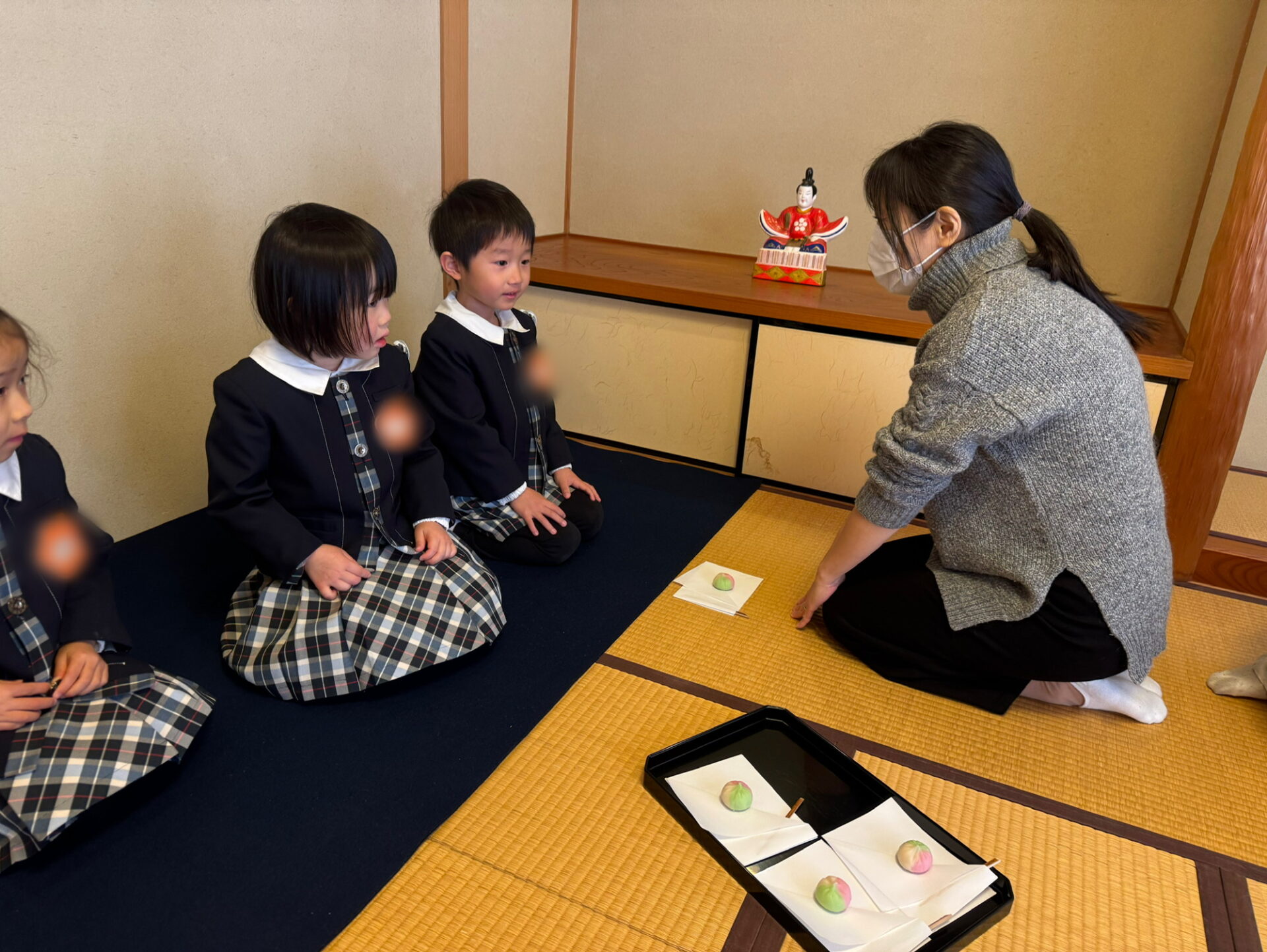 はじめに、お茶の先生と役員のお母様方へ挨拶をしました。背筋を伸ばし、心を込めて挨拶する姿がとても立派です。床の間には、園児が心を込めて作ったお雛様の掛け軸や三次人形(天神)が飾られ、春を感じさせる猫柳と菜の花がやさしく彩りを添えていました。「きれいだね。」「春みたい!」と嬉しそうに眺める姿が印象的でした🌸