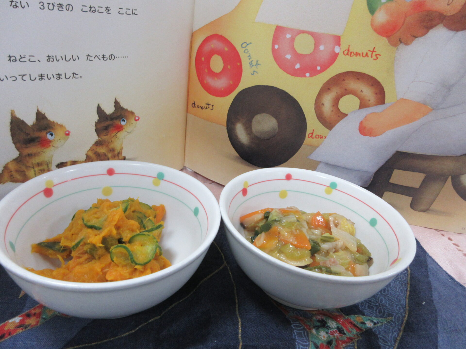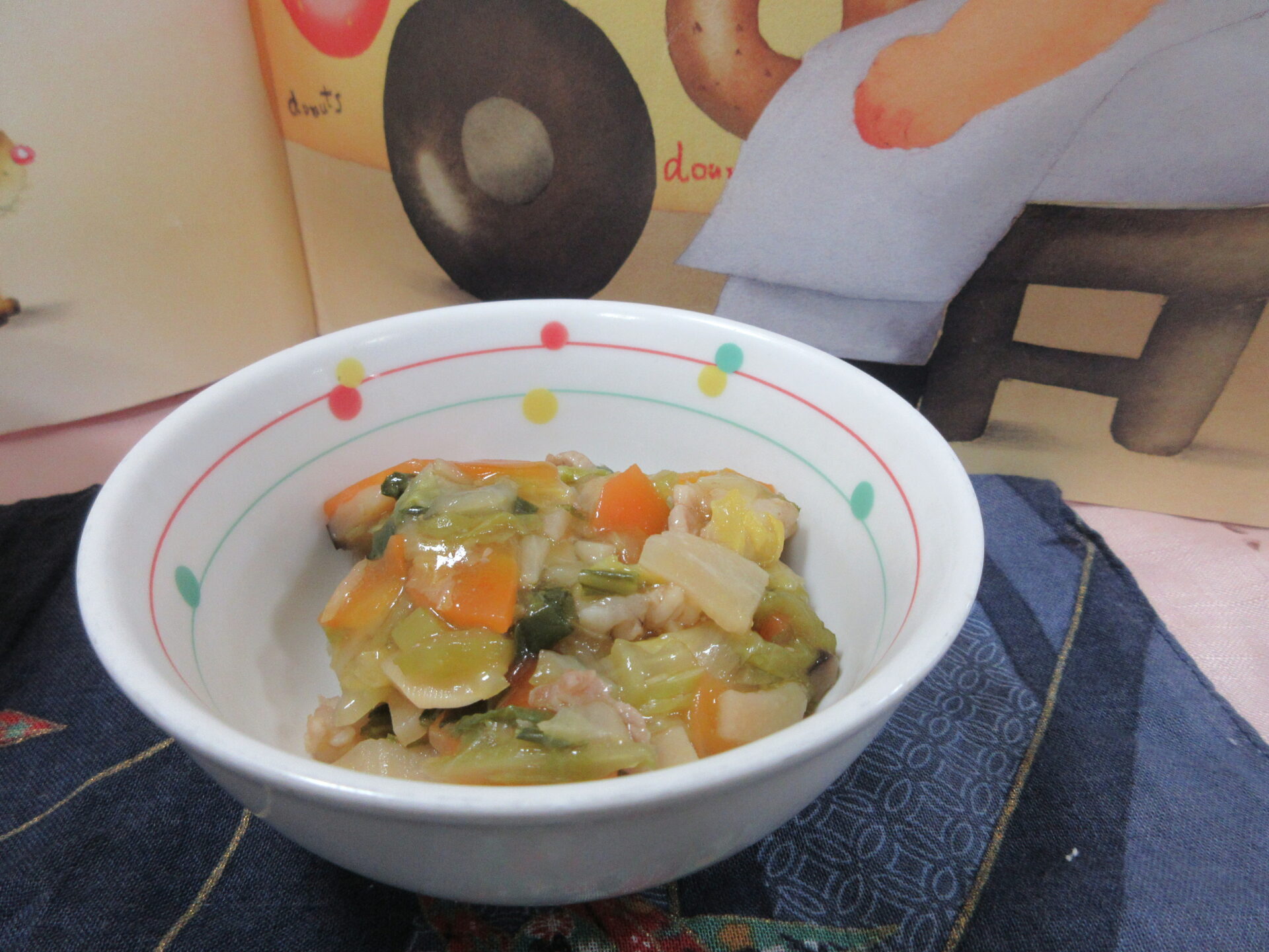白米もちもちご飯ととろみも美味しい五宝菜を食べました。かぼちゃサラダは甘く、味噌汁は具沢山で栄養豊富でした。