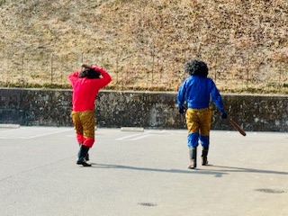 たくさん投げて、これで鬼も退治できたかなと思っていたら…何やら遠くから『ドドドド‼』と太鼓の音が聞こえます。「ん!何か聞こえるよ?」音のする方を振り向くと…なんと動く赤鬼と青鬼がこちらに向かってくるではありませんか!その姿をみて一瞬びっくりした園児たちですが、さすがJOHOKUこどもアカデミーの園児たち!すぐさま手作りの鬼豆を手に取り、「おにはーそとー!」とみんなで力を合わせて鬼に立ち向かって行きました。園児たちと鬼の攻防がしばらく続きましたが、園児たちのパワーに負けた鬼たちは最後には逃げ帰って行きました。