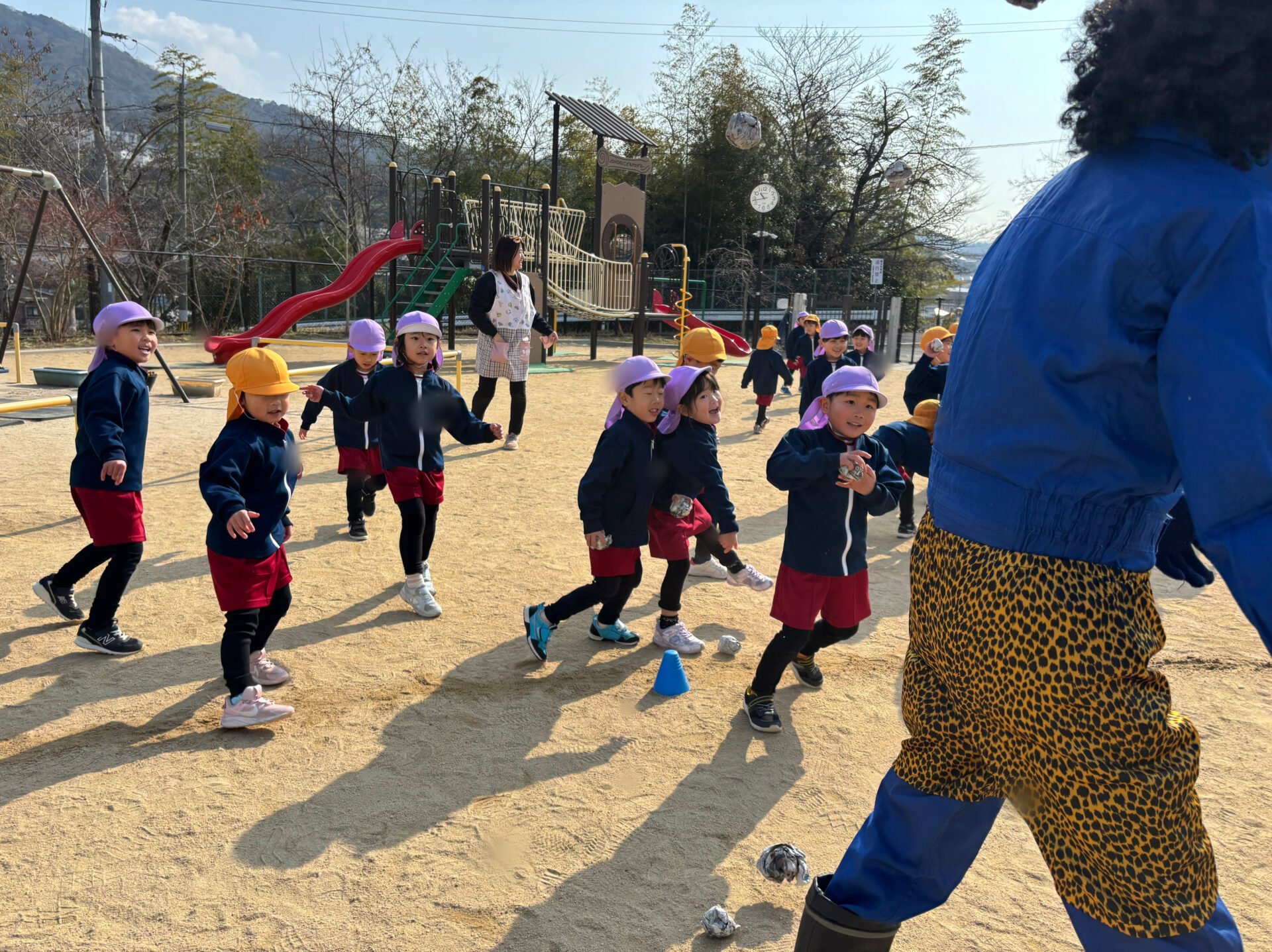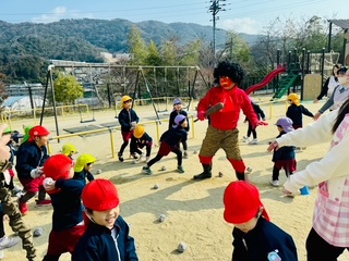 年少組と年中組は園庭で豆まき会を行いました。初めにしっかり豆を投げられるようにみんなで「赤鬼と青鬼のタンゴ」の曲に合わせて準備体操をしました。