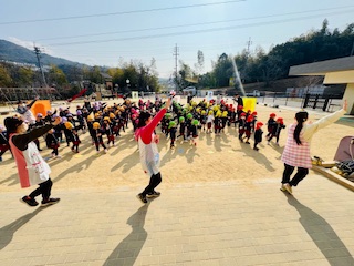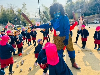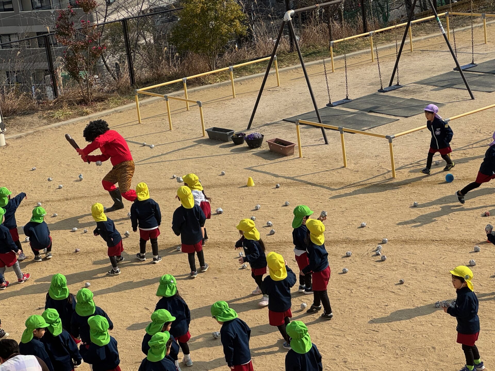 たくさん投げて、これで鬼も退治できたかなと思っていたら…何やら遠くから『ドドドド‼』と太鼓の音が聞こえます。「ん!何か聞こえるよ?」音のする方を振り向くと…なんと動く赤鬼と青鬼がこちらに向かってくるではありませんか!その姿をみて一瞬びっくりした園児たちですが、さすがJOHOKUこどもアカデミーの園児たち!すぐさま手作りの鬼豆を手に取り、「おにはーそとー!」とみんなで力を合わせて鬼に立ち向かって行きました。園児たちと鬼の攻防がしばらく続きましたが、園児たちのパワーに負けた鬼たちは最後には逃げ帰って行きました。