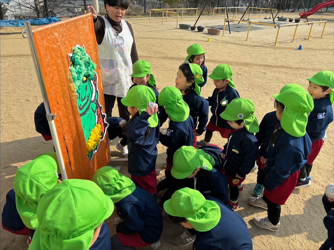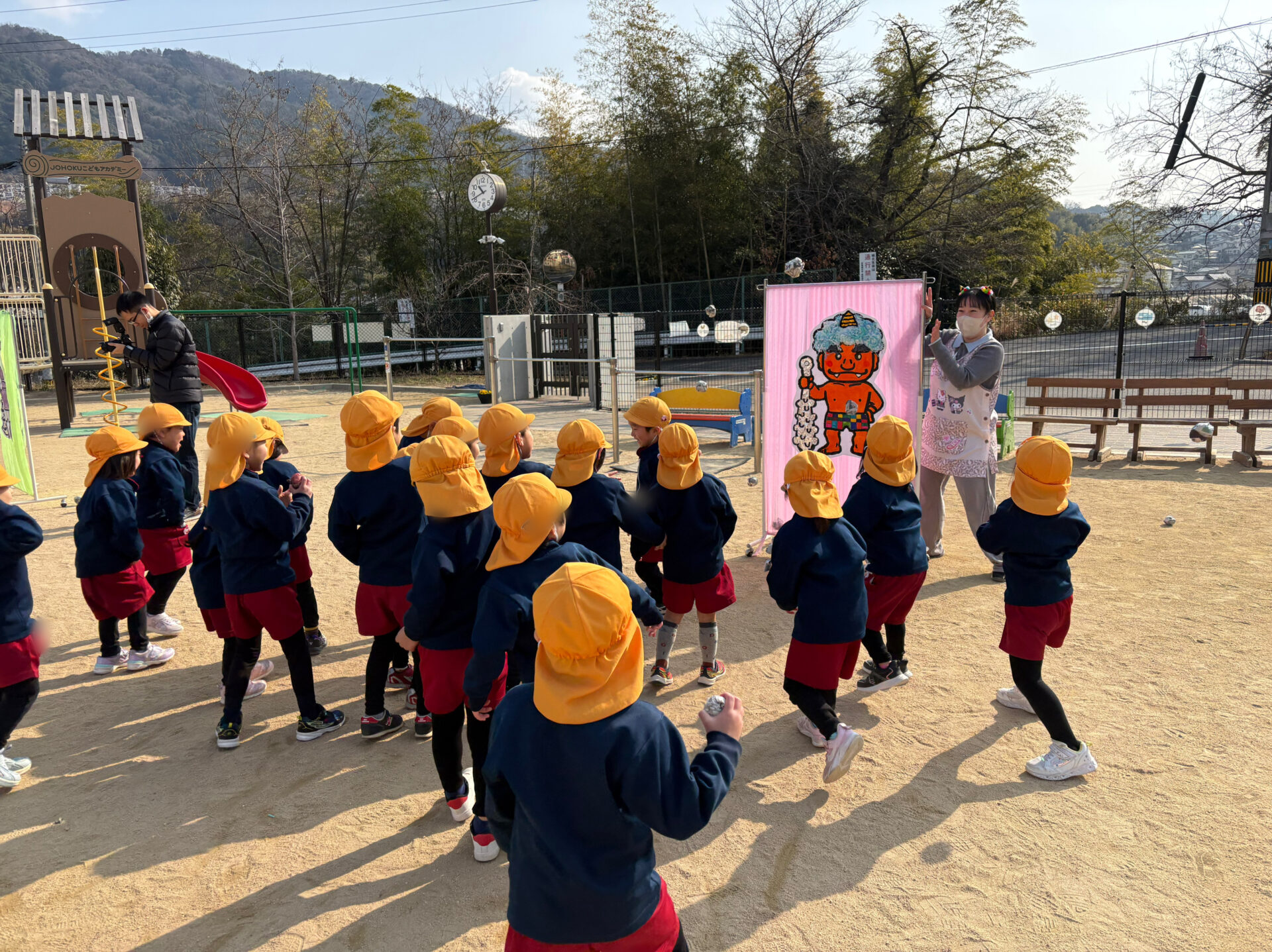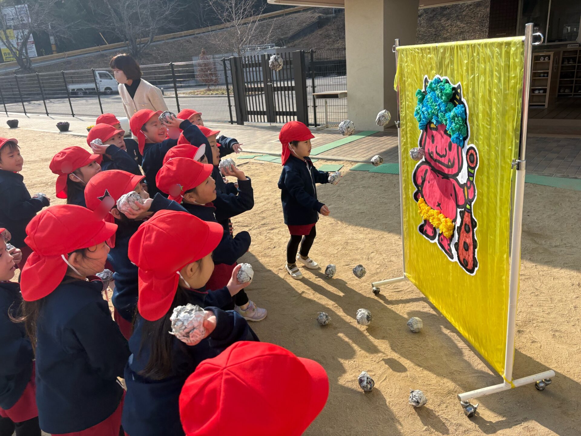 年少組と年中組は園庭で豆まき会を行いました。初めにしっかり豆を投げられるようにみんなで「赤鬼と青鬼のタンゴ」の曲に合わせて準備体操をしました。