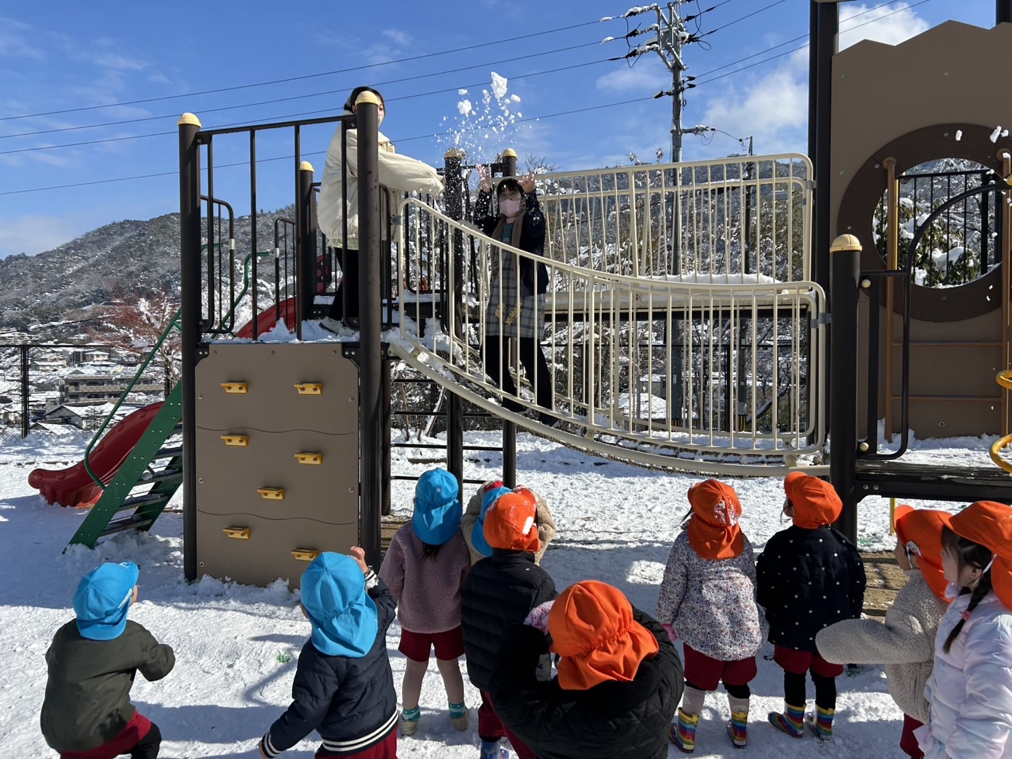 総合遊具から保育教諭が雪を降らせると大喜びです!