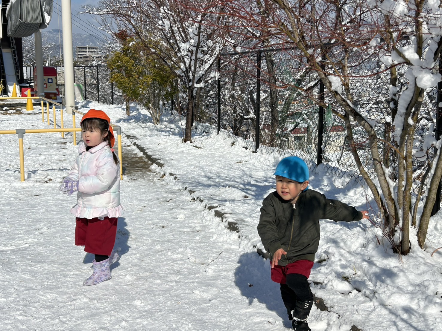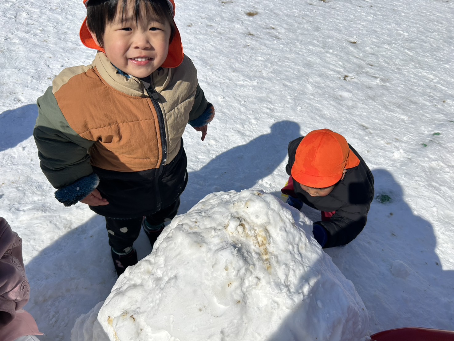 たくさん積もった雪の上を走ったり、幼児組さんが作ったかまくらや雪だるまに興味を持ったりしていました⛄