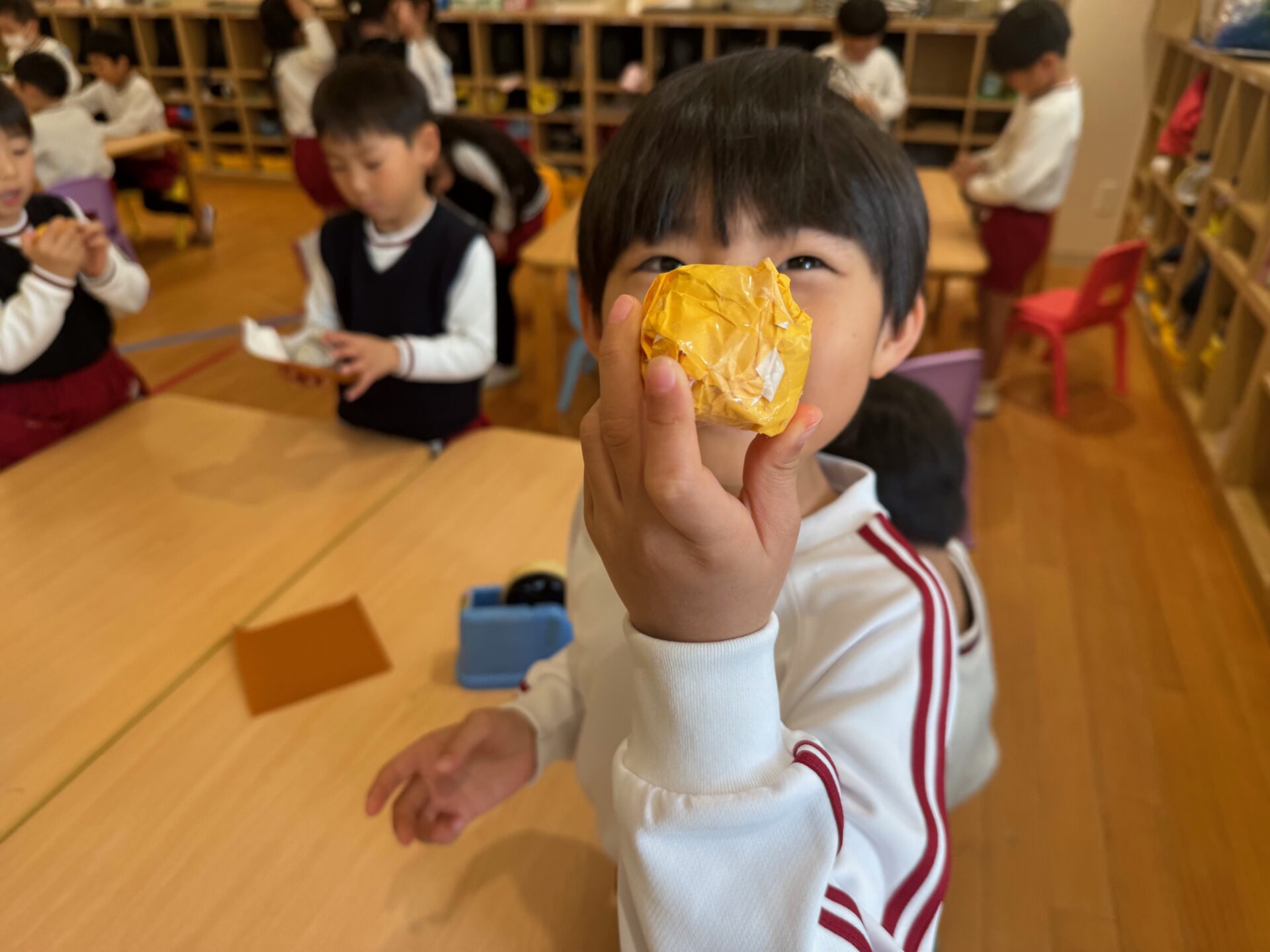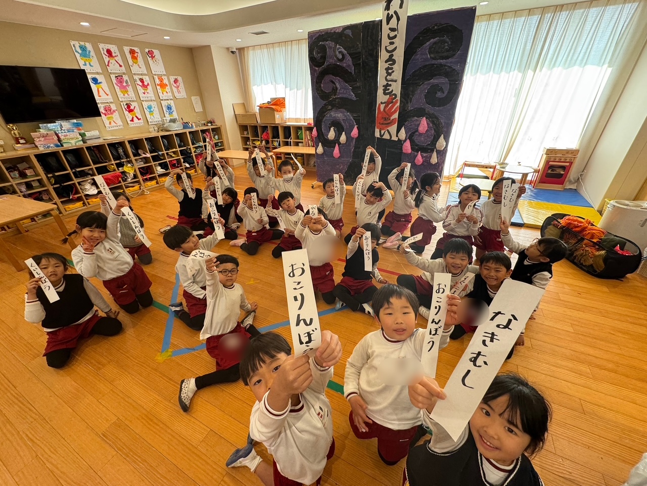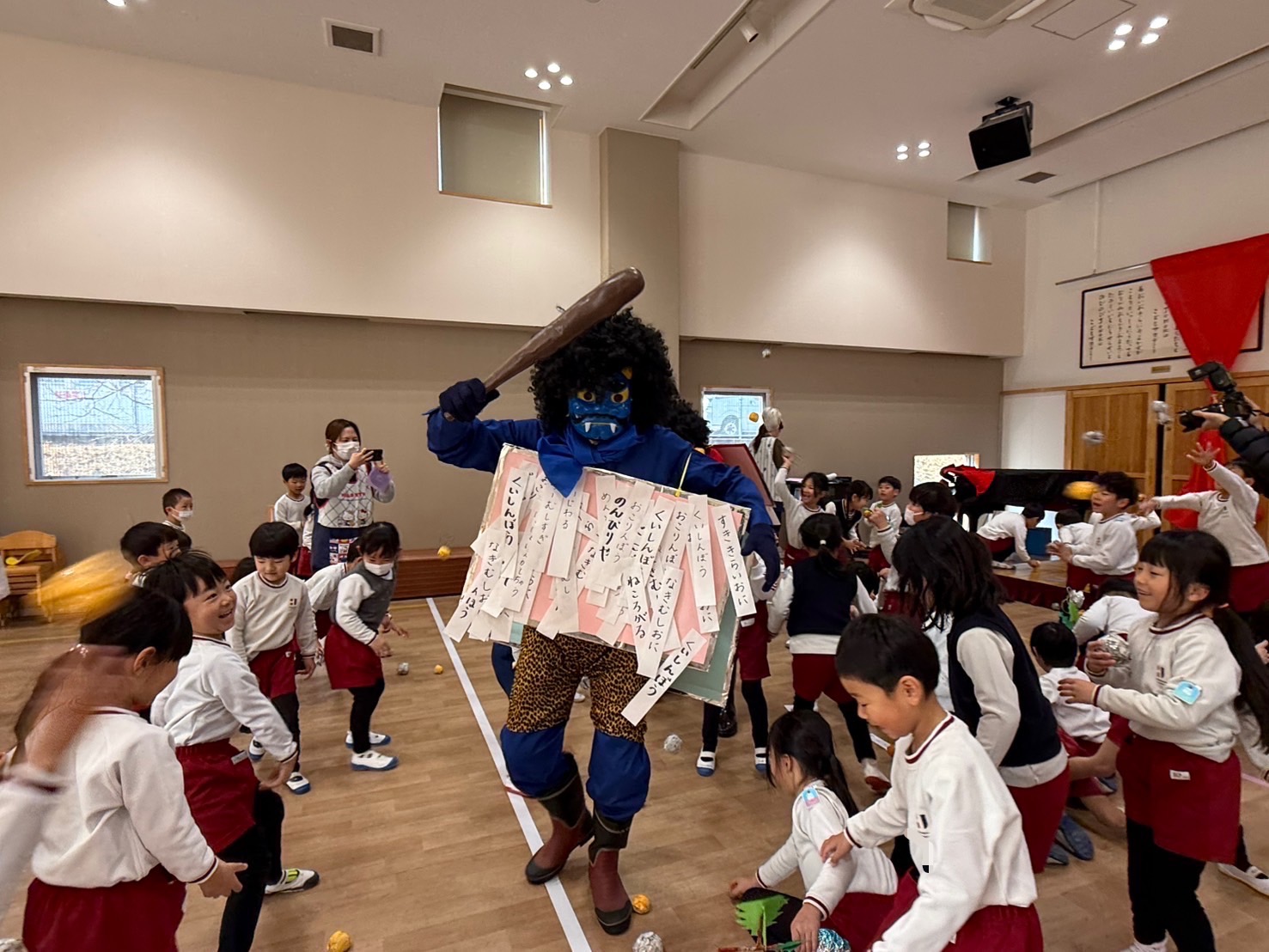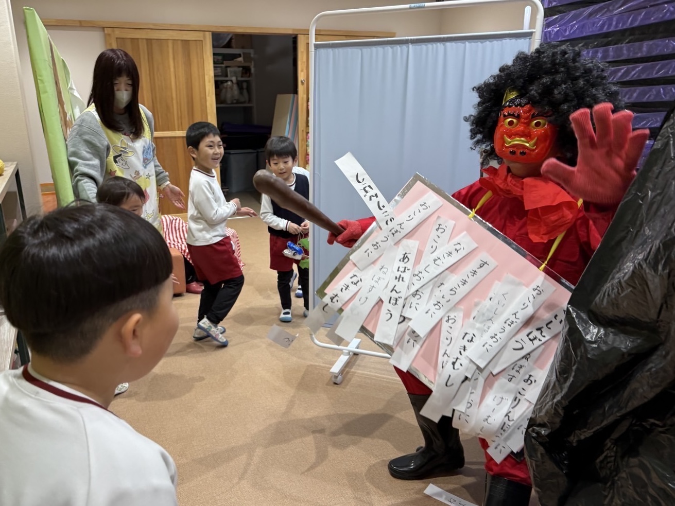 今日は節分の豆まきを行いました。戸外遊びから保育室に戻ると、そこには鬼からの手紙が——。突然の出来事に、子どもたちは思わずドキッ。