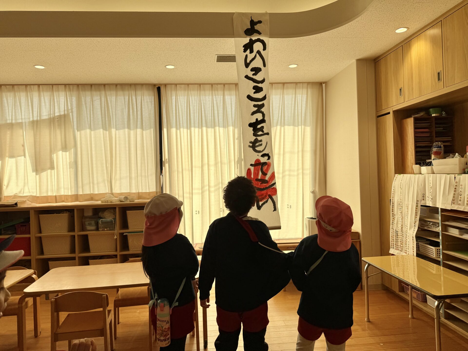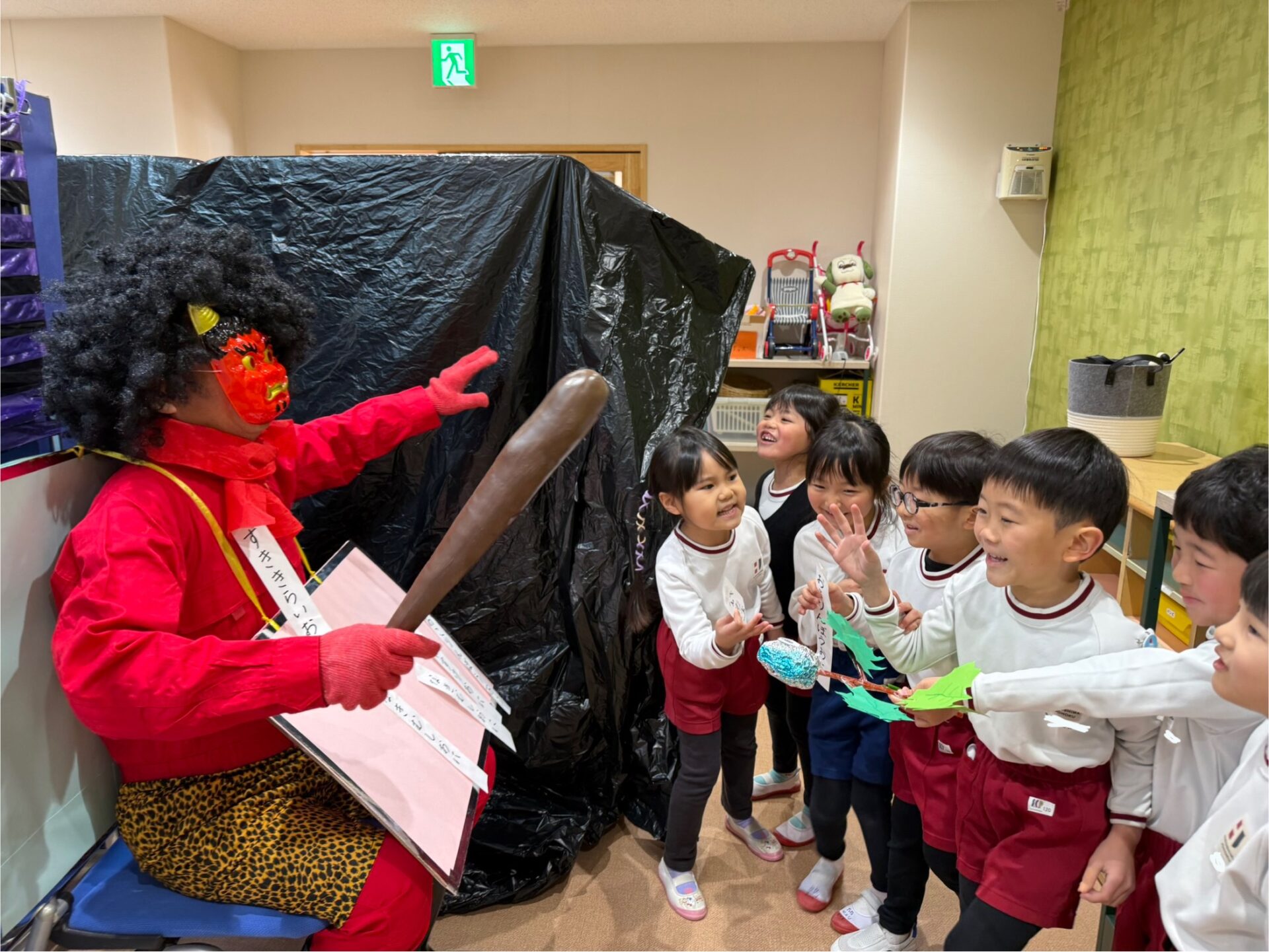 今日は節分の豆まきを行いました。戸外遊びから保育室に戻ると、そこには鬼からの手紙が——。突然の出来事に、子どもたちは思わずドキッ。