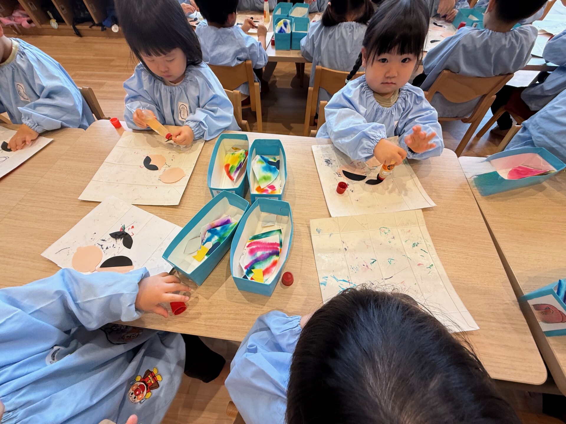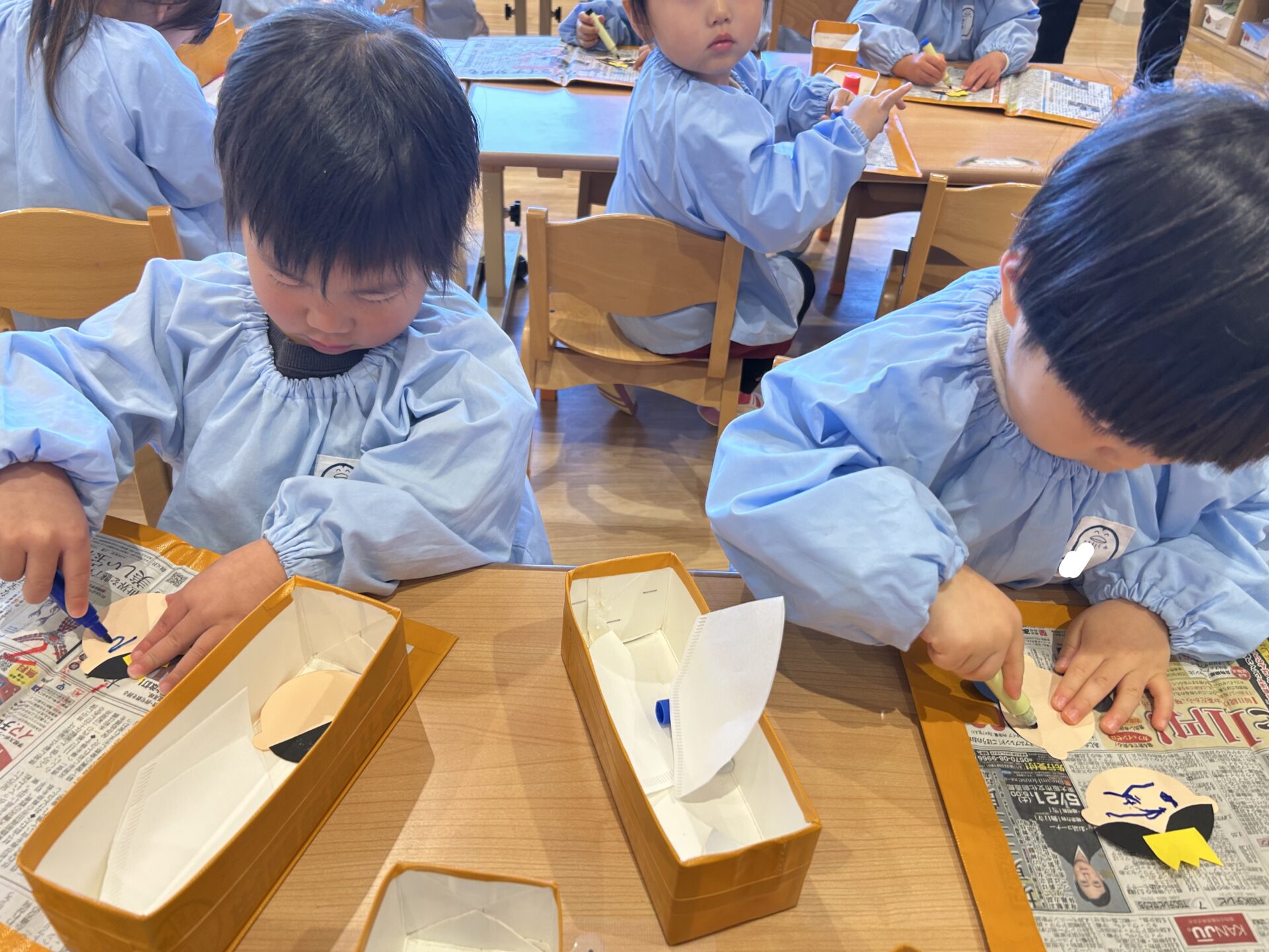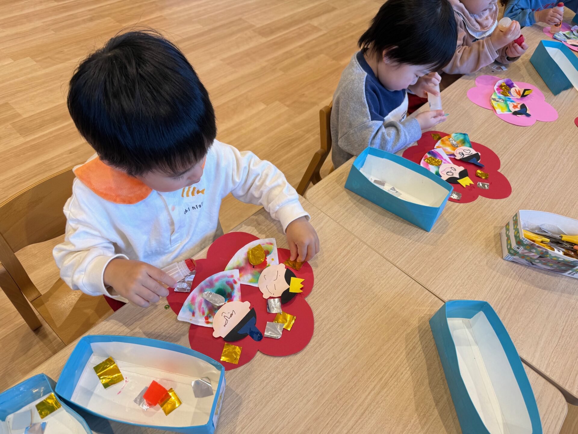 ♬あかりを つけましょう ぼんぼりに~♬『うれしい ひなまつり』の歌をうたってから「もうすぐひな祭りだね」「お内裏様は男の子?」などのやりとりを楽しみ、ひな祭りへの期待をふくらませながら製作をしました。