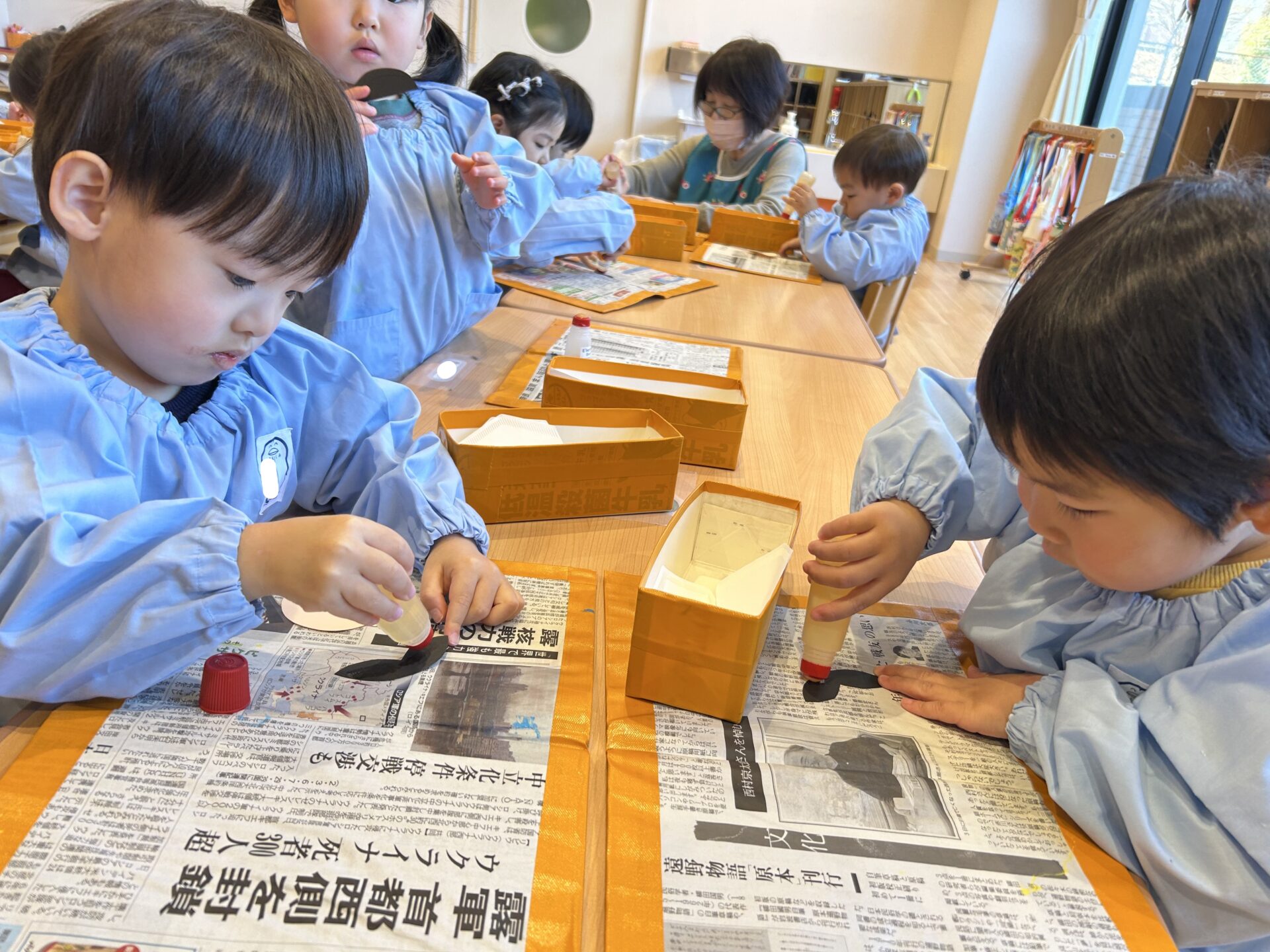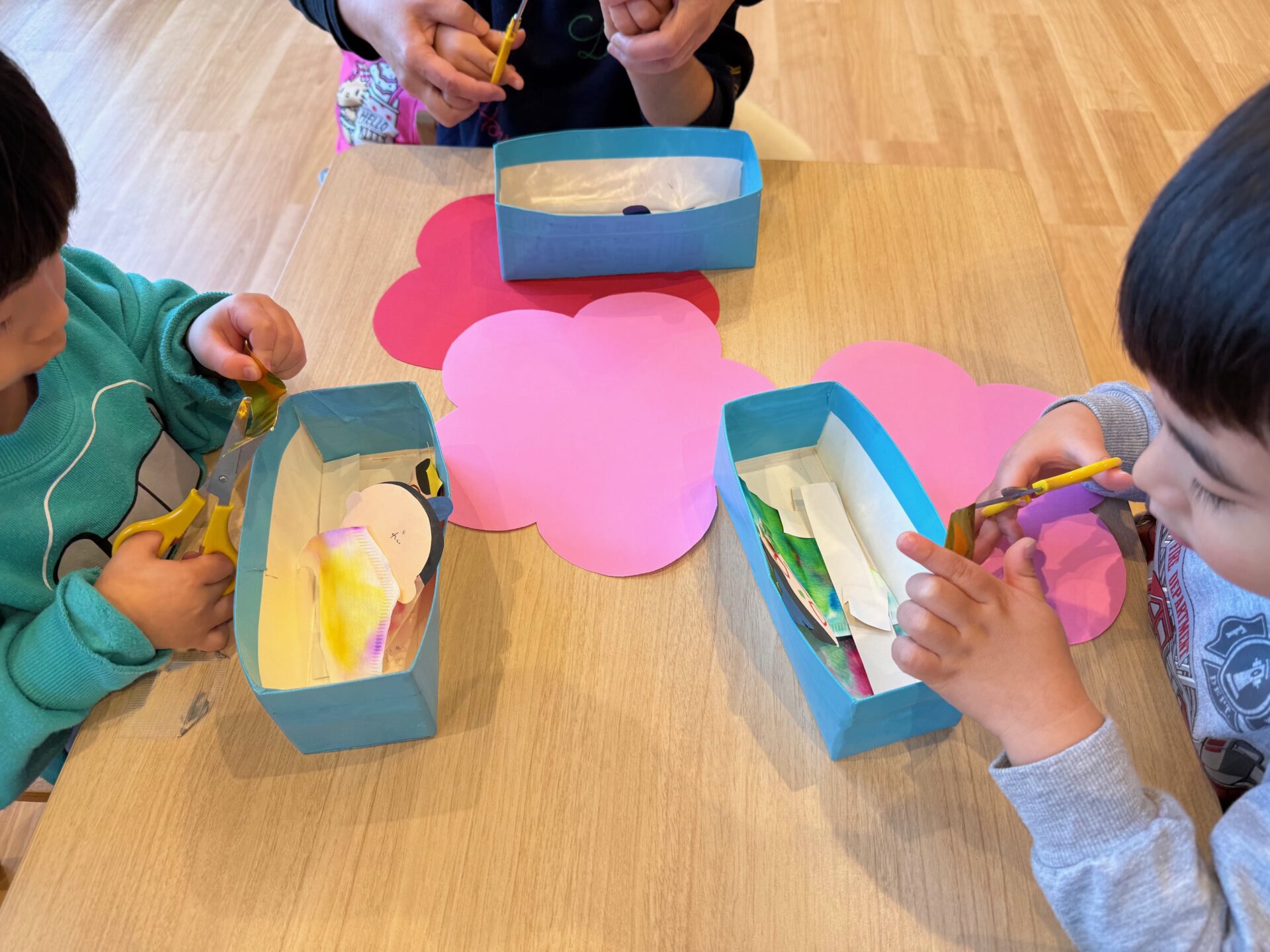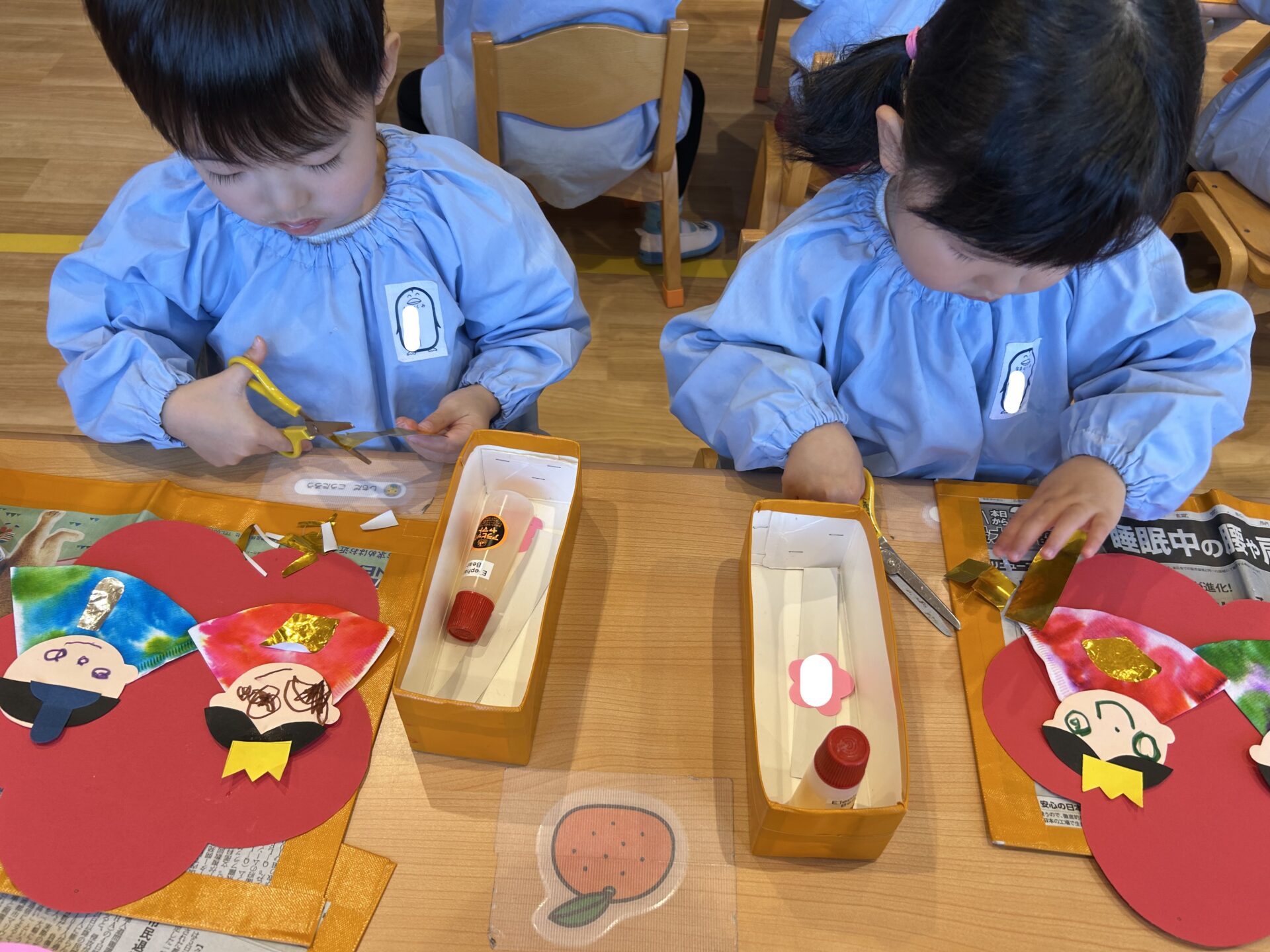 ♬あかりを つけましょう ぼんぼりに~♬『うれしい ひなまつり』の歌をうたってから「もうすぐひな祭りだね」「お内裏様は男の子?」などのやりとりを楽しみ、ひな祭りへの期待をふくらませながら製作をしました。