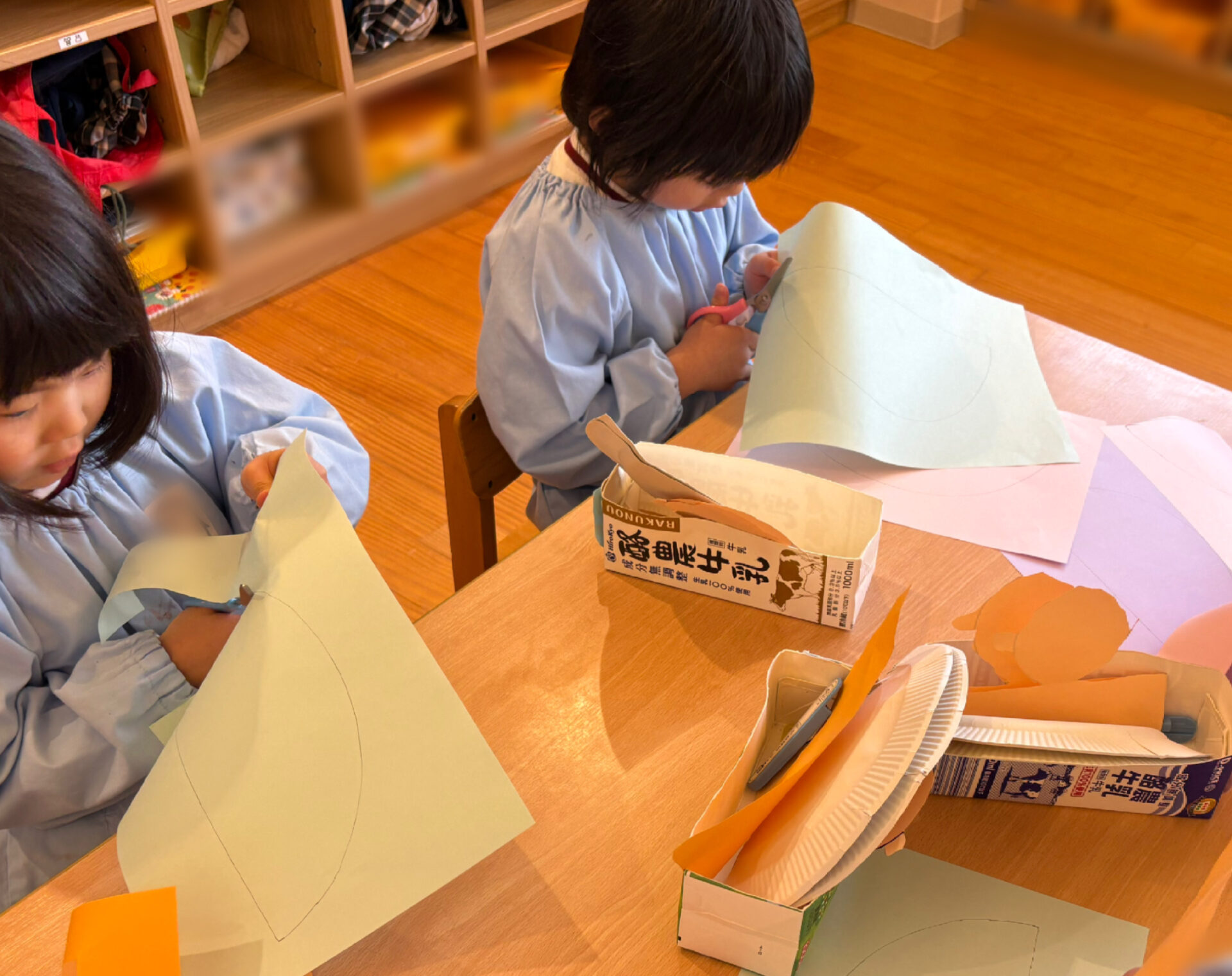 紙皿を半分に切り、くるっと丸めて着物の形に。そこへ、さらに園児が思い思いにデザインした着物を着せていきました。