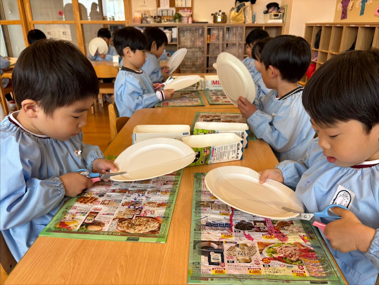 紙皿を半分に切り、くるっと丸めて着物の形に。そこへ、さらに園児が思い思いにデザインした着物を着せていきました。