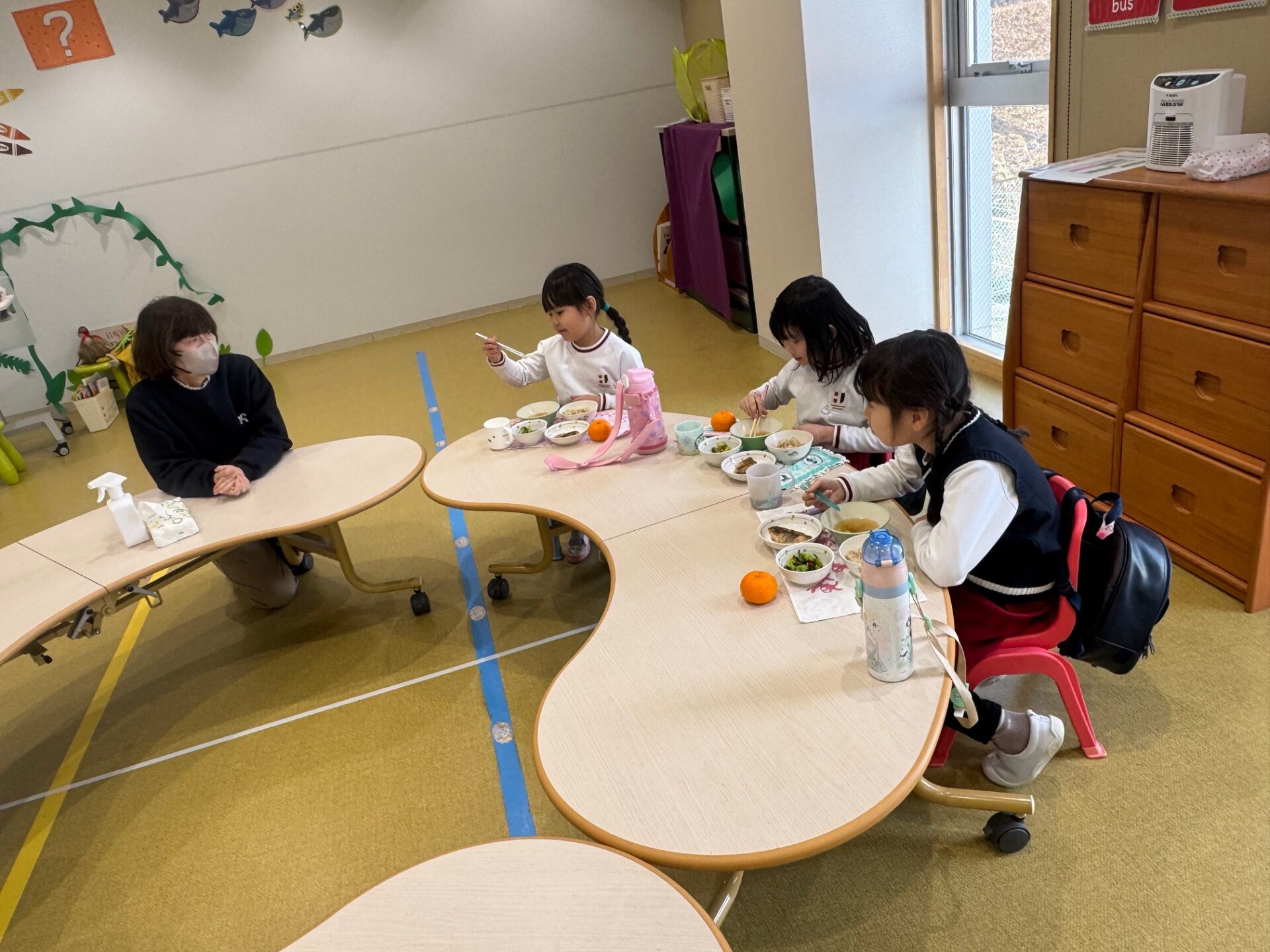 いつもと違う雰囲気で食べる給食・・・園長先生といろいろな話をしながら楽しく食べました!!食事の後は、トランプ遊びもしましたよ😊。