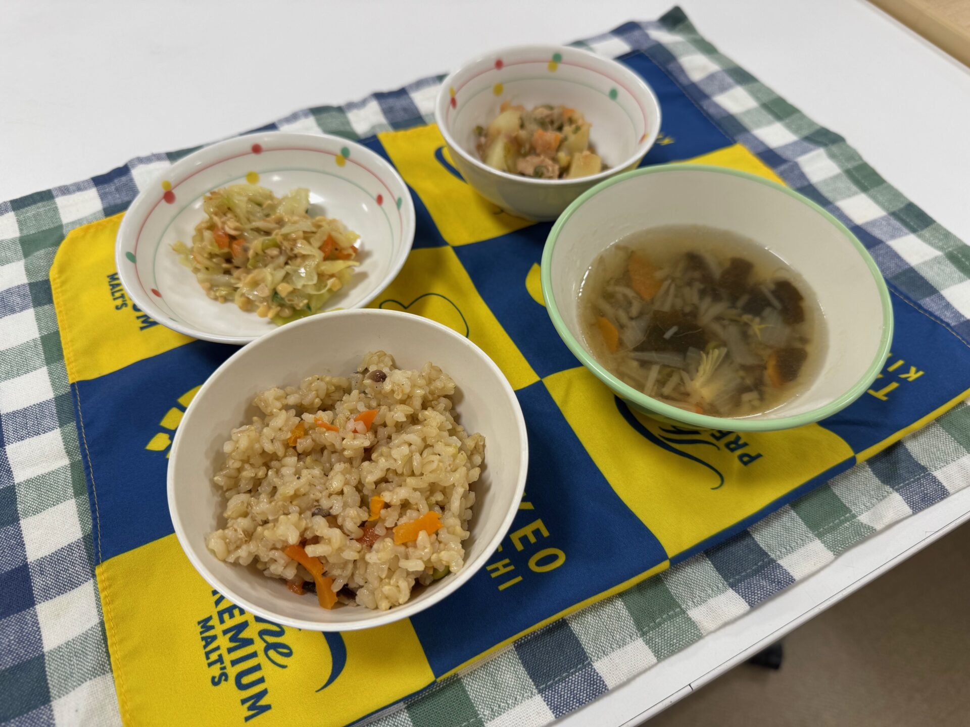 発芽玄米の炊き込み、椎茸ご飯はとても美味しかったです。ホクホクのじゃが芋とツナの煮物やおかか味キャベツ納豆で完璧な献立でした。🏅