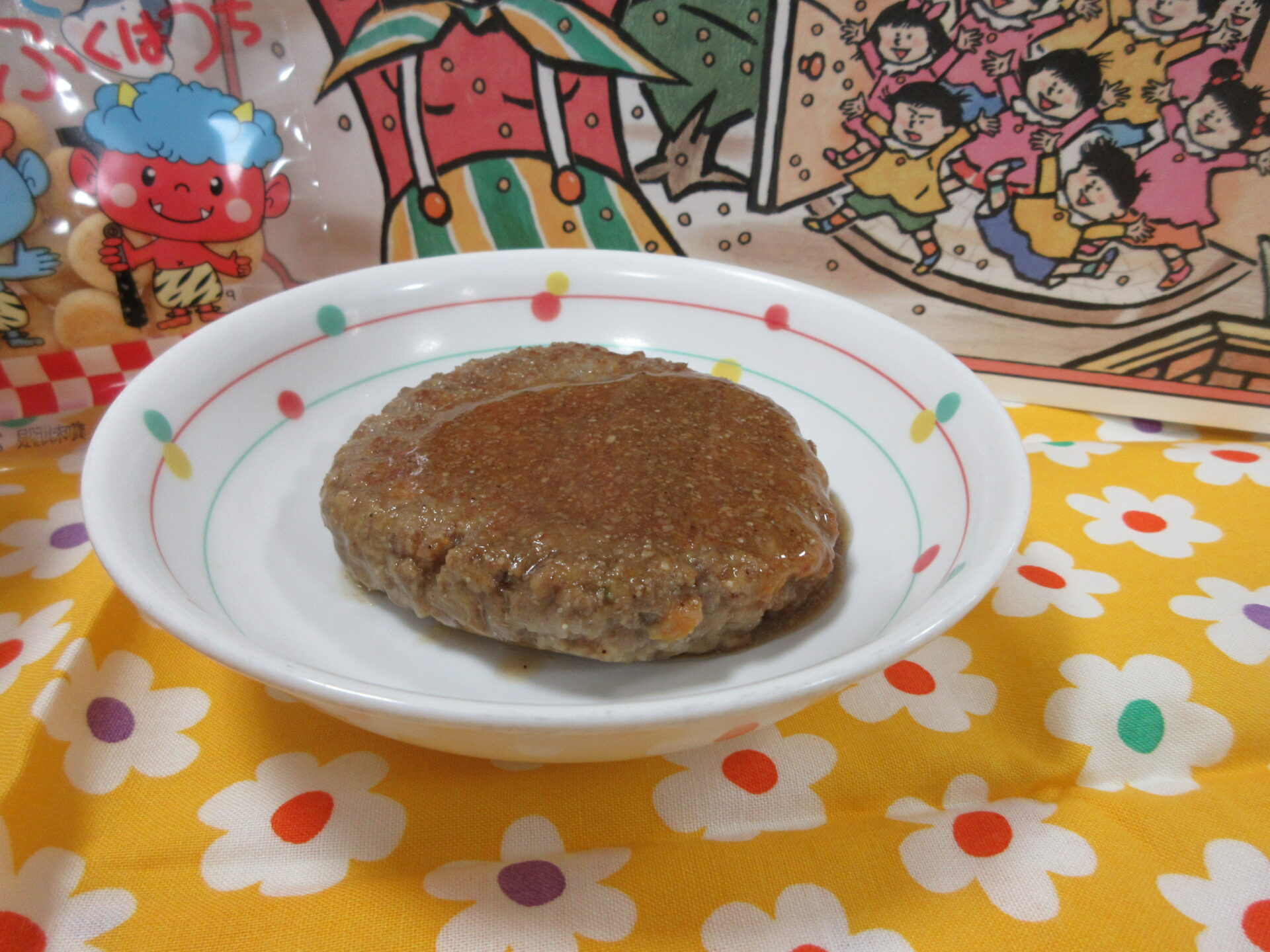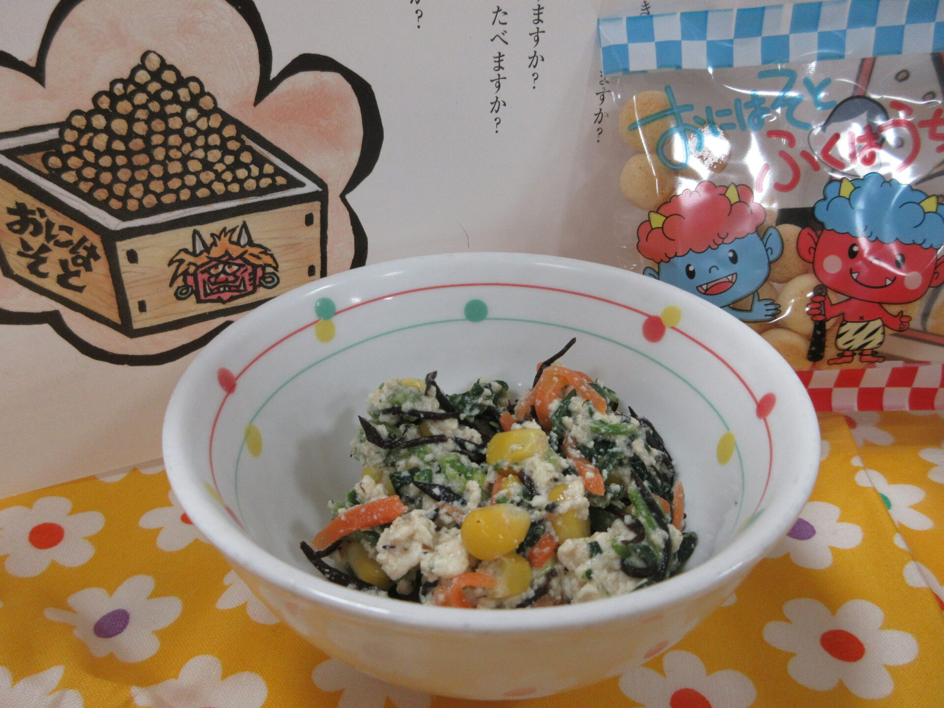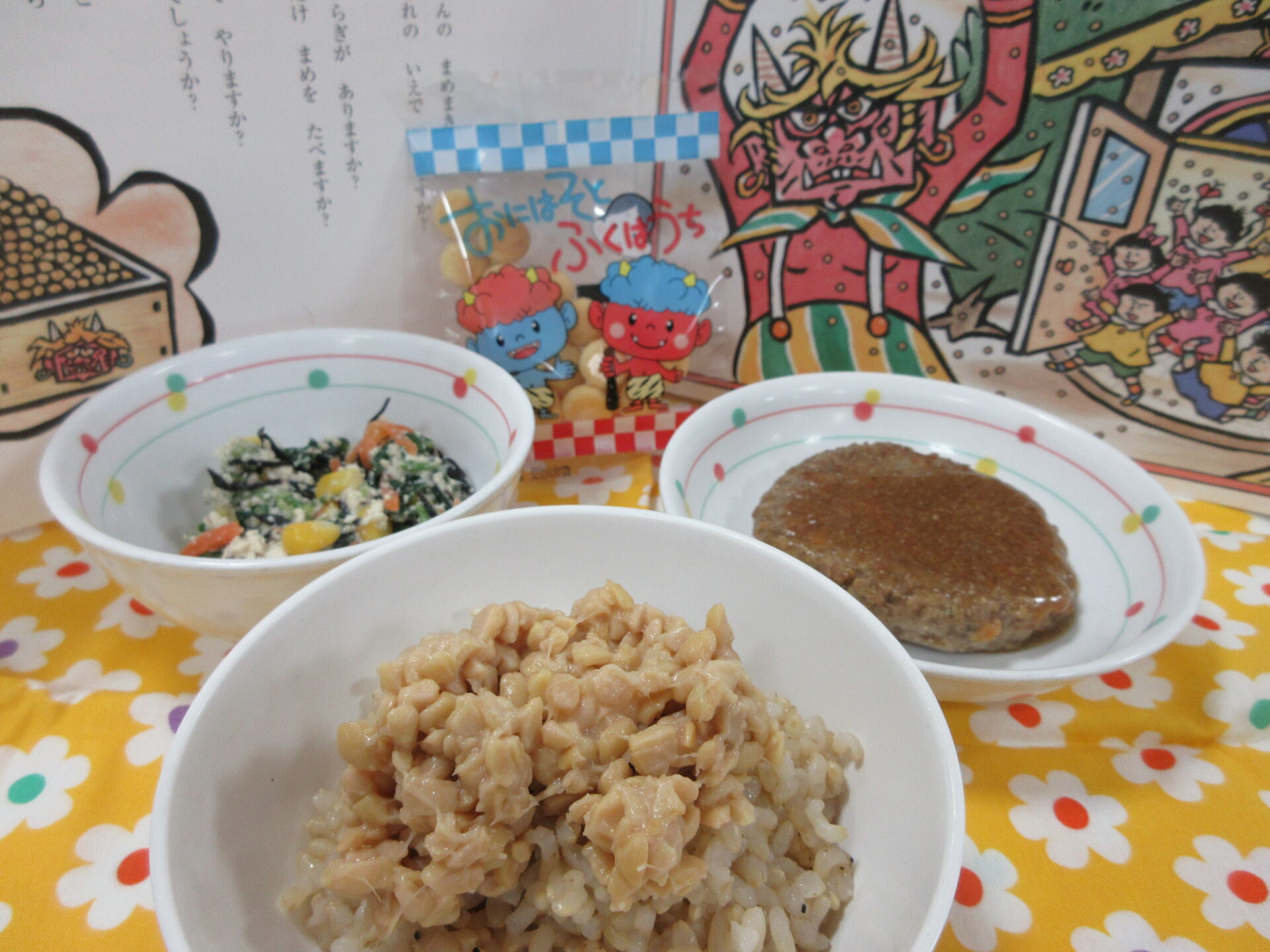 【発芽玄米納豆かけご飯 イワシバーグ ほうれん草の白和え 味噌汁 節分ボーロ】