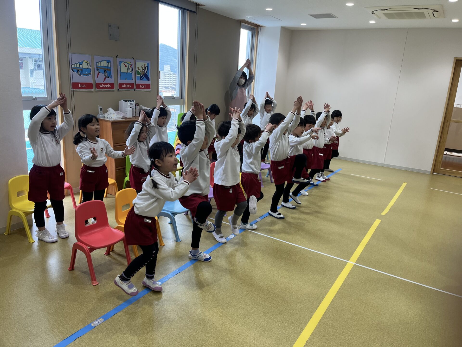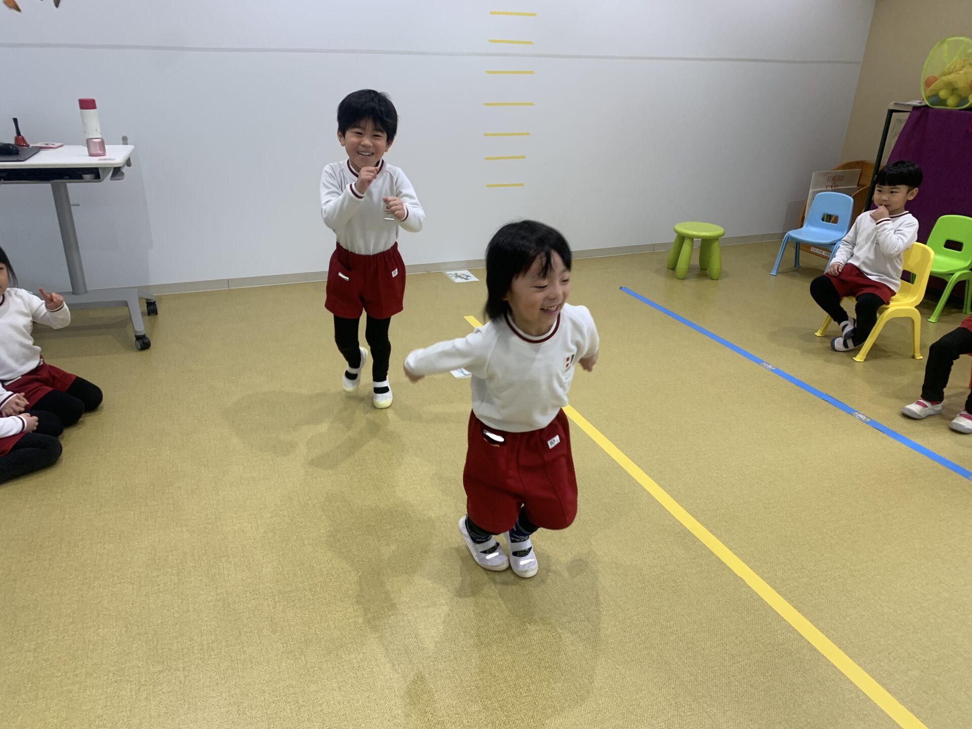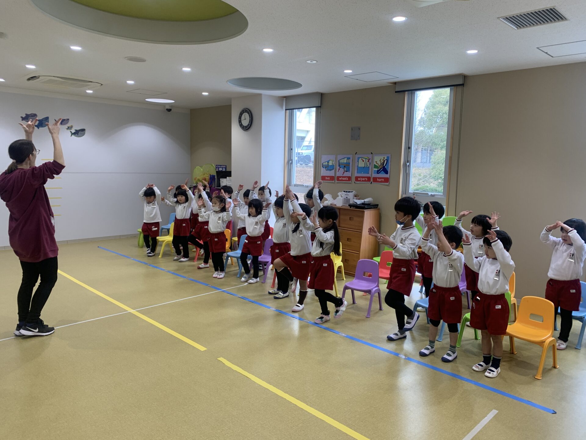 今日は「Jump⬆️! Swim🏊! Climb🧗! Run🏃!」と、たくさん体を動かす英語あそびを行いました。