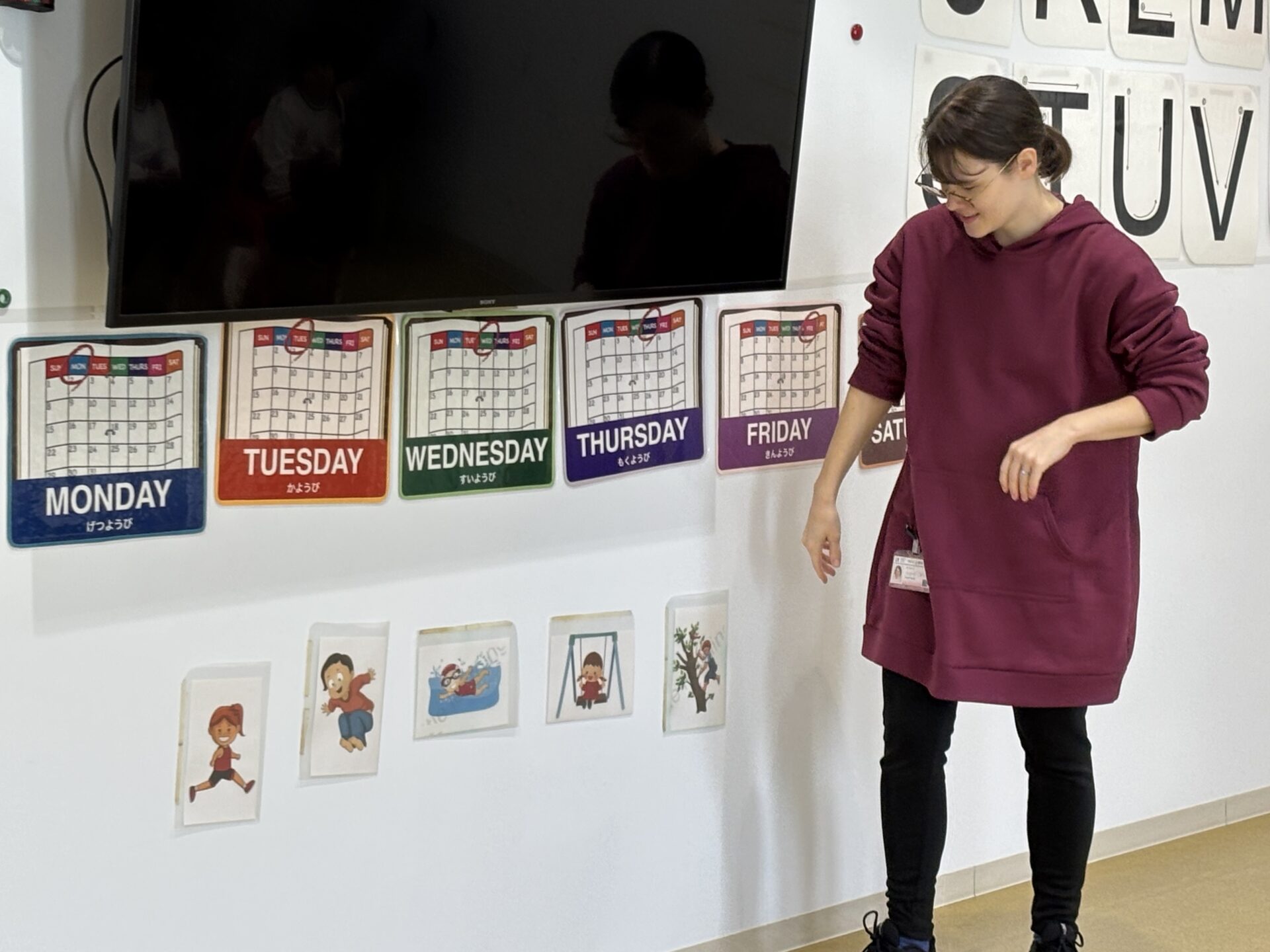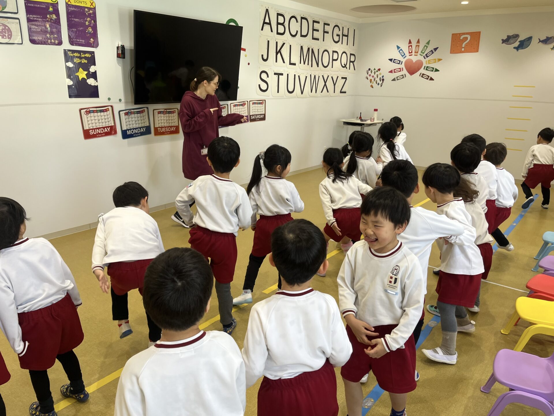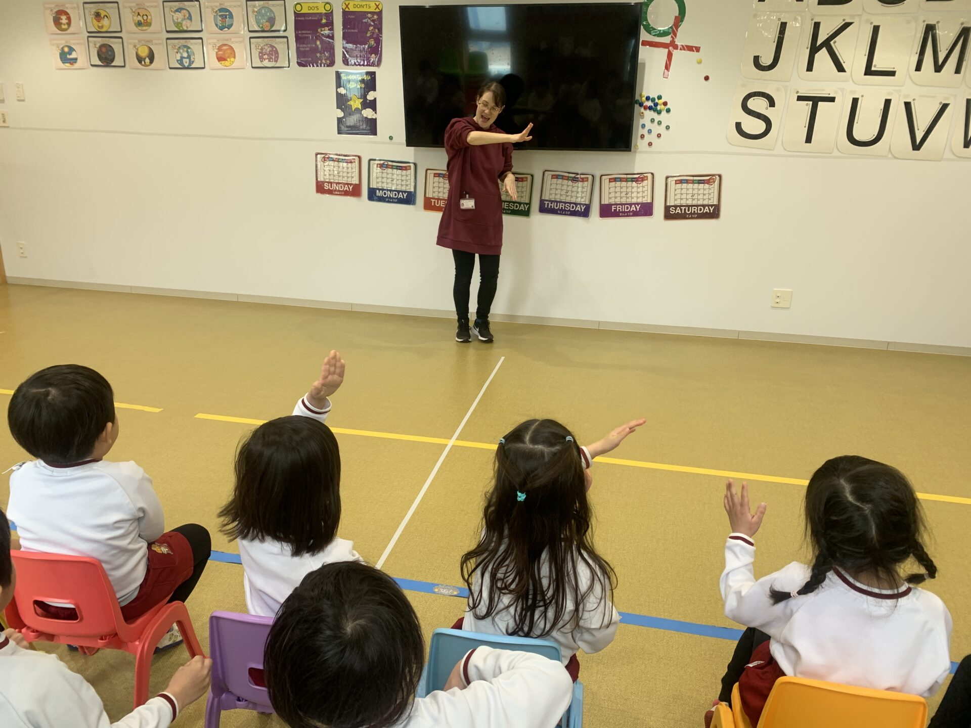 レッスンの最後には、先月から練習している「Days of the Week🗓️」の歌を歌いました。ジェスチャーをしっかり覚えている子が多く、歌詞も少しずつ覚え始めています。