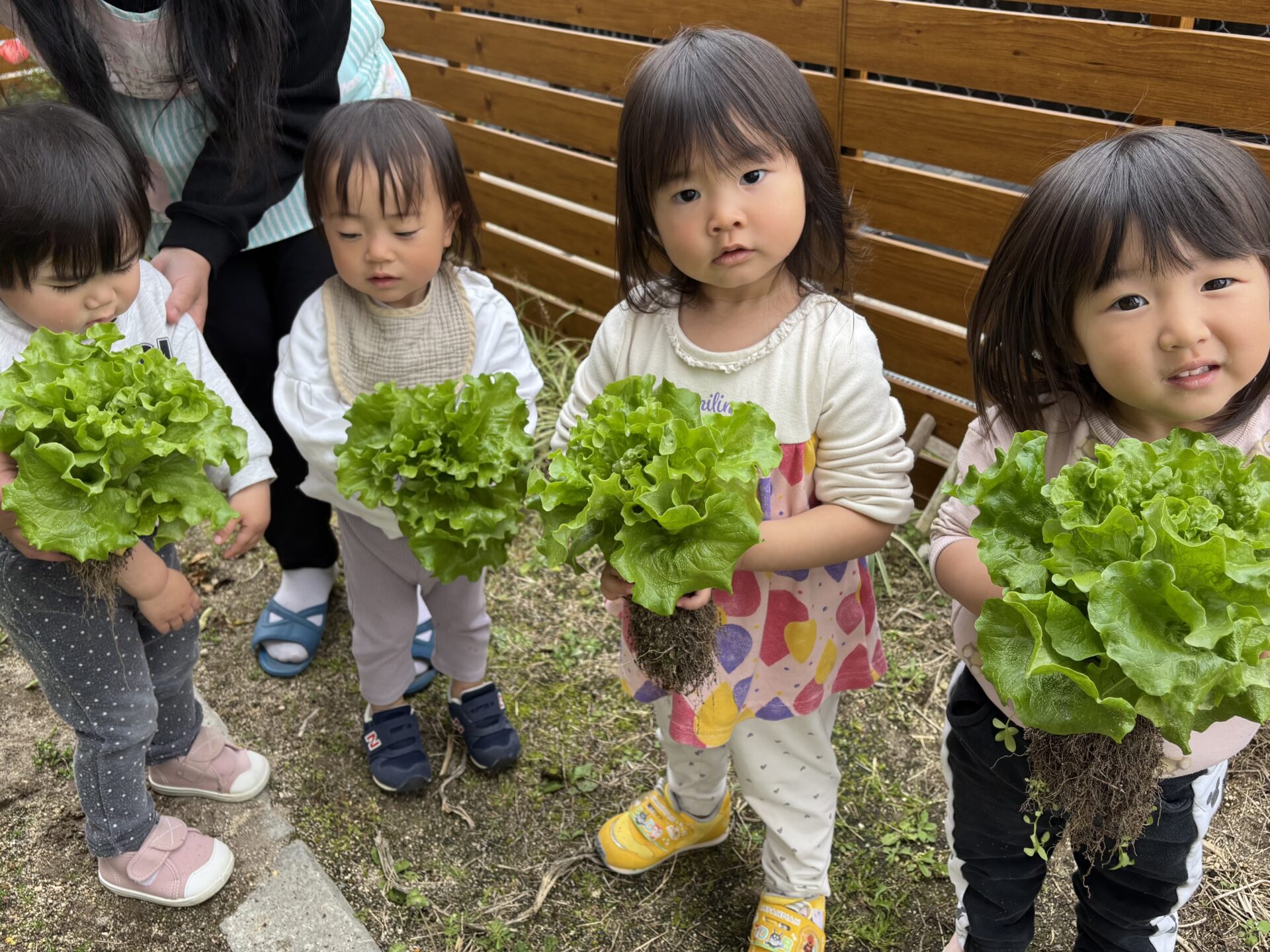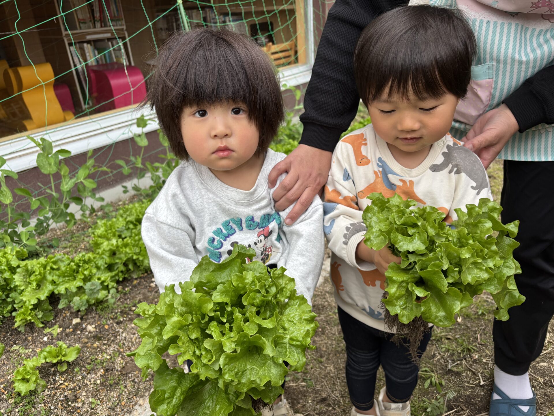 小さかった“サニーレタス”も暖かい陽気に誘われて…ぐんぐん生長しました🌱園児たちは、種まきの様子を見てはやく大きくなるのを楽しみにしていました☺時々…テラスから覗いては、裏の畑を観察していました🥬野菜を収穫しに行く話をすると…みんなやる気満々✨株元を両手でしっかりと持って…“うんとこしょ♪どっこいしょ♪”抜けると満足した笑顔が広がりました☺