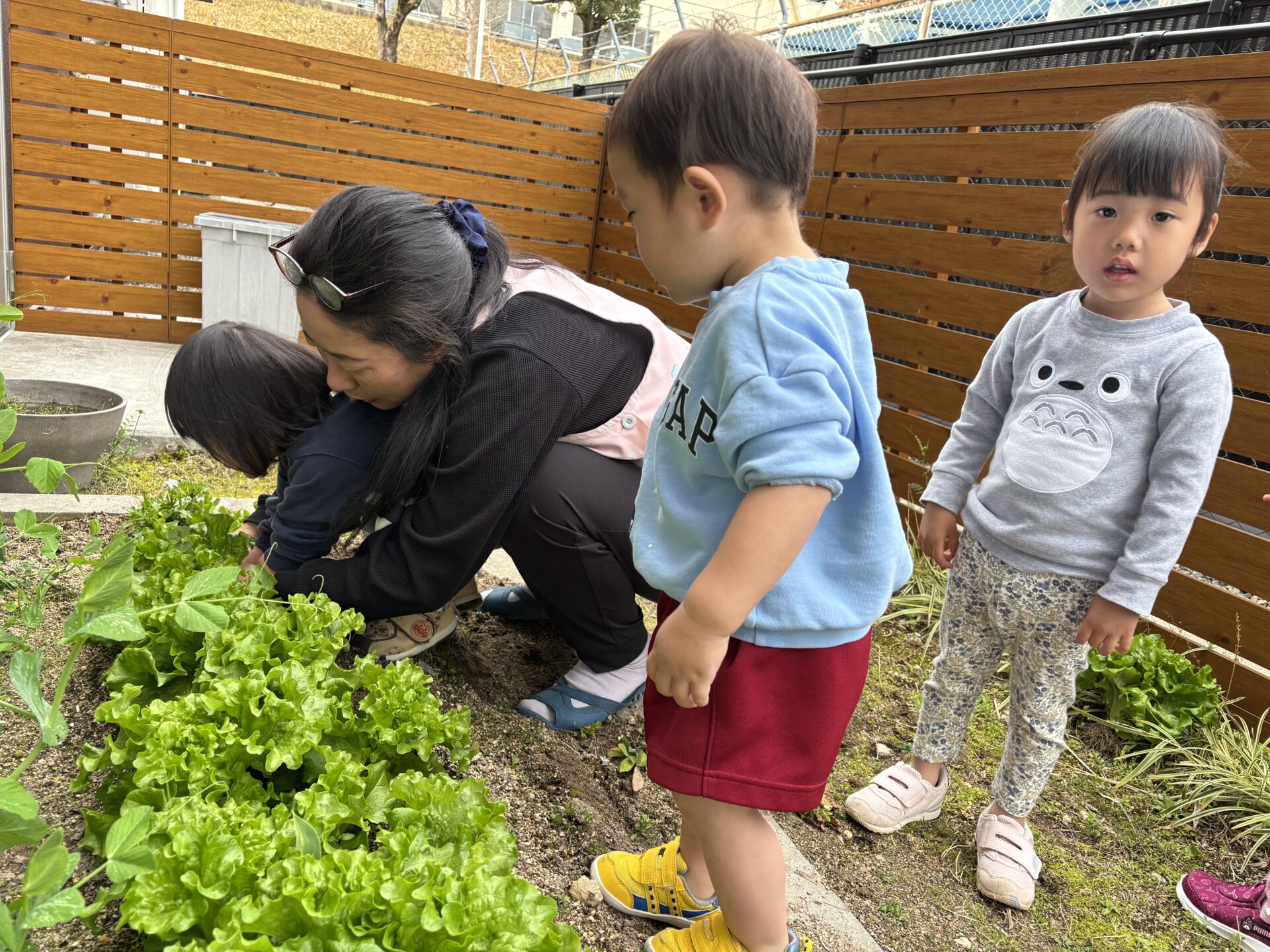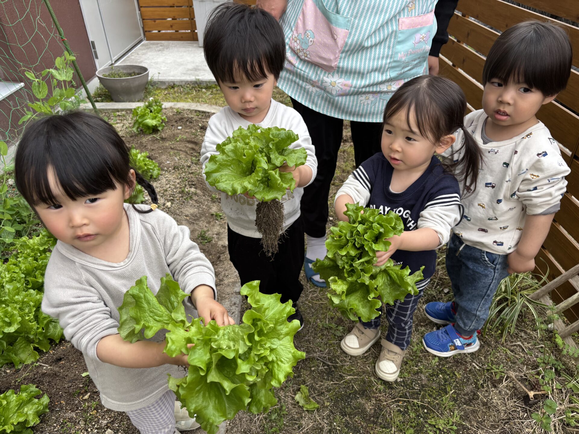 小さかった“サニーレタス”も暖かい陽気に誘われて…ぐんぐん生長しました🌱園児たちは、種まきの様子を見てはやく大きくなるのを楽しみにしていました☺時々…テラスから覗いては、裏の畑を観察していました🥬野菜を収穫しに行く話をすると…みんなやる気満々✨株元を両手でしっかりと持って…“うんとこしょ♪どっこいしょ♪”抜けると満足した笑顔が広がりました☺